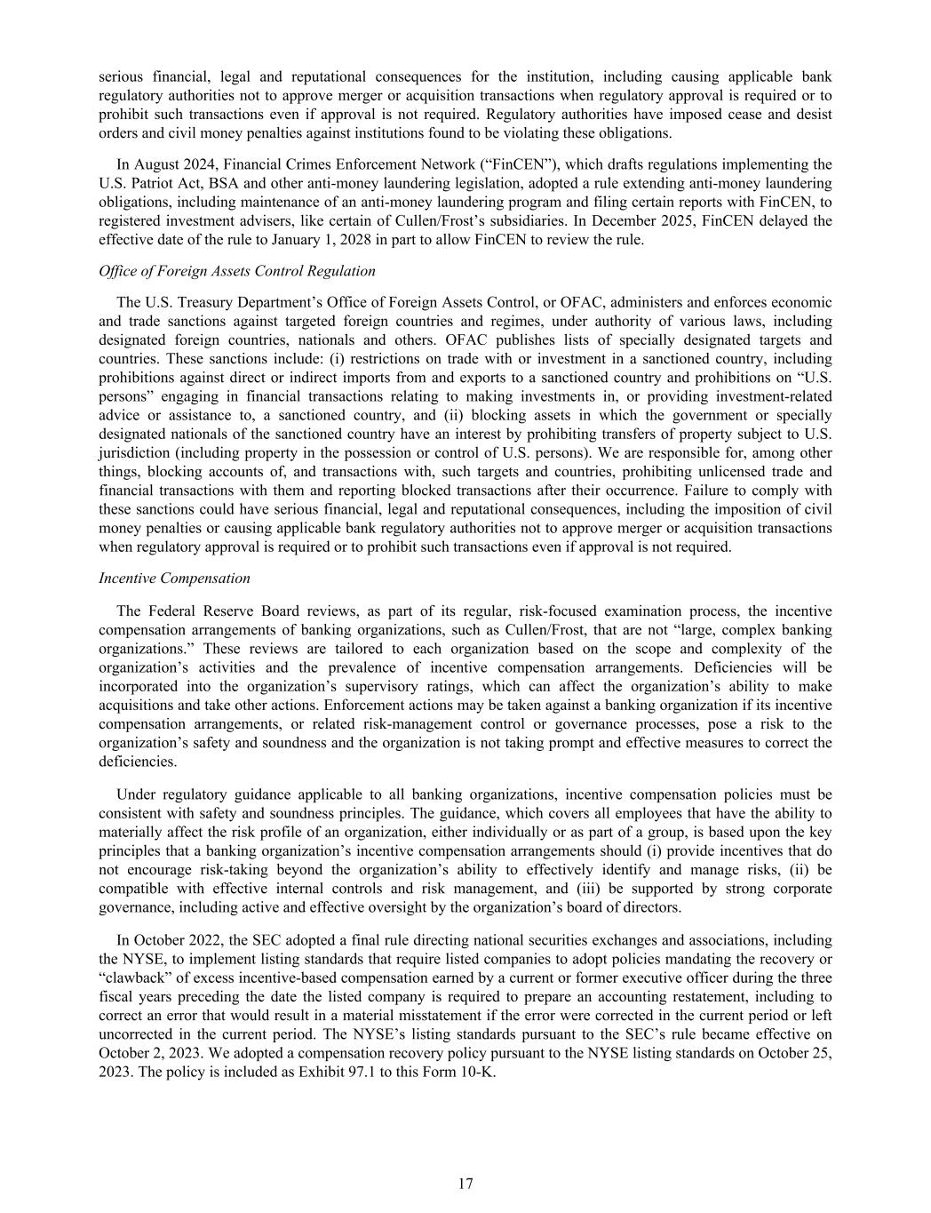 serious financial, legal and reputational consequences for the institution, including causing applicable bank regulatory authorities not to approve merger or acquisition transactions when regulatory approval is required or to prohibit such transactions even if approval is not required. Regulatory authorities have imposed cease and desist orders and civil money penalties against institutions found to be violating these obligations. In August 2024, Financial Crimes Enforcement Network (“FinCEN”), which drafts regulations implementing the U.S. Patriot Act, BSA and other anti-money laundering legislation, adopted a rule extending anti-money laundering obligations, including maintenance of an anti-money laundering program and filing certain reports with FinCEN, to registered investment advisers, like certain of Cullen/Frost’s subsidiaries. In December 2025, FinCEN delayed the effective date of the rule to January 1, 2028 in part to allow FinCEN to review the rule. Office of Foreign Assets Control Regulation The U.S. Treasury Department’s Office of Foreign Assets Control, or OFAC, administers and enforces economic and trade sanctions against targeted foreign countries and regimes, under authority of various laws, including designated foreign countries, nationals and others. OFAC publishes lists of specially designated targets and countries. These sanctions include: (i) restrictions on trade with or investment in a sanctioned country, including prohibitions against direct or indirect imports from and exports to a sanctioned country and prohibitions on “U.S. persons” engaging in financial transactions relating to making investments in, or providing investment-related advice or assistance to, a sanctioned country, and (ii) blocking assets in which the government or specially designated nationals of the sanctioned country have an interest by prohibiting transfers of property subject to U.S. jurisdiction (including property in the possession or control of U.S. persons). We are responsible for, among other things, blocking accounts of, and transactions with, such targets and countries, prohibiting unlicensed trade and financial transactions with them and reporting blocked transactions after their occurrence. Failure to comply with these sanctions could have serious financial, legal and reputational consequences, including the imposition of civil money penalties or causing applicable bank regulatory authorities not to approve merger or acquisition transactions when regulatory approval is required or to prohibit such transactions even if approval is not required. Incentive Compensation The Federal Reserve Board reviews, as part of its regular, risk-focused examination process, the incentive compensation arrangements of banking organizations, such as Cullen/Frost, that are not “large, complex banking organizations.” These reviews are tailored to each organization based on the scope and complexity of the organization’s activities and the prevalence of incentive compensation arrangements. Deficiencies will be incorporated into the organization’s supervisory ratings, which can affect the organization’s ability to make acquisitions and take other actions. Enforcement actions may be taken against a banking organization if its incentive compensation arrangements, or related risk-management control or governance processes, pose a risk to the organization’s safety and soundness and the organization is not taking prompt and effective measures to correct the deficiencies. Under regulatory guidance applicable to all banking organizations, incentive compensation policies must be consistent with safety and soundness principles. The guidance, which covers all employees that have the ability to materially affect the risk profile of an organization, either individually or as part of a group, is based upon the key principles that a banking organization’s incentive compensation arrangements should (i) provide incentives that do not encourage risk-taking beyond the organization’s ability to effectively identify and manage risks, (ii) be compatible with effective internal controls and risk management, and (iii) be supported by strong corporate governance, including active and effective oversight by the organization’s board of directors. In October 2022, the SEC adopted a final rule directing national securities exchanges and associations, including the NYSE, to implement listing standards that require listed companies to adopt policies mandating the recovery or “clawback” of excess incentive-based compensation earned by a current or former executive officer during the three fiscal years preceding the date the listed company is required to prepare an accounting restatement, including to correct an error that would result in a material misstatement if the error were corrected in the current period or left uncorrected in the current period. The NYSE’s listing standards pursuant to the SEC’s rule became effective on October 2, 2023. We adopted a compensation recovery policy pursuant to the NYSE listing standards on October 25, 2023. The policy is included as Exhibit 97.1 to this Form 10-K. 17