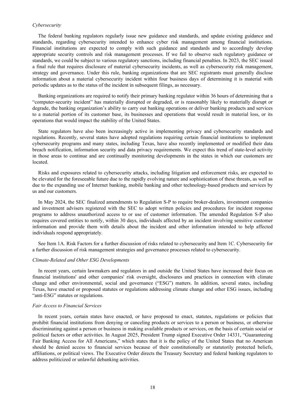 Cybersecurity The federal banking regulators regularly issue new guidance and standards, and update existing guidance and standards, regarding cybersecurity intended to enhance cyber risk management among financial institutions. Financial institutions are expected to comply with such guidance and standards and to accordingly develop appropriate security controls and risk management processes. If we fail to observe such regulatory guidance or standards, we could be subject to various regulatory sanctions, including financial penalties. In 2023, the SEC issued a final rule that requires disclosure of material cybersecurity incidents, as well as cybersecurity risk management, strategy and governance. Under this rule, banking organizations that are SEC registrants must generally disclose information about a material cybersecurity incident within four business days of determining it is material with periodic updates as to the status of the incident in subsequent filings, as necessary. Banking organizations are required to notify their primary banking regulator within 36 hours of determining that a “computer-security incident” has materially disrupted or degraded, or is reasonably likely to materially disrupt or degrade, the banking organization’s ability to carry out banking operations or deliver banking products and services to a material portion of its customer base, its businesses and operations that would result in material loss, or its operations that would impact the stability of the United States. State regulators have also been increasingly active in implementing privacy and cybersecurity standards and regulations. Recently, several states have adopted regulations requiring certain financial institutions to implement cybersecurity programs and many states, including Texas, have also recently implemented or modified their data breach notification, information security and data privacy requirements. We expect this trend of state-level activity in those areas to continue and are continually monitoring developments in the states in which our customers are located. Risks and exposures related to cybersecurity attacks, including litigation and enforcement risks, are expected to be elevated for the foreseeable future due to the rapidly evolving nature and sophistication of these threats, as well as due to the expanding use of Internet banking, mobile banking and other technology-based products and services by us and our customers. In May 2024, the SEC finalized amendments to Regulation S-P to require broker-dealers, investment companies and investment advisers registered with the SEC to adopt written policies and procedures for incident response programs to address unauthorized access to or use of customer information. The amended Regulation S-P also requires covered entities to notify, within 30 days, individuals affected by an incident involving sensitive customer information and provide them with details about the incident and other information intended to help affected individuals respond appropriately. See Item 1A. Risk Factors for a further discussion of risks related to cybersecurity and Item 1C. Cybersecurity for a further discussion of risk management strategies and governance processes related to cybersecurity. Climate-Related and Other ESG Developments In recent years, certain lawmakers and regulators in and outside the United States have increased their focus on financial institutions' and other companies' risk oversight, disclosures and practices in connection with climate change and other environmental, social and governance (“ESG”) matters. In addition, several states, including Texas, have enacted or proposed statutes or regulations addressing climate change and other ESG issues, including “anti-ESG” statutes or regulations. Fair Access to Financial Services In recent years, certain states have enacted, or have proposed to enact, statutes, regulations or policies that prohibit financial institutions from denying or canceling products or services to a person or business, or otherwise discriminating against a person or business in making available products or services, on the basis of certain social or political factors or other activities. In August 2025, President Trump signed Executive Order 14331, “Guaranteeing Fair Banking Access for All Americans,” which states that it is the policy of the United States that no American should be denied access to financial services because of their constitutionally or statutorily protected beliefs, affiliations, or political views. The Executive Order directs the Treasury Secretary and federal banking regulators to address politicized or unlawful debanking activities. 18