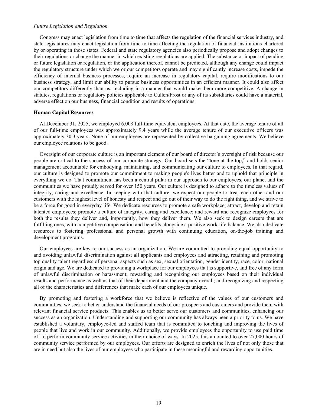 Future Legislation and Regulation Congress may enact legislation from time to time that affects the regulation of the financial services industry, and state legislatures may enact legislation from time to time affecting the regulation of financial institutions chartered by or operating in those states. Federal and state regulatory agencies also periodically propose and adopt changes to their regulations or change the manner in which existing regulations are applied. The substance or impact of pending or future legislation or regulation, or the application thereof, cannot be predicted, although any change could impact the regulatory structure under which we or our competitors operate and may significantly increase costs, impede the efficiency of internal business processes, require an increase in regulatory capital, require modifications to our business strategy, and limit our ability to pursue business opportunities in an efficient manner. It could also affect our competitors differently than us, including in a manner that would make them more competitive. A change in statutes, regulations or regulatory policies applicable to Cullen/Frost or any of its subsidiaries could have a material, adverse effect on our business, financial condition and results of operations. Human Capital Resources At December 31, 2025, we employed 6,008 full-time equivalent employees. At that date, the average tenure of all of our full-time employees was approximately 9.4 years while the average tenure of our executive officers was approximately 30.3 years. None of our employees are represented by collective bargaining agreements. We believe our employee relations to be good. Oversight of our corporate culture is an important element of our board of director’s oversight of risk because our people are critical to the success of our corporate strategy. Our board sets the “tone at the top,” and holds senior management accountable for embodying, maintaining, and communicating our culture to employees. In that regard, our culture is designed to promote our commitment to making people's lives better and to uphold that principle in everything we do. That commitment has been a central pillar in our approach to our employees, our planet and the communities we have proudly served for over 150 years. Our culture is designed to adhere to the timeless values of integrity, caring and excellence. In keeping with that culture, we expect our people to treat each other and our customers with the highest level of honesty and respect and go out of their way to do the right thing, and we strive to be a force for good in everyday life. We dedicate resources to promote a safe workplace; attract, develop and retain talented employees; promote a culture of integrity, caring and excellence; and reward and recognize employees for both the results they deliver and, importantly, how they deliver them. We also seek to design careers that are fulfilling ones, with competitive compensation and benefits alongside a positive work-life balance. We also dedicate resources to fostering professional and personal growth with continuing education, on-the-job training and development programs. Our employees are key to our success as an organization. We are committed to providing equal opportunity to and avoiding unlawful discrimination against all applicants and employees and attracting, retaining and promoting top quality talent regardless of personal aspects such as sex, sexual orientation, gender identity, race, color, national origin and age. We are dedicated to providing a workplace for our employees that is supportive, and free of any form of unlawful discrimination or harassment; rewarding and recognizing our employees based on their individual results and performance as well as that of their department and the company overall; and recognizing and respecting all of the characteristics and differences that make each of our employees unique. By promoting and fostering a workforce that we believe is reflective of the values of our customers and communities, we seek to better understand the financial needs of our prospects and customers and provide them with relevant financial service products. This enables us to better serve our customers and communities, enhancing our success as an organization. Understanding and supporting our community has always been a priority to us. We have established a voluntary, employee-led and staffed team that is committed to touching and improving the lives of people that live and work in our community. Additionally, we provide employees the opportunity to use paid time off to perform community service activities in their choice of ways. In 2025, this amounted to over 27,000 hours of community service performed by our employees. Our efforts are designed to enrich the lives of not only those that are in need but also the lives of our employees who participate in these meaningful and rewarding opportunities. 19