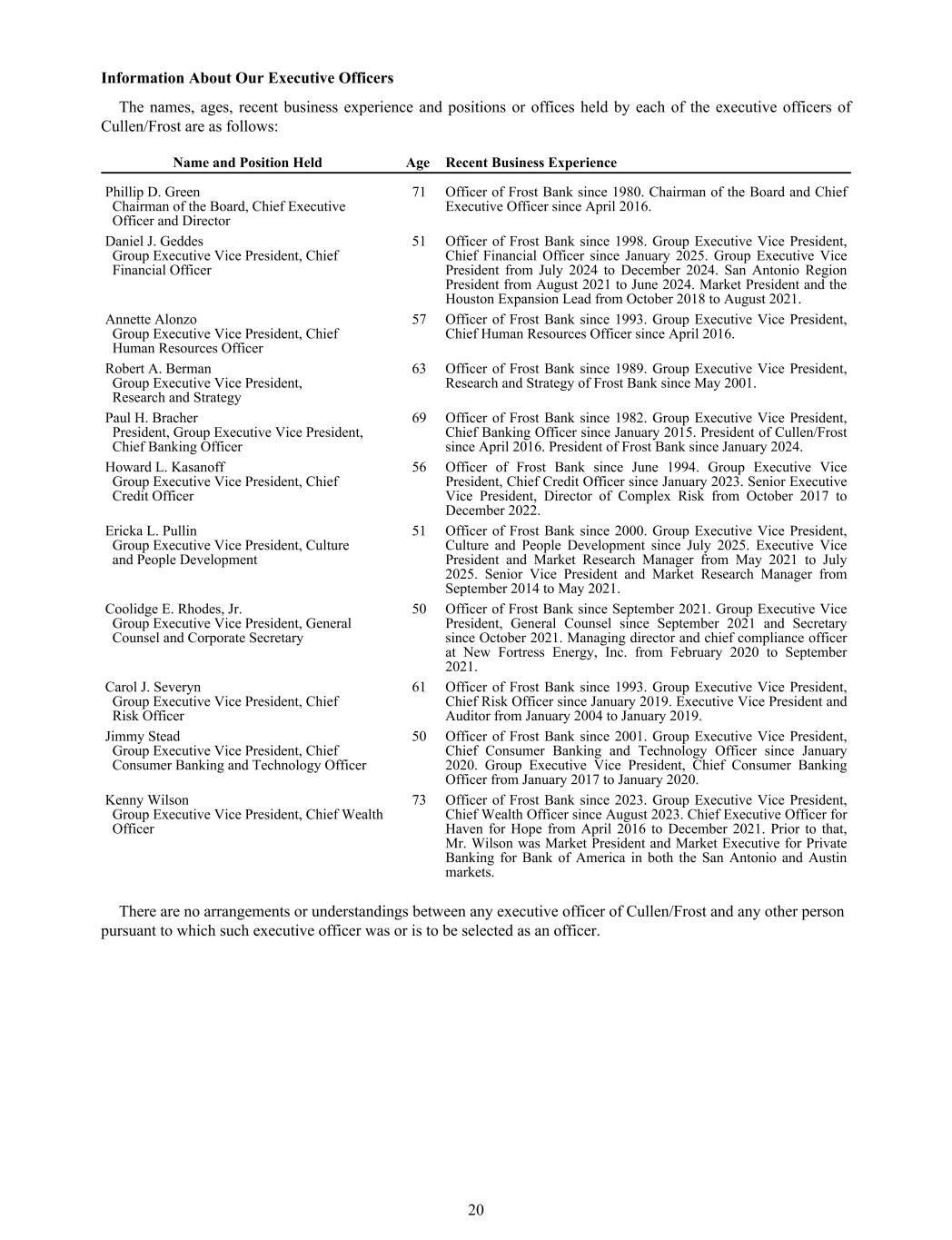 Information About Our Executive Officers The names, ages, recent business experience and positions or offices held by each of the executive officers of Cullen/Frost are as follows: Name and Position Held Age Recent Business Experience Phillip D. Green Chairman of the Board, Chief Executive Officer and Director 71 Officer of Frost Bank since 1980. Chairman of the Board and Chief Executive Officer since April 2016. Daniel J. Geddes Group Executive Vice President, Chief Financial Officer 51 Officer of Frost Bank since 1998. Group Executive Vice President, Chief Financial Officer since January 2025. Group Executive Vice President from July 2024 to December 2024. San Antonio Region President from August 2021 to June 2024. Market President and the Houston Expansion Lead from October 2018 to August 2021. Annette Alonzo Group Executive Vice President, Chief Human Resources Officer 57 Officer of Frost Bank since 1993. Group Executive Vice President, Chief Human Resources Officer since April 2016. Robert A. Berman Group Executive Vice President, Research and Strategy 63 Officer of Frost Bank since 1989. Group Executive Vice President, Research and Strategy of Frost Bank since May 2001. Paul H. Bracher President, Group Executive Vice President, Chief Banking Officer 69 Officer of Frost Bank since 1982. Group Executive Vice President, Chief Banking Officer since January 2015. President of Cullen/Frost since April 2016. President of Frost Bank since January 2024. Howard L. Kasanoff Group Executive Vice President, Chief Credit Officer 56 Officer of Frost Bank since June 1994. Group Executive Vice President, Chief Credit Officer since January 2023. Senior Executive Vice President, Director of Complex Risk from October 2017 to December 2022. Ericka L. Pullin Group Executive Vice President, Culture and People Development 51 Officer of Frost Bank since 2000. Group Executive Vice President, Culture and People Development since July 2025. Executive Vice President and Market Research Manager from May 2021 to July 2025. Senior Vice President and Market Research Manager from September 2014 to May 2021. Coolidge E. Rhodes, Jr. Group Executive Vice President, General Counsel and Corporate Secretary 50 Officer of Frost Bank since September 2021. Group Executive Vice President, General Counsel since September 2021 and Secretary since October 2021. Managing director and chief compliance officer at New Fortress Energy, Inc. from February 2020 to September 2021. Carol J. Severyn Group Executive Vice President, Chief Risk Officer 61 Officer of Frost Bank since 1993. Group Executive Vice President, Chief Risk Officer since January 2019. Executive Vice President and Auditor from January 2004 to January 2019. Jimmy Stead Group Executive Vice President, Chief Consumer Banking and Technology Officer 50 Officer of Frost Bank since 2001. Group Executive Vice President, Chief Consumer Banking and Technology Officer since January 2020. Group Executive Vice President, Chief Consumer Banking Officer from January 2017 to January 2020. Kenny Wilson Group Executive Vice President, Chief Wealth Officer 73 Officer of Frost Bank since 2023. Group Executive Vice President, Chief Wealth Officer since August 2023. Chief Executive Officer for Haven for Hope from April 2016 to December 2021. Prior to that, Mr. Wilson was Market President and Market Executive for Private Banking for Bank of America in both the San Antonio and Austin markets. There are no arrangements or understandings between any executive officer of Cullen/Frost and any other person pursuant to which such executive officer was or is to be selected as an officer. 20