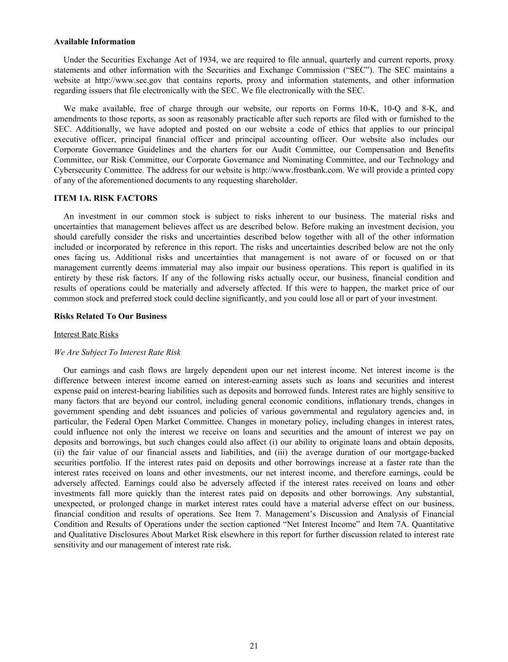 Available Information Under the Securities Exchange Act of 1934, we are required to file annual, quarterly and current reports, proxy statements and other information with the Securities and Exchange Commission (“SEC”). The SEC maintains a website at http://www.sec.gov that contains reports, proxy and information statements, and other information regarding issuers that file electronically with the SEC. We file electronically with the SEC. We make available, free of charge through our website, our reports on Forms 10-K, 10-Q and 8-K, and amendments to those reports, as soon as reasonably practicable after such reports are filed with or furnished to the SEC. Additionally, we have adopted and posted on our website a code of ethics that applies to our principal executive officer, principal financial officer and principal accounting officer. Our website also includes our Corporate Governance Guidelines and the charters for our Audit Committee, our Compensation and Benefits Committee, our Risk Committee, our Corporate Governance and Nominating Committee, and our Technology and Cybersecurity Committee. The address for our website is http://www.frostbank.com. We will provide a printed copy of any of the aforementioned documents to any requesting shareholder. ITEM 1A. RISK FACTORS An investment in our common stock is subject to risks inherent to our business. The material risks and uncertainties that management believes affect us are described below. Before making an investment decision, you should carefully consider the risks and uncertainties described below together with all of the other information included or incorporated by reference in this report. The risks and uncertainties described below are not the only ones facing us. Additional risks and uncertainties that management is not aware of or focused on or that management currently deems immaterial may also impair our business operations. This report is qualified in its entirety by these risk factors. If any of the following risks actually occur, our business, financial condition and results of operations could be materially and adversely affected. If this were to happen, the market price of our common stock and preferred stock could decline significantly, and you could lose all or part of your investment. Risks Related To Our Business Interest Rate Risks We Are Subject To Interest Rate Risk Our earnings and cash flows are largely dependent upon our net interest income. Net interest income is the difference between interest income earned on interest-earning assets such as loans and securities and interest expense paid on interest-bearing liabilities such as deposits and borrowed funds. Interest rates are highly sensitive to many factors that are beyond our control, including general economic conditions, inflationary trends, changes in government spending and debt issuances and policies of various governmental and regulatory agencies and, in particular, the Federal Open Market Committee. Changes in monetary policy, including changes in interest rates, could influence not only the interest we receive on loans and securities and the amount of interest we pay on deposits and borrowings, but such changes could also affect (i) our ability to originate loans and obtain deposits, (ii) the fair value of our financial assets and liabilities, and (iii) the average duration of our mortgage-backed securities portfolio. If the interest rates paid on deposits and other borrowings increase at a faster rate than the interest rates received on loans and other investments, our net interest income, and therefore earnings, could be adversely affected. Earnings could also be adversely affected if the interest rates received on loans and other investments fall more quickly than the interest rates paid on deposits and other borrowings. Any substantial, unexpected, or prolonged change in market interest rates could have a material adverse effect on our business, financial condition and results of operations. See Item 7. Management’s Discussion and Analysis of Financial Condition and Results of Operations under the section captioned “Net Interest Income” and Item 7A. Quantitative and Qualitative Disclosures About Market Risk elsewhere in this report for further discussion related to interest rate sensitivity and our management of interest rate risk. 21