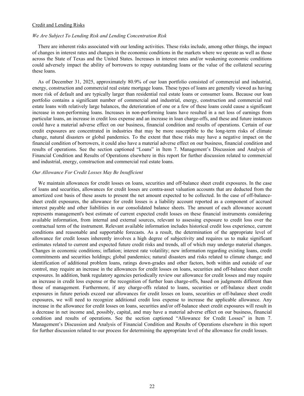 Credit and Lending Risks We Are Subject To Lending Risk and Lending Concentration Risk There are inherent risks associated with our lending activities. These risks include, among other things, the impact of changes in interest rates and changes in the economic conditions in the markets where we operate as well as those across the State of Texas and the United States. Increases in interest rates and/or weakening economic conditions could adversely impact the ability of borrowers to repay outstanding loans or the value of the collateral securing these loans. As of December 31, 2025, approximately 80.9% of our loan portfolio consisted of commercial and industrial, energy, construction and commercial real estate mortgage loans. These types of loans are generally viewed as having more risk of default and are typically larger than residential real estate loans or consumer loans. Because our loan portfolio contains a significant number of commercial and industrial, energy, construction and commercial real estate loans with relatively large balances, the deterioration of one or a few of these loans could cause a significant increase in non-performing loans. Increases in non-performing loans have resulted in a net loss of earnings from particular loans, an increase in credit loss expense and an increase in loan charge-offs, and these and future instances could have a material adverse effect on our business, financial condition and results of operations. Certain of our credit exposures are concentrated in industries that may be more susceptible to the long-term risks of climate change, natural disasters or global pandemics. To the extent that these risks may have a negative impact on the financial condition of borrowers, it could also have a material adverse effect on our business, financial condition and results of operations. See the section captioned “Loans” in Item 7. Management’s Discussion and Analysis of Financial Condition and Results of Operations elsewhere in this report for further discussion related to commercial and industrial, energy, construction and commercial real estate loans. Our Allowance For Credit Losses May Be Insufficient We maintain allowances for credit losses on loans, securities and off-balance sheet credit exposures. In the case of loans and securities, allowances for credit losses are contra-asset valuation accounts that are deducted from the amortized cost basis of these assets to present the net amount expected to be collected. In the case of off-balance- sheet credit exposures, the allowance for credit losses is a liability account reported as a component of accrued interest payable and other liabilities in our consolidated balance sheets. The amount of each allowance account represents management's best estimate of current expected credit losses on these financial instruments considering available information, from internal and external sources, relevant to assessing exposure to credit loss over the contractual term of the instrument. Relevant available information includes historical credit loss experience, current conditions and reasonable and supportable forecasts. As a result, the determination of the appropriate level of allowance for credit losses inherently involves a high degree of subjectivity and requires us to make significant estimates related to current and expected future credit risks and trends, all of which may undergo material changes. Changes in economic conditions; inflation; interest rate volatility; new information regarding existing loans, credit commitments and securities holdings; global pandemics; natural disasters and risks related to climate change; and identification of additional problem loans, ratings down-grades and other factors, both within and outside of our control, may require an increase in the allowances for credit losses on loans, securities and off-balance sheet credit exposures. In addition, bank regulatory agencies periodically review our allowance for credit losses and may require an increase in credit loss expense or the recognition of further loan charge-offs, based on judgments different than those of management. Furthermore, if any charge-offs related to loans, securities or off-balance sheet credit exposures in future periods exceed our allowances for credit losses on loans, securities or off-balance sheet credit exposures, we will need to recognize additional credit loss expense to increase the applicable allowance. Any increase in the allowance for credit losses on loans, securities and/or off-balance sheet credit exposures will result in a decrease in net income and, possibly, capital, and may have a material adverse effect on our business, financial condition and results of operations. See the section captioned “Allowance for Credit Losses” in Item 7. Management’s Discussion and Analysis of Financial Condition and Results of Operations elsewhere in this report for further discussion related to our process for determining the appropriate level of the allowance for credit losses. 22
