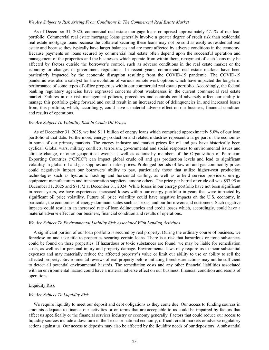 We Are Subject to Risk Arising From Conditions In The Commercial Real Estate Market As of December 31, 2025, commercial real estate mortgage loans comprised approximately 47.1% of our loan portfolio. Commercial real estate mortgage loans generally involve a greater degree of credit risk than residential real estate mortgage loans because the collateral securing these loans may not be sold as easily as residential real estate and because they typically have larger balances and are more affected by adverse conditions in the economy. Because payments on loans secured by commercial real estate often depend upon the successful operation and management of the properties and the businesses which operate from within them, repayment of such loans may be affected by factors outside the borrower’s control, such as adverse conditions in the real estate market or the economy or changes in government regulations. In recent years, commercial real estate markets have been particularly impacted by the economic disruption resulting from the COVID-19 pandemic. The COVID-19 pandemic was also a catalyst for the evolution of various remote work options which have impacted the long-term performance of some types of office properties within our commercial real estate portfolio. Accordingly, the federal banking regulatory agencies have expressed concerns about weaknesses in the current commercial real estate market. Failures in our risk management policies, procedures and controls could adversely affect our ability to manage this portfolio going forward and could result in an increased rate of delinquencies in, and increased losses from, this portfolio, which, accordingly, could have a material adverse effect on our business, financial condition and results of operations. We Are Subject To Volatility Risk In Crude Oil Prices As of December 31, 2025, we had $1.1 billion of energy loans which comprised approximately 5.0% of our loan portfolio at that date. Furthermore, energy production and related industries represent a large part of the economies in some of our primary markets. The energy industry and market prices for oil and gas have historically been cyclical. Global wars, military conflicts, terrorism, governmental and social responses to environmental issues and climate change, or other geopolitical events as well as actions by members of the Organization of Petroleum Exporting Countries (“OPEC”) can impact global crude oil and gas production levels and lead to significant volatility in global oil and gas supplies and market prices. Prolonged periods of low oil and gas commodity prices could negatively impact our borrowers' ability to pay, particularly those that utilize higher-cost production technologies such as hydraulic fracking and horizontal drilling, as well as oilfield service providers, energy equipment manufacturers and transportation suppliers, among others. The price per barrel of crude oil was $57.95 at December 31, 2025 and $71.72 at December 31, 2024. While losses in our energy portfolio have not been significant in recent years, we have experienced increased losses within our energy portfolio in years that were impacted by significant oil price volatility. Future oil price volatility could have negative impacts on the U.S. economy, in particular, the economies of energy-dominant states such as Texas, and our borrowers and customers. Such negative impacts could result in an increased rate of loan delinquencies and credit losses which, accordingly, could have a material adverse effect on our business, financial condition and results of operations. We Are Subject To Environmental Liability Risk Associated With Lending Activities A significant portion of our loan portfolio is secured by real property. During the ordinary course of business, we foreclose on and take title to properties securing certain loans. There is a risk that hazardous or toxic substances could be found on these properties. If hazardous or toxic substances are found, we may be liable for remediation costs, as well as for personal injury and property damage. Environmental laws may require us to incur substantial expenses and may materially reduce the affected property’s value or limit our ability to use or ability to sell the affected property. Environmental reviews of real property before initiating foreclosure actions may not be sufficient to detect all potential environmental hazards. The remediation costs and any other financial liabilities associated with an environmental hazard could have a material adverse effect on our business, financial condition and results of operations. Liquidity Risk We Are Subject To Liquidity Risk We require liquidity to meet our deposit and debt obligations as they come due. Our access to funding sources in amounts adequate to finance our activities or on terms that are acceptable to us could be impaired by factors that affect us specifically or the financial services industry or economy generally. Factors that could reduce our access to liquidity sources include a downturn in the Texas or national economy, difficult credit markets or adverse regulatory actions against us. Our access to deposits may also be affected by the liquidity needs of our depositors. A substantial 23