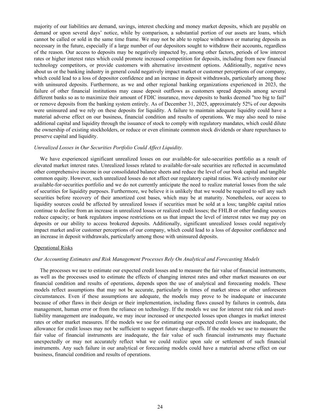 majority of our liabilities are demand, savings, interest checking and money market deposits, which are payable on demand or upon several days’ notice, while by comparison, a substantial portion of our assets are loans, which cannot be called or sold in the same time frame. We may not be able to replace withdrawn or maturing deposits as necessary in the future, especially if a large number of our depositors sought to withdraw their accounts, regardless of the reason. Our access to deposits may be negatively impacted by, among other factors, periods of low interest rates or higher interest rates which could promote increased competition for deposits, including from new financial technology competitors, or provide customers with alternative investment options. Additionally, negative news about us or the banking industry in general could negatively impact market or customer perceptions of our company, which could lead to a loss of depositor confidence and an increase in deposit withdrawals, particularly among those with uninsured deposits. Furthermore, as we and other regional banking organizations experienced in 2023, the failure of other financial institutions may cause deposit outflows as customers spread deposits among several different banks so as to maximize their amount of FDIC insurance, move deposits to banks deemed "too big to fail" or remove deposits from the banking system entirely. As of December 31, 2025, approximately 52% of our deposits were uninsured and we rely on these deposits for liquidity. A failure to maintain adequate liquidity could have a material adverse effect on our business, financial condition and results of operations. We may also need to raise additional capital and liquidity through the issuance of stock to comply with regulatory mandates, which could dilute the ownership of existing stockholders, or reduce or even eliminate common stock dividends or share repurchases to preserve capital and liquidity. Unrealized Losses in Our Securities Portfolio Could Affect Liquidity. We have experienced significant unrealized losses on our available-for sale-securities portfolio as a result of elevated market interest rates. Unrealized losses related to available-for-sale securities are reflected in accumulated other comprehensive income in our consolidated balance sheets and reduce the level of our book capital and tangible common equity. However, such unrealized losses do not affect our regulatory capital ratios. We actively monitor our available-for-securities portfolio and we do not currently anticipate the need to realize material losses from the sale of securities for liquidity purposes. Furthermore, we believe it is unlikely that we would be required to sell any such securities before recovery of their amortized cost bases, which may be at maturity. Nonetheless, our access to liquidity sources could be affected by unrealized losses if securities must be sold at a loss; tangible capital ratios continue to decline from an increase in unrealized losses or realized credit losses; the FHLB or other funding sources reduce capacity; or bank regulators impose restrictions on us that impact the level of interest rates we may pay on deposits or our ability to access brokered deposits. Additionally, significant unrealized losses could negatively impact market and/or customer perceptions of our company, which could lead to a loss of depositor confidence and an increase in deposit withdrawals, particularly among those with uninsured deposits. Operational Risks Our Accounting Estimates and Risk Management Processes Rely On Analytical and Forecasting Models The processes we use to estimate our expected credit losses and to measure the fair value of financial instruments, as well as the processes used to estimate the effects of changing interest rates and other market measures on our financial condition and results of operations, depends upon the use of analytical and forecasting models. These models reflect assumptions that may not be accurate, particularly in times of market stress or other unforeseen circumstances. Even if these assumptions are adequate, the models may prove to be inadequate or inaccurate because of other flaws in their design or their implementation, including flaws caused by failures in controls, data management, human error or from the reliance on technology. If the models we use for interest rate risk and asset- liability management are inadequate, we may incur increased or unexpected losses upon changes in market interest rates or other market measures. If the models we use for estimating our expected credit losses are inadequate, the allowance for credit losses may not be sufficient to support future charge-offs. If the models we use to measure the fair value of financial instruments are inadequate, the fair value of such financial instruments may fluctuate unexpectedly or may not accurately reflect what we could realize upon sale or settlement of such financial instruments. Any such failure in our analytical or forecasting models could have a material adverse effect on our business, financial condition and results of operations. 24