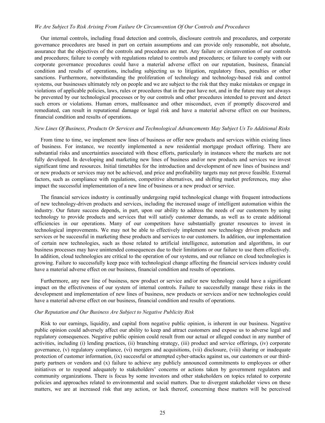 We Are Subject To Risk Arising From Failure Or Circumvention Of Our Controls and Procedures Our internal controls, including fraud detection and controls, disclosure controls and procedures, and corporate governance procedures are based in part on certain assumptions and can provide only reasonable, not absolute, assurance that the objectives of the controls and procedures are met. Any failure or circumvention of our controls and procedures; failure to comply with regulations related to controls and procedures; or failure to comply with our corporate governance procedures could have a material adverse effect on our reputation, business, financial condition and results of operations, including subjecting us to litigation, regulatory fines, penalties or other sanctions. Furthermore, notwithstanding the proliferation of technology and technology-based risk and control systems, our businesses ultimately rely on people and we are subject to the risk that they make mistakes or engage in violations of applicable policies, laws, rules or procedures that in the past have not, and in the future may not always be prevented by our technological processes or by our controls and other procedures intended to prevent and detect such errors or violations. Human errors, malfeasance and other misconduct, even if promptly discovered and remediated, can result in reputational damage or legal risk and have a material adverse effect on our business, financial condition and results of operations. New Lines Of Business, Products Or Services and Technological Advancements May Subject Us To Additional Risks From time to time, we implement new lines of business or offer new products and services within existing lines of business. For instance, we recently implemented a new residential mortgage product offering. There are substantial risks and uncertainties associated with these efforts, particularly in instances where the markets are not fully developed. In developing and marketing new lines of business and/or new products and services we invest significant time and resources. Initial timetables for the introduction and development of new lines of business and/ or new products or services may not be achieved, and price and profitability targets may not prove feasible. External factors, such as compliance with regulations, competitive alternatives, and shifting market preferences, may also impact the successful implementation of a new line of business or a new product or service. The financial services industry is continually undergoing rapid technological change with frequent introductions of new technology-driven products and services, including the increased usage of intelligent automation within the industry. Our future success depends, in part, upon our ability to address the needs of our customers by using technology to provide products and services that will satisfy customer demands, as well as to create additional efficiencies in our operations. Many of our competitors have substantially greater resources to invest in technological improvements. We may not be able to effectively implement new technology driven products and services or be successful in marketing these products and services to our customers. In addition, our implementation of certain new technologies, such as those related to artificial intelligence, automation and algorithms, in our business processes may have unintended consequences due to their limitations or our failure to use them effectively. In addition, cloud technologies are critical to the operation of our systems, and our reliance on cloud technologies is growing. Failure to successfully keep pace with technological change affecting the financial services industry could have a material adverse effect on our business, financial condition and results of operations. Furthermore, any new line of business, new product or service and/or new technology could have a significant impact on the effectiveness of our system of internal controls. Failure to successfully manage these risks in the development and implementation of new lines of business, new products or services and/or new technologies could have a material adverse effect on our business, financial condition and results of operations. Our Reputation and Our Business Are Subject to Negative Publicity Risk Risk to our earnings, liquidity, and capital from negative public opinion, is inherent in our business. Negative public opinion could adversely affect our ability to keep and attract customers and expose us to adverse legal and regulatory consequences. Negative public opinion could result from our actual or alleged conduct in any number of activities, including (i) lending practices, (ii) branching strategy, (iii) product and service offerings, (iv) corporate governance, (v) regulatory compliance, (vi) mergers and acquisitions, (vii) disclosure, (viii) sharing or inadequate protection of customer information, (ix) successful or attempted cyber-attacks against us, our customers or our third- party partners or vendors and (x) failure to achieve any publicly announced commitments to employees or other initiatives or to respond adequately to stakeholders’ concerns or actions taken by government regulators and community organizations. There is focus by some investors and other stakeholders on topics related to corporate policies and approaches related to environmental and social matters. Due to divergent stakeholder views on these matters, we are at increased risk that any action, or lack thereof, concerning these matters will be perceived 25