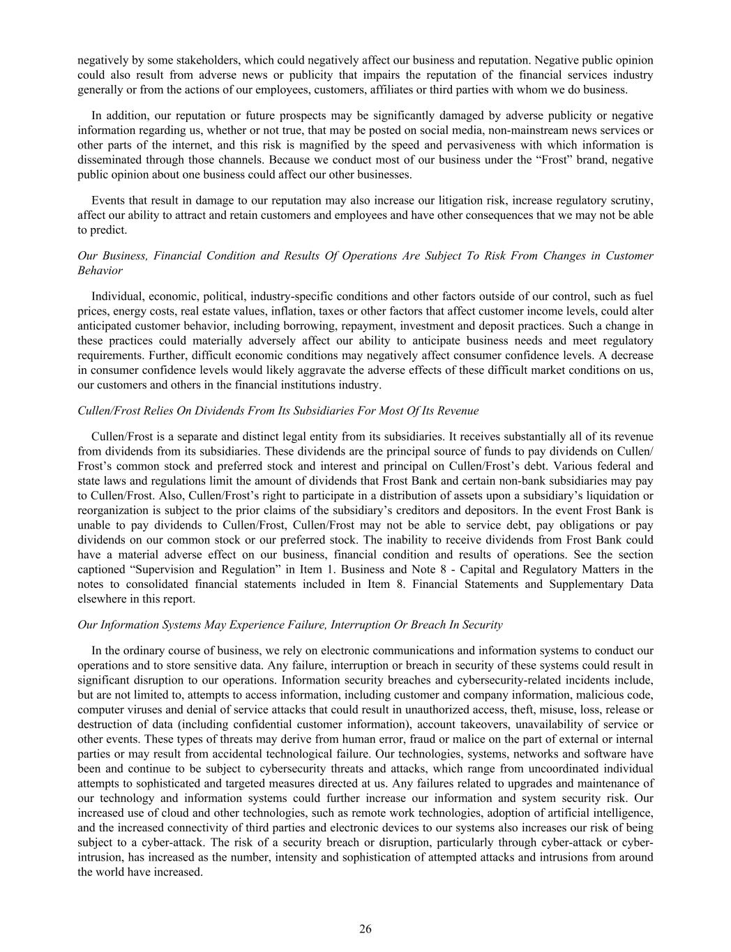 negatively by some stakeholders, which could negatively affect our business and reputation. Negative public opinion could also result from adverse news or publicity that impairs the reputation of the financial services industry generally or from the actions of our employees, customers, affiliates or third parties with whom we do business. In addition, our reputation or future prospects may be significantly damaged by adverse publicity or negative information regarding us, whether or not true, that may be posted on social media, non-mainstream news services or other parts of the internet, and this risk is magnified by the speed and pervasiveness with which information is disseminated through those channels. Because we conduct most of our business under the “Frost” brand, negative public opinion about one business could affect our other businesses. Events that result in damage to our reputation may also increase our litigation risk, increase regulatory scrutiny, affect our ability to attract and retain customers and employees and have other consequences that we may not be able to predict. Our Business, Financial Condition and Results Of Operations Are Subject To Risk From Changes in Customer Behavior Individual, economic, political, industry-specific conditions and other factors outside of our control, such as fuel prices, energy costs, real estate values, inflation, taxes or other factors that affect customer income levels, could alter anticipated customer behavior, including borrowing, repayment, investment and deposit practices. Such a change in these practices could materially adversely affect our ability to anticipate business needs and meet regulatory requirements. Further, difficult economic conditions may negatively affect consumer confidence levels. A decrease in consumer confidence levels would likely aggravate the adverse effects of these difficult market conditions on us, our customers and others in the financial institutions industry. Cullen/Frost Relies On Dividends From Its Subsidiaries For Most Of Its Revenue Cullen/Frost is a separate and distinct legal entity from its subsidiaries. It receives substantially all of its revenue from dividends from its subsidiaries. These dividends are the principal source of funds to pay dividends on Cullen/ Frost’s common stock and preferred stock and interest and principal on Cullen/Frost’s debt. Various federal and state laws and regulations limit the amount of dividends that Frost Bank and certain non-bank subsidiaries may pay to Cullen/Frost. Also, Cullen/Frost’s right to participate in a distribution of assets upon a subsidiary’s liquidation or reorganization is subject to the prior claims of the subsidiary’s creditors and depositors. In the event Frost Bank is unable to pay dividends to Cullen/Frost, Cullen/Frost may not be able to service debt, pay obligations or pay dividends on our common stock or our preferred stock. The inability to receive dividends from Frost Bank could have a material adverse effect on our business, financial condition and results of operations. See the section captioned “Supervision and Regulation” in Item 1. Business and Note 8 - Capital and Regulatory Matters in the notes to consolidated financial statements included in Item 8. Financial Statements and Supplementary Data elsewhere in this report. Our Information Systems May Experience Failure, Interruption Or Breach In Security In the ordinary course of business, we rely on electronic communications and information systems to conduct our operations and to store sensitive data. Any failure, interruption or breach in security of these systems could result in significant disruption to our operations. Information security breaches and cybersecurity-related incidents include, but are not limited to, attempts to access information, including customer and company information, malicious code, computer viruses and denial of service attacks that could result in unauthorized access, theft, misuse, loss, release or destruction of data (including confidential customer information), account takeovers, unavailability of service or other events. These types of threats may derive from human error, fraud or malice on the part of external or internal parties or may result from accidental technological failure. Our technologies, systems, networks and software have been and continue to be subject to cybersecurity threats and attacks, which range from uncoordinated individual attempts to sophisticated and targeted measures directed at us. Any failures related to upgrades and maintenance of our technology and information systems could further increase our information and system security risk. Our increased use of cloud and other technologies, such as remote work technologies, adoption of artificial intelligence, and the increased connectivity of third parties and electronic devices to our systems also increases our risk of being subject to a cyber-attack. The risk of a security breach or disruption, particularly through cyber-attack or cyber- intrusion, has increased as the number, intensity and sophistication of attempted attacks and intrusions from around the world have increased. 26