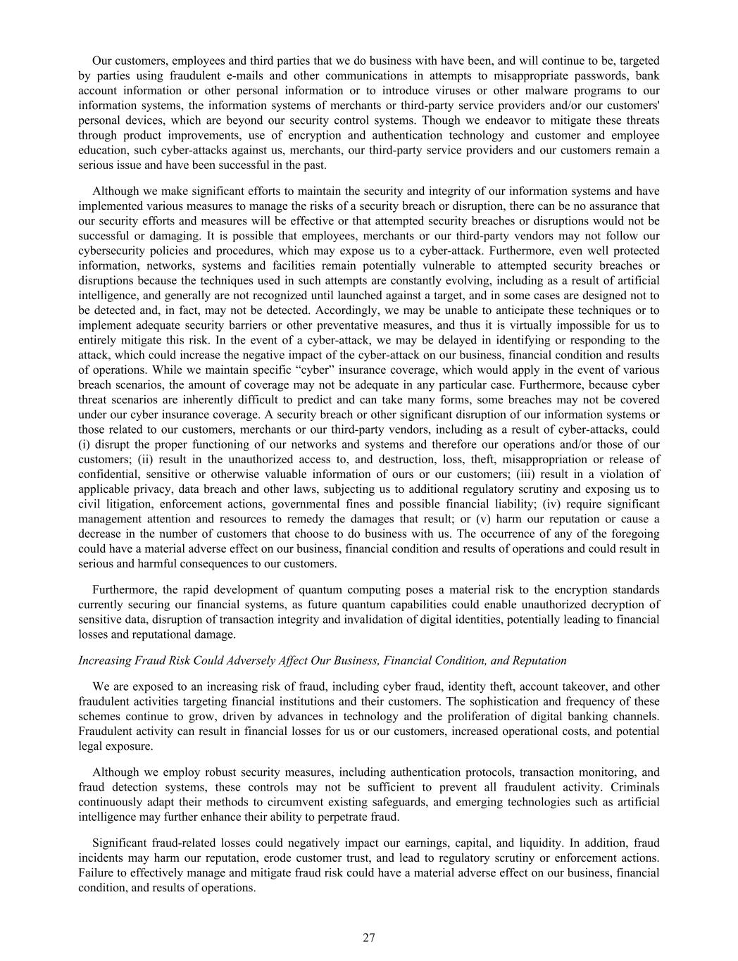 Our customers, employees and third parties that we do business with have been, and will continue to be, targeted by parties using fraudulent e-mails and other communications in attempts to misappropriate passwords, bank account information or other personal information or to introduce viruses or other malware programs to our information systems, the information systems of merchants or third-party service providers and/or our customers' personal devices, which are beyond our security control systems. Though we endeavor to mitigate these threats through product improvements, use of encryption and authentication technology and customer and employee education, such cyber-attacks against us, merchants, our third-party service providers and our customers remain a serious issue and have been successful in the past. Although we make significant efforts to maintain the security and integrity of our information systems and have implemented various measures to manage the risks of a security breach or disruption, there can be no assurance that our security efforts and measures will be effective or that attempted security breaches or disruptions would not be successful or damaging. It is possible that employees, merchants or our third-party vendors may not follow our cybersecurity policies and procedures, which may expose us to a cyber-attack. Furthermore, even well protected information, networks, systems and facilities remain potentially vulnerable to attempted security breaches or disruptions because the techniques used in such attempts are constantly evolving, including as a result of artificial intelligence, and generally are not recognized until launched against a target, and in some cases are designed not to be detected and, in fact, may not be detected. Accordingly, we may be unable to anticipate these techniques or to implement adequate security barriers or other preventative measures, and thus it is virtually impossible for us to entirely mitigate this risk. In the event of a cyber-attack, we may be delayed in identifying or responding to the attack, which could increase the negative impact of the cyber-attack on our business, financial condition and results of operations. While we maintain specific “cyber” insurance coverage, which would apply in the event of various breach scenarios, the amount of coverage may not be adequate in any particular case. Furthermore, because cyber threat scenarios are inherently difficult to predict and can take many forms, some breaches may not be covered under our cyber insurance coverage. A security breach or other significant disruption of our information systems or those related to our customers, merchants or our third-party vendors, including as a result of cyber-attacks, could (i) disrupt the proper functioning of our networks and systems and therefore our operations and/or those of our customers; (ii) result in the unauthorized access to, and destruction, loss, theft, misappropriation or release of confidential, sensitive or otherwise valuable information of ours or our customers; (iii) result in a violation of applicable privacy, data breach and other laws, subjecting us to additional regulatory scrutiny and exposing us to civil litigation, enforcement actions, governmental fines and possible financial liability; (iv) require significant management attention and resources to remedy the damages that result; or (v) harm our reputation or cause a decrease in the number of customers that choose to do business with us. The occurrence of any of the foregoing could have a material adverse effect on our business, financial condition and results of operations and could result in serious and harmful consequences to our customers. Furthermore, the rapid development of quantum computing poses a material risk to the encryption standards currently securing our financial systems, as future quantum capabilities could enable unauthorized decryption of sensitive data, disruption of transaction integrity and invalidation of digital identities, potentially leading to financial losses and reputational damage. Increasing Fraud Risk Could Adversely Affect Our Business, Financial Condition, and Reputation We are exposed to an increasing risk of fraud, including cyber fraud, identity theft, account takeover, and other fraudulent activities targeting financial institutions and their customers. The sophistication and frequency of these schemes continue to grow, driven by advances in technology and the proliferation of digital banking channels. Fraudulent activity can result in financial losses for us or our customers, increased operational costs, and potential legal exposure. Although we employ robust security measures, including authentication protocols, transaction monitoring, and fraud detection systems, these controls may not be sufficient to prevent all fraudulent activity. Criminals continuously adapt their methods to circumvent existing safeguards, and emerging technologies such as artificial intelligence may further enhance their ability to perpetrate fraud. Significant fraud-related losses could negatively impact our earnings, capital, and liquidity. In addition, fraud incidents may harm our reputation, erode customer trust, and lead to regulatory scrutiny or enforcement actions. Failure to effectively manage and mitigate fraud risk could have a material adverse effect on our business, financial condition, and results of operations. 27