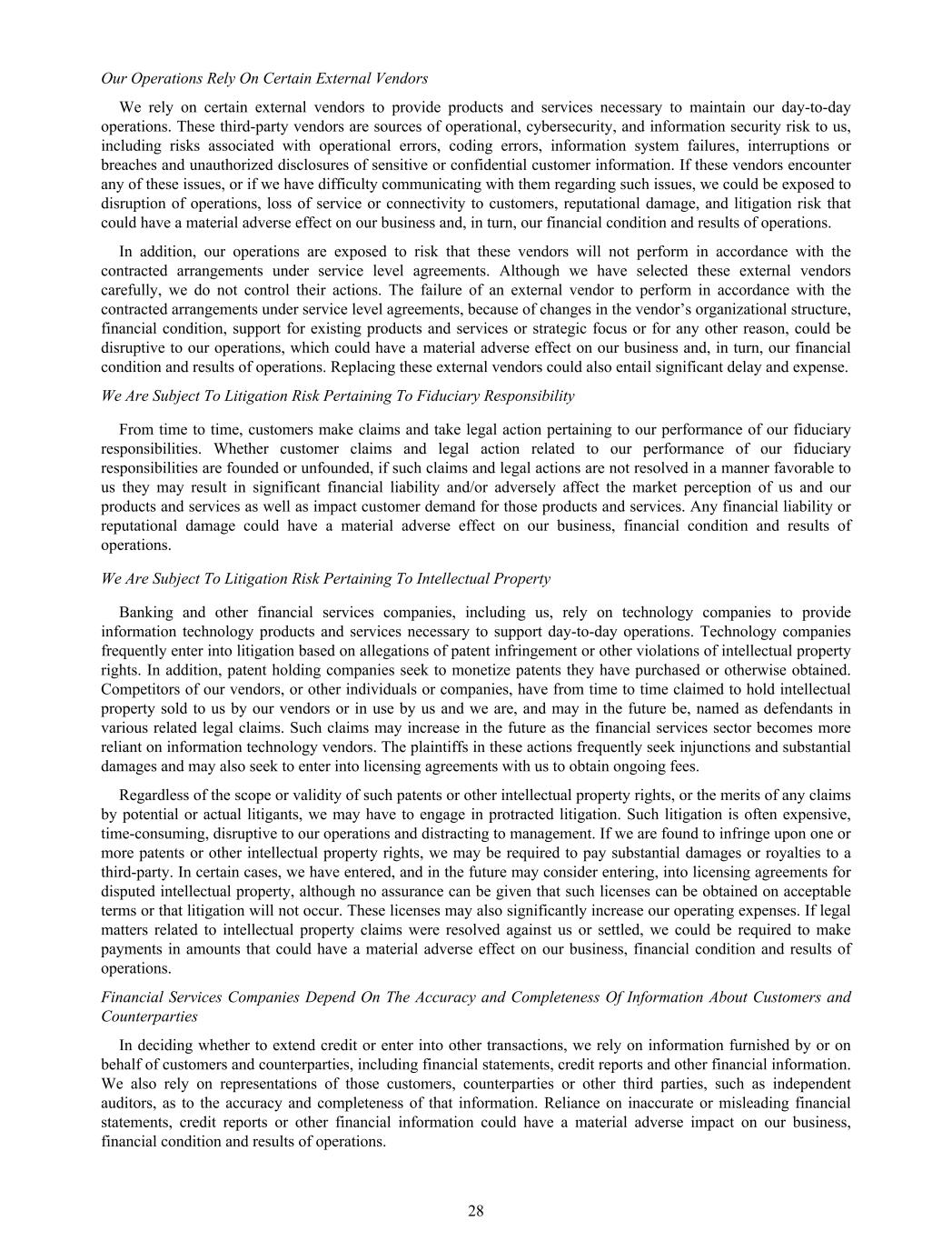 Our Operations Rely On Certain External Vendors We rely on certain external vendors to provide products and services necessary to maintain our day-to-day operations. These third-party vendors are sources of operational, cybersecurity, and information security risk to us, including risks associated with operational errors, coding errors, information system failures, interruptions or breaches and unauthorized disclosures of sensitive or confidential customer information. If these vendors encounter any of these issues, or if we have difficulty communicating with them regarding such issues, we could be exposed to disruption of operations, loss of service or connectivity to customers, reputational damage, and litigation risk that could have a material adverse effect on our business and, in turn, our financial condition and results of operations. In addition, our operations are exposed to risk that these vendors will not perform in accordance with the contracted arrangements under service level agreements. Although we have selected these external vendors carefully, we do not control their actions. The failure of an external vendor to perform in accordance with the contracted arrangements under service level agreements, because of changes in the vendor’s organizational structure, financial condition, support for existing products and services or strategic focus or for any other reason, could be disruptive to our operations, which could have a material adverse effect on our business and, in turn, our financial condition and results of operations. Replacing these external vendors could also entail significant delay and expense. We Are Subject To Litigation Risk Pertaining To Fiduciary Responsibility From time to time, customers make claims and take legal action pertaining to our performance of our fiduciary responsibilities. Whether customer claims and legal action related to our performance of our fiduciary responsibilities are founded or unfounded, if such claims and legal actions are not resolved in a manner favorable to us they may result in significant financial liability and/or adversely affect the market perception of us and our products and services as well as impact customer demand for those products and services. Any financial liability or reputational damage could have a material adverse effect on our business, financial condition and results of operations. We Are Subject To Litigation Risk Pertaining To Intellectual Property Banking and other financial services companies, including us, rely on technology companies to provide information technology products and services necessary to support day-to-day operations. Technology companies frequently enter into litigation based on allegations of patent infringement or other violations of intellectual property rights. In addition, patent holding companies seek to monetize patents they have purchased or otherwise obtained. Competitors of our vendors, or other individuals or companies, have from time to time claimed to hold intellectual property sold to us by our vendors or in use by us and we are, and may in the future be, named as defendants in various related legal claims. Such claims may increase in the future as the financial services sector becomes more reliant on information technology vendors. The plaintiffs in these actions frequently seek injunctions and substantial damages and may also seek to enter into licensing agreements with us to obtain ongoing fees. Regardless of the scope or validity of such patents or other intellectual property rights, or the merits of any claims by potential or actual litigants, we may have to engage in protracted litigation. Such litigation is often expensive, time-consuming, disruptive to our operations and distracting to management. If we are found to infringe upon one or more patents or other intellectual property rights, we may be required to pay substantial damages or royalties to a third-party. In certain cases, we have entered, and in the future may consider entering, into licensing agreements for disputed intellectual property, although no assurance can be given that such licenses can be obtained on acceptable terms or that litigation will not occur. These licenses may also significantly increase our operating expenses. If legal matters related to intellectual property claims were resolved against us or settled, we could be required to make payments in amounts that could have a material adverse effect on our business, financial condition and results of operations. Financial Services Companies Depend On The Accuracy and Completeness Of Information About Customers and Counterparties In deciding whether to extend credit or enter into other transactions, we rely on information furnished by or on behalf of customers and counterparties, including financial statements, credit reports and other financial information. We also rely on representations of those customers, counterparties or other third parties, such as independent auditors, as to the accuracy and completeness of that information. Reliance on inaccurate or misleading financial statements, credit reports or other financial information could have a material adverse impact on our business, financial condition and results of operations. 28