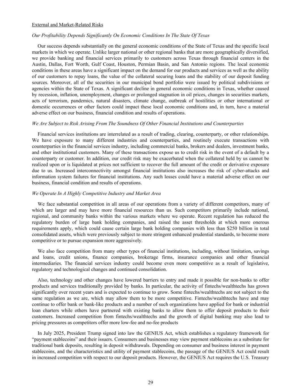 External and Market-Related Risks Our Profitability Depends Significantly On Economic Conditions In The State Of Texas Our success depends substantially on the general economic conditions of the State of Texas and the specific local markets in which we operate. Unlike larger national or other regional banks that are more geographically diversified, we provide banking and financial services primarily to customers across Texas through financial centers in the Austin, Dallas, Fort Worth, Gulf Coast, Houston, Permian Basin, and San Antonio regions. The local economic conditions in these areas have a significant impact on the demand for our products and services as well as the ability of our customers to repay loans, the value of the collateral securing loans and the stability of our deposit funding sources. Moreover, all of the securities in our municipal bond portfolio were issued by political subdivisions or agencies within the State of Texas. A significant decline in general economic conditions in Texas, whether caused by recession, inflation, unemployment, changes or prolonged stagnation in oil prices, changes in securities markets, acts of terrorism, pandemics, natural disasters, climate change, outbreak of hostilities or other international or domestic occurrences or other factors could impact these local economic conditions and, in turn, have a material adverse effect on our business, financial condition and results of operations. We Are Subject to Risk Arising From The Soundness Of Other Financial Institutions and Counterparties Financial services institutions are interrelated as a result of trading, clearing, counterparty, or other relationships. We have exposure to many different industries and counterparties, and routinely execute transactions with counterparties in the financial services industry, including commercial banks, brokers and dealers, investment banks, and other institutional customers. Many of these transactions expose us to credit risk in the event of a default by a counterparty or customer. In addition, our credit risk may be exacerbated when the collateral held by us cannot be realized upon or is liquidated at prices not sufficient to recover the full amount of the credit or derivative exposure due to us. Increased interconnectivity amongst financial institutions also increases the risk of cyber-attacks and information system failures for financial institutions. Any such losses could have a material adverse effect on our business, financial condition and results of operations. We Operate In A Highly Competitive Industry and Market Area We face substantial competition in all areas of our operations from a variety of different competitors, many of which are larger and may have more financial resources than us. Such competitors primarily include national, regional, and community banks within the various markets where we operate. Recent regulation has reduced the regulatory burden of large bank holding companies, and raised the asset thresholds at which more onerous requirements apply, which could cause certain large bank holding companies with less than $250 billion in total consolidated assets, which were previously subject to more stringent enhanced prudential standards, to become more competitive or to pursue expansion more aggressively. We also face competition from many other types of financial institutions, including, without limitation, savings and loans, credit unions, finance companies, brokerage firms, insurance companies and other financial intermediaries. The financial services industry could become even more competitive as a result of legislative, regulatory and technological changes and continued consolidation. Also, technology and other changes have lowered barriers to entry and made it possible for non-banks to offer products and services traditionally provided by banks. In particular, the activity of fintechs/wealthtechs has grown significantly over recent years and is expected to continue to grow. Some fintechs/wealthtechs are not subject to the same regulation as we are, which may allow them to be more competitive. Fintechs/wealthtechs have and may continue to offer bank or bank-like products and a number of such organizations have applied for bank or industrial loan charters while others have partnered with existing banks to allow them to offer deposit products to their customers. Increased competition from fintechs/wealthtechs and the growth of digital banking may also lead to pricing pressures as competitors offer more low-fee and no-fee products In July 2025, President Trump signed into law the GENIUS Act, which establishes a regulatory framework for “payment stablecoins” and their issuers. Consumers and businesses may view payment stablecoins as a substitute for traditional bank deposits, resulting in deposit withdrawals. Depending on consumer and business interest in payment stablecoins, and the characteristics and utility of payment stablecoins, the passage of the GENIUS Act could result in increased competition with respect to our deposit products. However, the GENIUS Act requires the U.S. Treasury 29