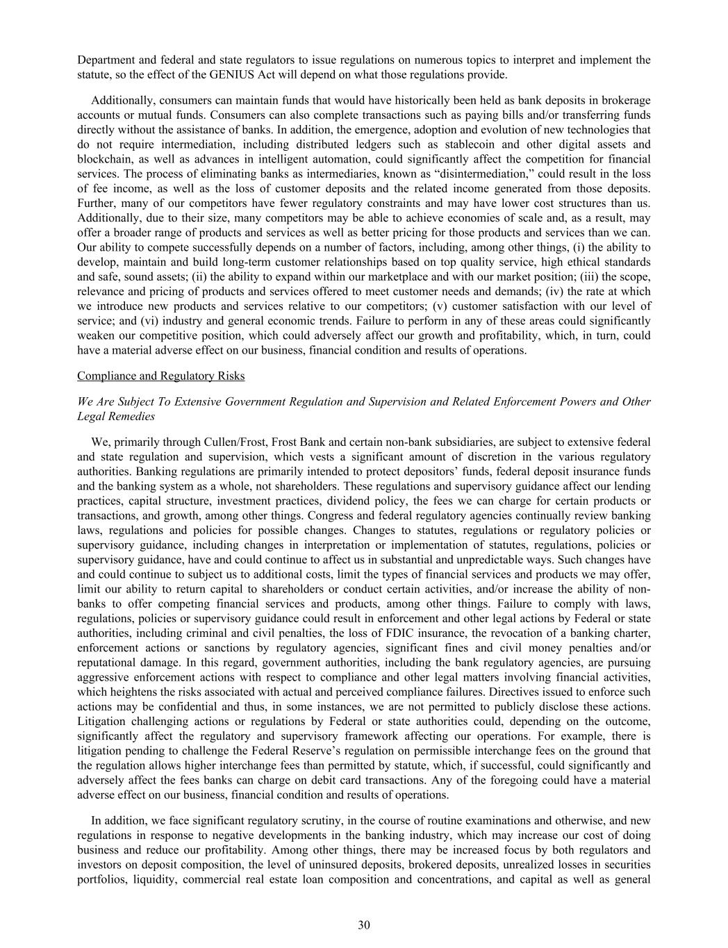 Department and federal and state regulators to issue regulations on numerous topics to interpret and implement the statute, so the effect of the GENIUS Act will depend on what those regulations provide. Additionally, consumers can maintain funds that would have historically been held as bank deposits in brokerage accounts or mutual funds. Consumers can also complete transactions such as paying bills and/or transferring funds directly without the assistance of banks. In addition, the emergence, adoption and evolution of new technologies that do not require intermediation, including distributed ledgers such as stablecoin and other digital assets and blockchain, as well as advances in intelligent automation, could significantly affect the competition for financial services. The process of eliminating banks as intermediaries, known as “disintermediation,” could result in the loss of fee income, as well as the loss of customer deposits and the related income generated from those deposits. Further, many of our competitors have fewer regulatory constraints and may have lower cost structures than us. Additionally, due to their size, many competitors may be able to achieve economies of scale and, as a result, may offer a broader range of products and services as well as better pricing for those products and services than we can. Our ability to compete successfully depends on a number of factors, including, among other things, (i) the ability to develop, maintain and build long-term customer relationships based on top quality service, high ethical standards and safe, sound assets; (ii) the ability to expand within our marketplace and with our market position; (iii) the scope, relevance and pricing of products and services offered to meet customer needs and demands; (iv) the rate at which we introduce new products and services relative to our competitors; (v) customer satisfaction with our level of service; and (vi) industry and general economic trends. Failure to perform in any of these areas could significantly weaken our competitive position, which could adversely affect our growth and profitability, which, in turn, could have a material adverse effect on our business, financial condition and results of operations. Compliance and Regulatory Risks We Are Subject To Extensive Government Regulation and Supervision and Related Enforcement Powers and Other Legal Remedies We, primarily through Cullen/Frost, Frost Bank and certain non-bank subsidiaries, are subject to extensive federal and state regulation and supervision, which vests a significant amount of discretion in the various regulatory authorities. Banking regulations are primarily intended to protect depositors’ funds, federal deposit insurance funds and the banking system as a whole, not shareholders. These regulations and supervisory guidance affect our lending practices, capital structure, investment practices, dividend policy, the fees we can charge for certain products or transactions, and growth, among other things. Congress and federal regulatory agencies continually review banking laws, regulations and policies for possible changes. Changes to statutes, regulations or regulatory policies or supervisory guidance, including changes in interpretation or implementation of statutes, regulations, policies or supervisory guidance, have and could continue to affect us in substantial and unpredictable ways. Such changes have and could continue to subject us to additional costs, limit the types of financial services and products we may offer, limit our ability to return capital to shareholders or conduct certain activities, and/or increase the ability of non- banks to offer competing financial services and products, among other things. Failure to comply with laws, regulations, policies or supervisory guidance could result in enforcement and other legal actions by Federal or state authorities, including criminal and civil penalties, the loss of FDIC insurance, the revocation of a banking charter, enforcement actions or sanctions by regulatory agencies, significant fines and civil money penalties and/or reputational damage. In this regard, government authorities, including the bank regulatory agencies, are pursuing aggressive enforcement actions with respect to compliance and other legal matters involving financial activities, which heightens the risks associated with actual and perceived compliance failures. Directives issued to enforce such actions may be confidential and thus, in some instances, we are not permitted to publicly disclose these actions. Litigation challenging actions or regulations by Federal or state authorities could, depending on the outcome, significantly affect the regulatory and supervisory framework affecting our operations. For example, there is litigation pending to challenge the Federal Reserve’s regulation on permissible interchange fees on the ground that the regulation allows higher interchange fees than permitted by statute, which, if successful, could significantly and adversely affect the fees banks can charge on debit card transactions. Any of the foregoing could have a material adverse effect on our business, financial condition and results of operations. In addition, we face significant regulatory scrutiny, in the course of routine examinations and otherwise, and new regulations in response to negative developments in the banking industry, which may increase our cost of doing business and reduce our profitability. Among other things, there may be increased focus by both regulators and investors on deposit composition, the level of uninsured deposits, brokered deposits, unrealized losses in securities portfolios, liquidity, commercial real estate loan composition and concentrations, and capital as well as general 30