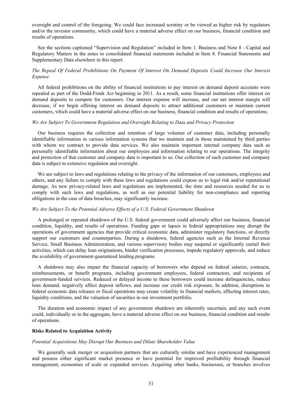 oversight and control of the foregoing. We could face increased scrutiny or be viewed as higher risk by regulators and/or the investor community, which could have a material adverse effect on our business, financial condition and results of operations. See the sections captioned “Supervision and Regulation” included in Item 1. Business and Note 8 - Capital and Regulatory Matters in the notes to consolidated financial statements included in Item 8. Financial Statements and Supplementary Data elsewhere in this report. The Repeal Of Federal Prohibitions On Payment Of Interest On Demand Deposits Could Increase Our Interest Expense All federal prohibitions on the ability of financial institutions to pay interest on demand deposit accounts were repealed as part of the Dodd-Frank Act beginning in 2011. As a result, some financial institutions offer interest on demand deposits to compete for customers. Our interest expense will increase, and our net interest margin will decrease, if we begin offering interest on demand deposits to attract additional customers or maintain current customers, which could have a material adverse effect on our business, financial condition and results of operations. We Are Subject To Government Regulation and Oversight Relating to Data and Privacy Protection Our business requires the collection and retention of large volumes of customer data, including personally identifiable information in various information systems that we maintain and in those maintained by third parties with whom we contract to provide data services. We also maintain important internal company data such as personally identifiable information about our employees and information relating to our operations. The integrity and protection of that customer and company data is important to us. Our collection of such customer and company data is subject to extensive regulation and oversight. We are subject to laws and regulations relating to the privacy of the information of our customers, employees and others, and any failure to comply with these laws and regulations could expose us to legal risk and/or reputational damage. As new privacy-related laws and regulations are implemented, the time and resources needed for us to comply with such laws and regulations, as well as our potential liability for non-compliance and reporting obligations in the case of data breaches, may significantly increase. We Are Subject To the Potential Adverse Effects of a U.S. Federal Government Shutdown A prolonged or repeated shutdown of the U.S. federal government could adversely affect our business, financial condition, liquidity, and results of operations. Funding gaps or lapses in federal appropriations may disrupt the operations of government agencies that provide critical economic data, administer regulatory functions, or directly support our customers and counterparties. During a shutdown, federal agencies such as the Internal Revenue Service, Small Business Administration, and various supervisory bodies may suspend or significantly curtail their activities, which can delay loan originations, hinder verification processes, impede regulatory approvals, and reduce the availability of government-guaranteed lending programs. A shutdown may also impair the financial capacity of borrowers who depend on federal salaries, contracts, reimbursements, or benefit programs, including government employees, federal contractors, and recipients of government-funded services. Reduced or delayed income to these borrowers could increase delinquencies, reduce loan demand, negatively affect deposit inflows, and increase our credit risk exposure. In addition, disruptions to federal economic data releases or fiscal operations may create volatility in financial markets, affecting interest rates, liquidity conditions, and the valuation of securities in our investment portfolio. The duration and economic impact of any government shutdown are inherently uncertain, and any such event could, individually or in the aggregate, have a material adverse effect on our business, financial condition and results of operations. Risks Related to Acquisition Activity Potential Acquisitions May Disrupt Our Business and Dilute Shareholder Value We generally seek merger or acquisition partners that are culturally similar and have experienced management and possess either significant market presence or have potential for improved profitability through financial management, economies of scale or expanded services. Acquiring other banks, businesses, or branches involves 31