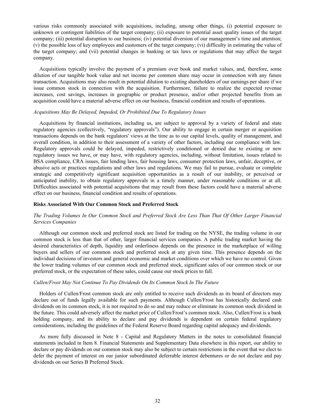 various risks commonly associated with acquisitions, including, among other things, (i) potential exposure to unknown or contingent liabilities of the target company; (ii) exposure to potential asset quality issues of the target company; (iii) potential disruption to our business; (iv) potential diversion of our management’s time and attention; (v) the possible loss of key employees and customers of the target company; (vi) difficulty in estimating the value of the target company; and (vii) potential changes in banking or tax laws or regulations that may affect the target company. Acquisitions typically involve the payment of a premium over book and market values, and, therefore, some dilution of our tangible book value and net income per common share may occur in connection with any future transaction. Acquisitions may also result in potential dilution to existing shareholders of our earnings per share if we issue common stock in connection with the acquisition. Furthermore, failure to realize the expected revenue increases, cost savings, increases in geographic or product presence, and/or other projected benefits from an acquisition could have a material adverse effect on our business, financial condition and results of operations. Acquisitions May Be Delayed, Impeded, Or Prohibited Due To Regulatory Issues Acquisitions by financial institutions, including us, are subject to approval by a variety of federal and state regulatory agencies (collectively, “regulatory approvals”). Our ability to engage in certain merger or acquisition transactions depends on the bank regulators' views at the time as to our capital levels, quality of management, and overall condition, in addition to their assessment of a variety of other factors, including our compliance with law. Regulatory approvals could be delayed, impeded, restrictively conditioned or denied due to existing or new regulatory issues we have, or may have, with regulatory agencies, including, without limitation, issues related to BSA compliance, CRA issues, fair lending laws, fair housing laws, consumer protection laws, unfair, deceptive, or abusive acts or practices regulations and other laws and regulations. We may fail to pursue, evaluate or complete strategic and competitively significant acquisition opportunities as a result of our inability, or perceived or anticipated inability, to obtain regulatory approvals in a timely manner, under reasonable conditions or at all. Difficulties associated with potential acquisitions that may result from these factors could have a material adverse effect on our business, financial condition and results of operations. Risks Associated With Our Common Stock and Preferred Stock The Trading Volumes In Our Common Stock and Preferred Stock Are Less Than That Of Other Larger Financial Services Companies Although our common stock and preferred stock are listed for trading on the NYSE, the trading volume in our common stock is less than that of other, larger financial services companies. A public trading market having the desired characteristics of depth, liquidity and orderliness depends on the presence in the marketplace of willing buyers and sellers of our common stock and preferred stock at any given time. This presence depends on the individual decisions of investors and general economic and market conditions over which we have no control. Given the lower trading volumes of our common stock and preferred stock, significant sales of our common stock or our preferred stock, or the expectation of these sales, could cause our stock prices to fall. Cullen/Frost May Not Continue To Pay Dividends On Its Common Stock In The Future Holders of Cullen/Frost common stock are only entitled to receive such dividends as its board of directors may declare out of funds legally available for such payments. Although Cullen/Frost has historically declared cash dividends on its common stock, it is not required to do so and may reduce or eliminate its common stock dividend in the future. This could adversely affect the market price of Cullen/Frost’s common stock. Also, Cullen/Frost is a bank holding company, and its ability to declare and pay dividends is dependent on certain federal regulatory considerations, including the guidelines of the Federal Reserve Board regarding capital adequacy and dividends. As more fully discussed in Note 8 - Capital and Regulatory Matters in the notes to consolidated financial statements included in Item 8. Financial Statements and Supplementary Data elsewhere in this report, our ability to declare or pay dividends on our common stock may also be subject to certain restrictions in the event that we elect to defer the payment of interest on our junior subordinated deferrable interest debentures or do not declare and pay dividends on our Series B Preferred Stock. 32