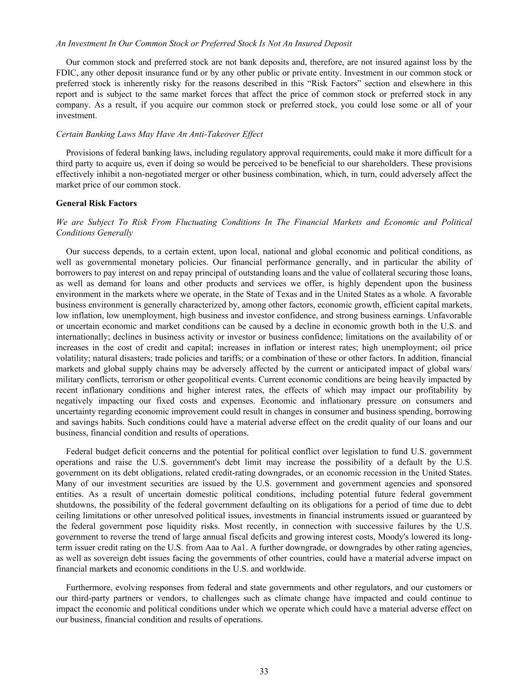 An Investment In Our Common Stock or Preferred Stock Is Not An Insured Deposit Our common stock and preferred stock are not bank deposits and, therefore, are not insured against loss by the FDIC, any other deposit insurance fund or by any other public or private entity. Investment in our common stock or preferred stock is inherently risky for the reasons described in this “Risk Factors” section and elsewhere in this report and is subject to the same market forces that affect the price of common stock or preferred stock in any company. As a result, if you acquire our common stock or preferred stock, you could lose some or all of your investment. Certain Banking Laws May Have An Anti-Takeover Effect Provisions of federal banking laws, including regulatory approval requirements, could make it more difficult for a third party to acquire us, even if doing so would be perceived to be beneficial to our shareholders. These provisions effectively inhibit a non-negotiated merger or other business combination, which, in turn, could adversely affect the market price of our common stock. General Risk Factors We are Subject To Risk From Fluctuating Conditions In The Financial Markets and Economic and Political Conditions Generally Our success depends, to a certain extent, upon local, national and global economic and political conditions, as well as governmental monetary policies. Our financial performance generally, and in particular the ability of borrowers to pay interest on and repay principal of outstanding loans and the value of collateral securing those loans, as well as demand for loans and other products and services we offer, is highly dependent upon the business environment in the markets where we operate, in the State of Texas and in the United States as a whole. A favorable business environment is generally characterized by, among other factors, economic growth, efficient capital markets, low inflation, low unemployment, high business and investor confidence, and strong business earnings. Unfavorable or uncertain economic and market conditions can be caused by a decline in economic growth both in the U.S. and internationally; declines in business activity or investor or business confidence; limitations on the availability of or increases in the cost of credit and capital; increases in inflation or interest rates; high unemployment; oil price volatility; natural disasters; trade policies and tariffs; or a combination of these or other factors. In addition, financial markets and global supply chains may be adversely affected by the current or anticipated impact of global wars/ military conflicts, terrorism or other geopolitical events. Current economic conditions are being heavily impacted by recent inflationary conditions and higher interest rates, the effects of which may impact our profitability by negatively impacting our fixed costs and expenses. Economic and inflationary pressure on consumers and uncertainty regarding economic improvement could result in changes in consumer and business spending, borrowing and savings habits. Such conditions could have a material adverse effect on the credit quality of our loans and our business, financial condition and results of operations. Federal budget deficit concerns and the potential for political conflict over legislation to fund U.S. government operations and raise the U.S. government's debt limit may increase the possibility of a default by the U.S. government on its debt obligations, related credit-rating downgrades, or an economic recession in the United States. Many of our investment securities are issued by the U.S. government and government agencies and sponsored entities. As a result of uncertain domestic political conditions, including potential future federal government shutdowns, the possibility of the federal government defaulting on its obligations for a period of time due to debt ceiling limitations or other unresolved political issues, investments in financial instruments issued or guaranteed by the federal government pose liquidity risks. Most recently, in connection with successive failures by the U.S. government to reverse the trend of large annual fiscal deficits and growing interest costs, Moody's lowered its long- term issuer credit rating on the U.S. from Aaa to Aa1. A further downgrade, or downgrades by other rating agencies, as well as sovereign debt issues facing the governments of other countries, could have a material adverse impact on financial markets and economic conditions in the U.S. and worldwide. Furthermore, evolving responses from federal and state governments and other regulators, and our customers or our third-party partners or vendors, to challenges such as climate change have impacted and could continue to impact the economic and political conditions under which we operate which could have a material adverse effect on our business, financial condition and results of operations. 33