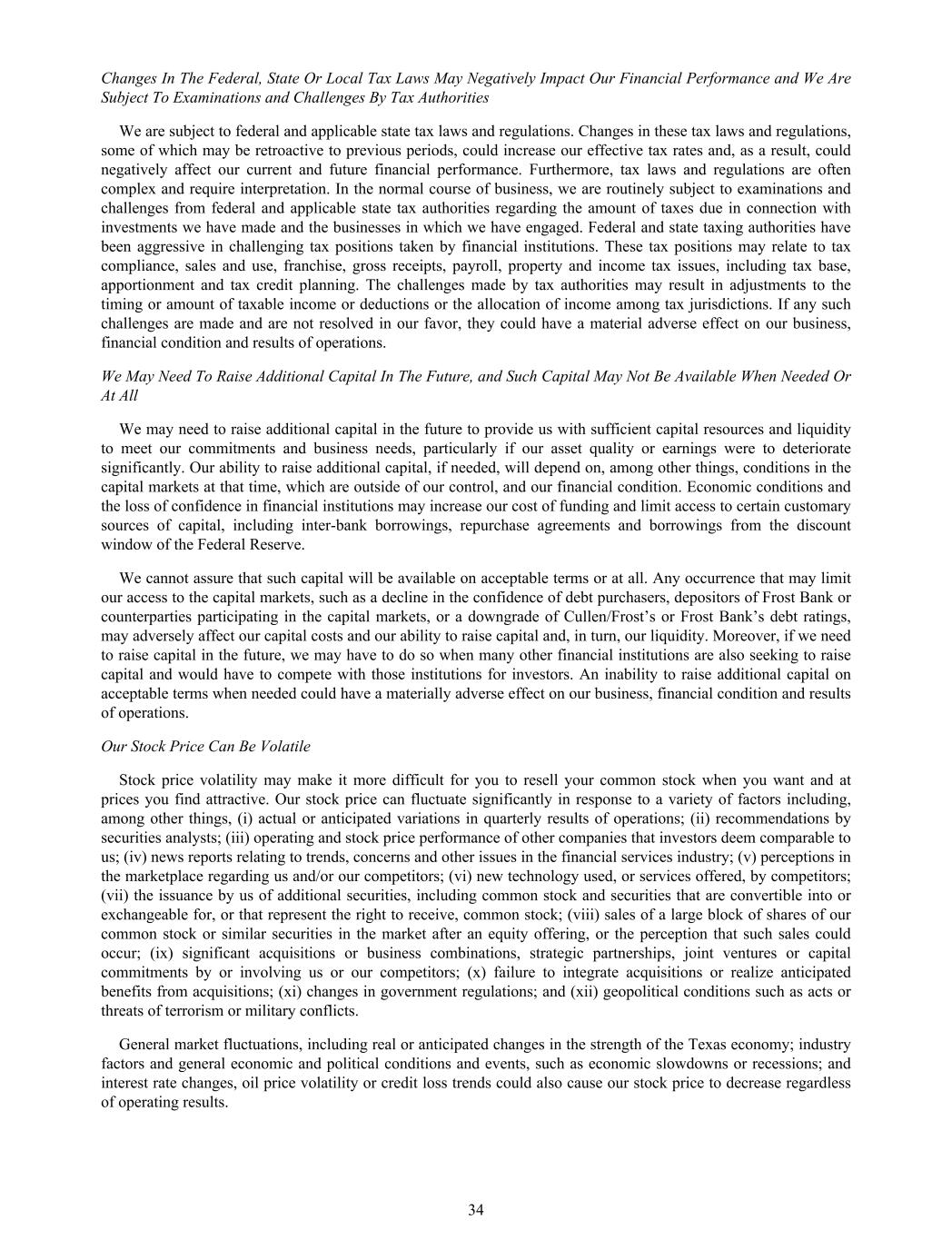 Changes In The Federal, State Or Local Tax Laws May Negatively Impact Our Financial Performance and We Are Subject To Examinations and Challenges By Tax Authorities We are subject to federal and applicable state tax laws and regulations. Changes in these tax laws and regulations, some of which may be retroactive to previous periods, could increase our effective tax rates and, as a result, could negatively affect our current and future financial performance. Furthermore, tax laws and regulations are often complex and require interpretation. In the normal course of business, we are routinely subject to examinations and challenges from federal and applicable state tax authorities regarding the amount of taxes due in connection with investments we have made and the businesses in which we have engaged. Federal and state taxing authorities have been aggressive in challenging tax positions taken by financial institutions. These tax positions may relate to tax compliance, sales and use, franchise, gross receipts, payroll, property and income tax issues, including tax base, apportionment and tax credit planning. The challenges made by tax authorities may result in adjustments to the timing or amount of taxable income or deductions or the allocation of income among tax jurisdictions. If any such challenges are made and are not resolved in our favor, they could have a material adverse effect on our business, financial condition and results of operations. We May Need To Raise Additional Capital In The Future, and Such Capital May Not Be Available When Needed Or At All We may need to raise additional capital in the future to provide us with sufficient capital resources and liquidity to meet our commitments and business needs, particularly if our asset quality or earnings were to deteriorate significantly. Our ability to raise additional capital, if needed, will depend on, among other things, conditions in the capital markets at that time, which are outside of our control, and our financial condition. Economic conditions and the loss of confidence in financial institutions may increase our cost of funding and limit access to certain customary sources of capital, including inter-bank borrowings, repurchase agreements and borrowings from the discount window of the Federal Reserve. We cannot assure that such capital will be available on acceptable terms or at all. Any occurrence that may limit our access to the capital markets, such as a decline in the confidence of debt purchasers, depositors of Frost Bank or counterparties participating in the capital markets, or a downgrade of Cullen/Frost’s or Frost Bank’s debt ratings, may adversely affect our capital costs and our ability to raise capital and, in turn, our liquidity. Moreover, if we need to raise capital in the future, we may have to do so when many other financial institutions are also seeking to raise capital and would have to compete with those institutions for investors. An inability to raise additional capital on acceptable terms when needed could have a materially adverse effect on our business, financial condition and results of operations. Our Stock Price Can Be Volatile Stock price volatility may make it more difficult for you to resell your common stock when you want and at prices you find attractive. Our stock price can fluctuate significantly in response to a variety of factors including, among other things, (i) actual or anticipated variations in quarterly results of operations; (ii) recommendations by securities analysts; (iii) operating and stock price performance of other companies that investors deem comparable to us; (iv) news reports relating to trends, concerns and other issues in the financial services industry; (v) perceptions in the marketplace regarding us and/or our competitors; (vi) new technology used, or services offered, by competitors; (vii) the issuance by us of additional securities, including common stock and securities that are convertible into or exchangeable for, or that represent the right to receive, common stock; (viii) sales of a large block of shares of our common stock or similar securities in the market after an equity offering, or the perception that such sales could occur; (ix) significant acquisitions or business combinations, strategic partnerships, joint ventures or capital commitments by or involving us or our competitors; (x) failure to integrate acquisitions or realize anticipated benefits from acquisitions; (xi) changes in government regulations; and (xii) geopolitical conditions such as acts or threats of terrorism or military conflicts. General market fluctuations, including real or anticipated changes in the strength of the Texas economy; industry factors and general economic and political conditions and events, such as economic slowdowns or recessions; and interest rate changes, oil price volatility or credit loss trends could also cause our stock price to decrease regardless of operating results. 34