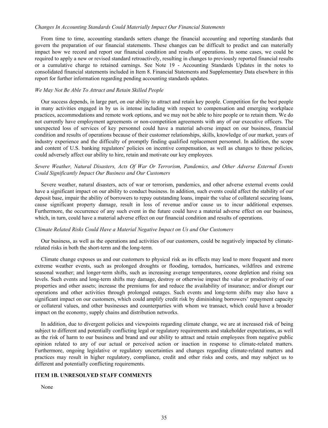 Changes In Accounting Standards Could Materially Impact Our Financial Statements From time to time, accounting standards setters change the financial accounting and reporting standards that govern the preparation of our financial statements. These changes can be difficult to predict and can materially impact how we record and report our financial condition and results of operations. In some cases, we could be required to apply a new or revised standard retroactively, resulting in changes to previously reported financial results or a cumulative charge to retained earnings. See Note 19 - Accounting Standards Updates in the notes to consolidated financial statements included in Item 8. Financial Statements and Supplementary Data elsewhere in this report for further information regarding pending accounting standards updates. We May Not Be Able To Attract and Retain Skilled People Our success depends, in large part, on our ability to attract and retain key people. Competition for the best people in many activities engaged in by us is intense including with respect to compensation and emerging workplace practices, accommodations and remote work options, and we may not be able to hire people or to retain them. We do not currently have employment agreements or non-competition agreements with any of our executive officers. The unexpected loss of services of key personnel could have a material adverse impact on our business, financial condition and results of operations because of their customer relationships, skills, knowledge of our market, years of industry experience and the difficulty of promptly finding qualified replacement personnel. In addition, the scope and content of U.S. banking regulators' policies on incentive compensation, as well as changes to these policies, could adversely affect our ability to hire, retain and motivate our key employees. Severe Weather, Natural Disasters, Acts Of War Or Terrorism, Pandemics, and Other Adverse External Events Could Significantly Impact Our Business and Our Customers Severe weather, natural disasters, acts of war or terrorism, pandemics, and other adverse external events could have a significant impact on our ability to conduct business. In addition, such events could affect the stability of our deposit base, impair the ability of borrowers to repay outstanding loans, impair the value of collateral securing loans, cause significant property damage, result in loss of revenue and/or cause us to incur additional expenses. Furthermore, the occurrence of any such event in the future could have a material adverse effect on our business, which, in turn, could have a material adverse effect on our financial condition and results of operations. Climate Related Risks Could Have a Material Negative Impact on Us and Our Customers Our business, as well as the operations and activities of our customers, could be negatively impacted by climate- related risks in both the short-term and the long-term. Climate change exposes us and our customers to physical risk as its effects may lead to more frequent and more extreme weather events, such as prolonged droughts or flooding, tornados, hurricanes, wildfires and extreme seasonal weather; and longer-term shifts, such as increasing average temperatures, ozone depletion and rising sea levels. Such events and long-term shifts may damage, destroy or otherwise impact the value or productivity of our properties and other assets; increase the premiums for and reduce the availability of insurance; and/or disrupt our operations and other activities through prolonged outages. Such events and long-term shifts may also have a significant impact on our customers, which could amplify credit risk by diminishing borrowers’ repayment capacity or collateral values, and other businesses and counterparties with whom we transact, which could have a broader impact on the economy, supply chains and distribution networks. In addition, due to divergent policies and viewpoints regarding climate change, we are at increased risk of being subject to different and potentially conflicting legal or regulatory requirements and stakeholder expectations, as well as the risk of harm to our business and brand and our ability to attract and retain employees from negative public opinion related to any of our actual or perceived action or inaction in response to climate-related matters. Furthermore, ongoing legislative or regulatory uncertainties and changes regarding climate-related matters and practices may result in higher regulatory, compliance, credit and other risks and costs, and may subject us to different and potentially conflicting requirements. ITEM 1B. UNRESOLVED STAFF COMMENTS None 35