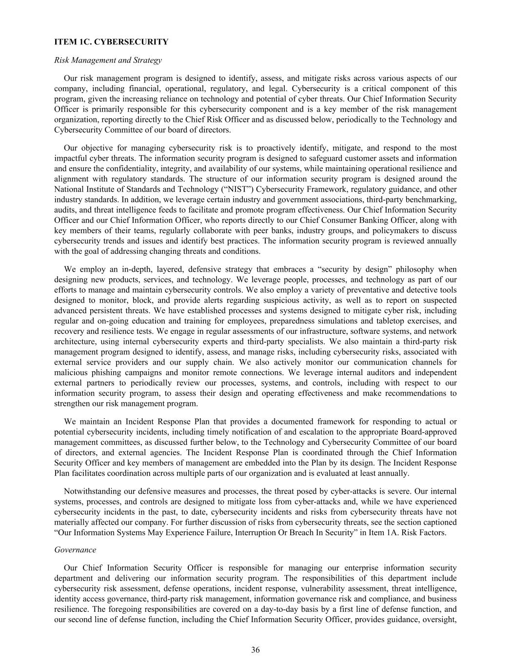 ITEM 1C. CYBERSECURITY Risk Management and Strategy Our risk management program is designed to identify, assess, and mitigate risks across various aspects of our company, including financial, operational, regulatory, and legal. Cybersecurity is a critical component of this program, given the increasing reliance on technology and potential of cyber threats. Our Chief Information Security Officer is primarily responsible for this cybersecurity component and is a key member of the risk management organization, reporting directly to the Chief Risk Officer and as discussed below, periodically to the Technology and Cybersecurity Committee of our board of directors. Our objective for managing cybersecurity risk is to proactively identify, mitigate, and respond to the most impactful cyber threats. The information security program is designed to safeguard customer assets and information and ensure the confidentiality, integrity, and availability of our systems, while maintaining operational resilience and alignment with regulatory standards. The structure of our information security program is designed around the National Institute of Standards and Technology (“NIST”) Cybersecurity Framework, regulatory guidance, and other industry standards. In addition, we leverage certain industry and government associations, third-party benchmarking, audits, and threat intelligence feeds to facilitate and promote program effectiveness. Our Chief Information Security Officer and our Chief Information Officer, who reports directly to our Chief Consumer Banking Officer, along with key members of their teams, regularly collaborate with peer banks, industry groups, and policymakers to discuss cybersecurity trends and issues and identify best practices. The information security program is reviewed annually with the goal of addressing changing threats and conditions. We employ an in-depth, layered, defensive strategy that embraces a “security by design” philosophy when designing new products, services, and technology. We leverage people, processes, and technology as part of our efforts to manage and maintain cybersecurity controls. We also employ a variety of preventative and detective tools designed to monitor, block, and provide alerts regarding suspicious activity, as well as to report on suspected advanced persistent threats. We have established processes and systems designed to mitigate cyber risk, including regular and on-going education and training for employees, preparedness simulations and tabletop exercises, and recovery and resilience tests. We engage in regular assessments of our infrastructure, software systems, and network architecture, using internal cybersecurity experts and third-party specialists. We also maintain a third-party risk management program designed to identify, assess, and manage risks, including cybersecurity risks, associated with external service providers and our supply chain. We also actively monitor our communication channels for malicious phishing campaigns and monitor remote connections. We leverage internal auditors and independent external partners to periodically review our processes, systems, and controls, including with respect to our information security program, to assess their design and operating effectiveness and make recommendations to strengthen our risk management program. We maintain an Incident Response Plan that provides a documented framework for responding to actual or potential cybersecurity incidents, including timely notification of and escalation to the appropriate Board-approved management committees, as discussed further below, to the Technology and Cybersecurity Committee of our board of directors, and external agencies. The Incident Response Plan is coordinated through the Chief Information Security Officer and key members of management are embedded into the Plan by its design. The Incident Response Plan facilitates coordination across multiple parts of our organization and is evaluated at least annually. Notwithstanding our defensive measures and processes, the threat posed by cyber-attacks is severe. Our internal systems, processes, and controls are designed to mitigate loss from cyber-attacks and, while we have experienced cybersecurity incidents in the past, to date, cybersecurity incidents and risks from cybersecurity threats have not materially affected our company. For further discussion of risks from cybersecurity threats, see the section captioned “Our Information Systems May Experience Failure, Interruption Or Breach In Security” in Item 1A. Risk Factors. Governance Our Chief Information Security Officer is responsible for managing our enterprise information security department and delivering our information security program. The responsibilities of this department include cybersecurity risk assessment, defense operations, incident response, vulnerability assessment, threat intelligence, identity access governance, third-party risk management, information governance risk and compliance, and business resilience. The foregoing responsibilities are covered on a day-to-day basis by a first line of defense function, and our second line of defense function, including the Chief Information Security Officer, provides guidance, oversight, 36