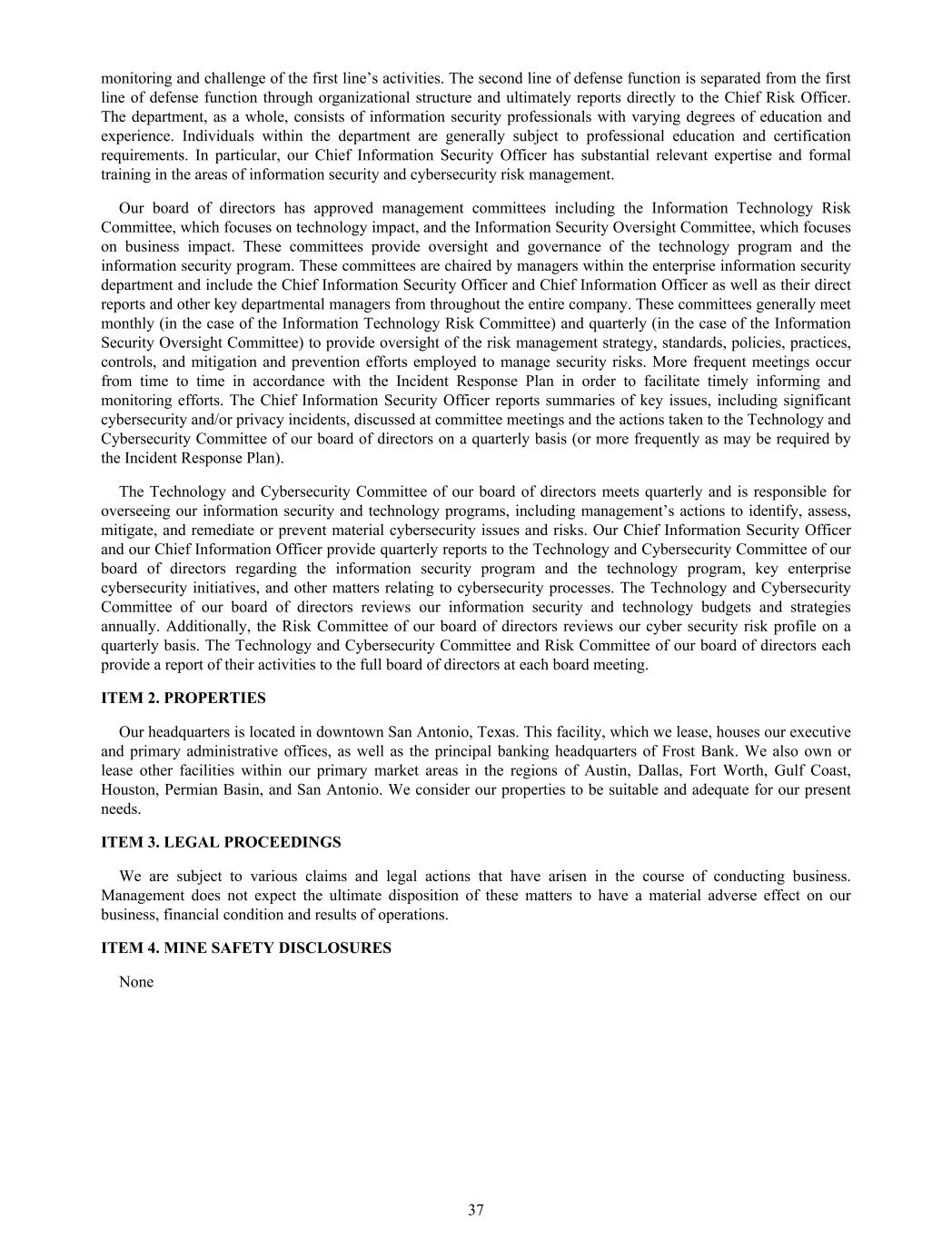 monitoring and challenge of the first line’s activities. The second line of defense function is separated from the first line of defense function through organizational structure and ultimately reports directly to the Chief Risk Officer. The department, as a whole, consists of information security professionals with varying degrees of education and experience. Individuals within the department are generally subject to professional education and certification requirements. In particular, our Chief Information Security Officer has substantial relevant expertise and formal training in the areas of information security and cybersecurity risk management. Our board of directors has approved management committees including the Information Technology Risk Committee, which focuses on technology impact, and the Information Security Oversight Committee, which focuses on business impact. These committees provide oversight and governance of the technology program and the information security program. These committees are chaired by managers within the enterprise information security department and include the Chief Information Security Officer and Chief Information Officer as well as their direct reports and other key departmental managers from throughout the entire company. These committees generally meet monthly (in the case of the Information Technology Risk Committee) and quarterly (in the case of the Information Security Oversight Committee) to provide oversight of the risk management strategy, standards, policies, practices, controls, and mitigation and prevention efforts employed to manage security risks. More frequent meetings occur from time to time in accordance with the Incident Response Plan in order to facilitate timely informing and monitoring efforts. The Chief Information Security Officer reports summaries of key issues, including significant cybersecurity and/or privacy incidents, discussed at committee meetings and the actions taken to the Technology and Cybersecurity Committee of our board of directors on a quarterly basis (or more frequently as may be required by the Incident Response Plan). The Technology and Cybersecurity Committee of our board of directors meets quarterly and is responsible for overseeing our information security and technology programs, including management’s actions to identify, assess, mitigate, and remediate or prevent material cybersecurity issues and risks. Our Chief Information Security Officer and our Chief Information Officer provide quarterly reports to the Technology and Cybersecurity Committee of our board of directors regarding the information security program and the technology program, key enterprise cybersecurity initiatives, and other matters relating to cybersecurity processes. The Technology and Cybersecurity Committee of our board of directors reviews our information security and technology budgets and strategies annually. Additionally, the Risk Committee of our board of directors reviews our cyber security risk profile on a quarterly basis. The Technology and Cybersecurity Committee and Risk Committee of our board of directors each provide a report of their activities to the full board of directors at each board meeting. ITEM 2. PROPERTIES Our headquarters is located in downtown San Antonio, Texas. This facility, which we lease, houses our executive and primary administrative offices, as well as the principal banking headquarters of Frost Bank. We also own or lease other facilities within our primary market areas in the regions of Austin, Dallas, Fort Worth, Gulf Coast, Houston, Permian Basin, and San Antonio. We consider our properties to be suitable and adequate for our present needs. ITEM 3. LEGAL PROCEEDINGS We are subject to various claims and legal actions that have arisen in the course of conducting business. Management does not expect the ultimate disposition of these matters to have a material adverse effect on our business, financial condition and results of operations. ITEM 4. MINE SAFETY DISCLOSURES None 37