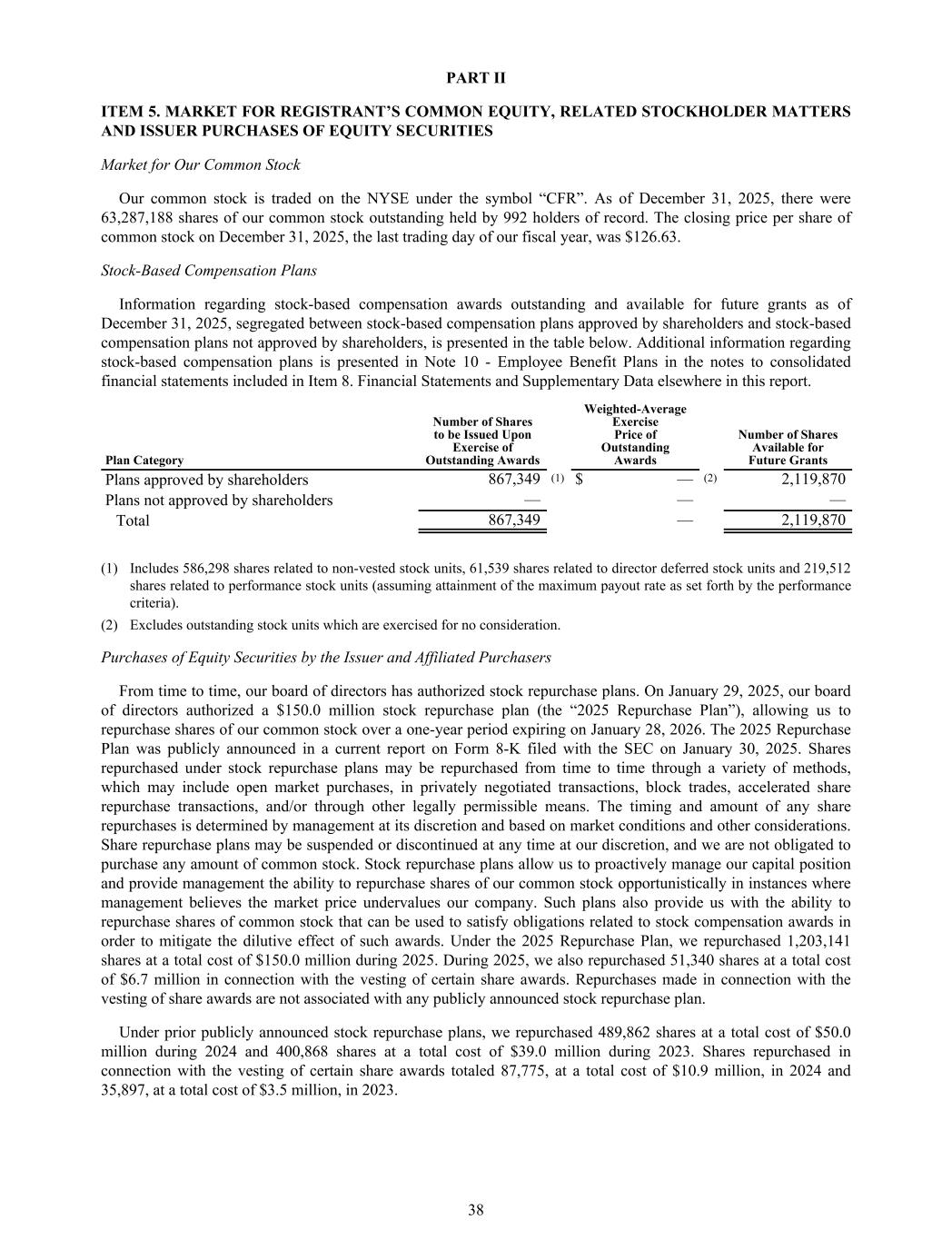 PART II ITEM 5. MARKET FOR REGISTRANT’S COMMON EQUITY, RELATED STOCKHOLDER MATTERS AND ISSUER PURCHASES OF EQUITY SECURITIES Market for Our Common Stock Our common stock is traded on the NYSE under the symbol “CFR”. As of December 31, 2025, there were 63,287,188 shares of our common stock outstanding held by 992 holders of record. The closing price per share of common stock on December 31, 2025, the last trading day of our fiscal year, was $126.63. Stock-Based Compensation Plans Information regarding stock-based compensation awards outstanding and available for future grants as of December 31, 2025, segregated between stock-based compensation plans approved by shareholders and stock-based compensation plans not approved by shareholders, is presented in the table below. Additional information regarding stock-based compensation plans is presented in Note 10 - Employee Benefit Plans in the notes to consolidated financial statements included in Item 8. Financial Statements and Supplementary Data elsewhere in this report. Plan Category Number of Shares to be Issued Upon Exercise of Outstanding Awards Weighted-Average Exercise Price of Outstanding Awards Number of Shares Available for Future Grants Plans approved by shareholders 867,349 (1) $ — (2) 2,119,870 Plans not approved by shareholders — — — Total 867,349 — 2,119,870 (1) Includes 586,298 shares related to non-vested stock units, 61,539 shares related to director deferred stock units and 219,512 shares related to performance stock units (assuming attainment of the maximum payout rate as set forth by the performance criteria). (2) Excludes outstanding stock units which are exercised for no consideration. Purchases of Equity Securities by the Issuer and Affiliated Purchasers From time to time, our board of directors has authorized stock repurchase plans. On January 29, 2025, our board of directors authorized a $150.0 million stock repurchase plan (the “2025 Repurchase Plan”), allowing us to repurchase shares of our common stock over a one-year period expiring on January 28, 2026. The 2025 Repurchase Plan was publicly announced in a current report on Form 8-K filed with the SEC on January 30, 2025. Shares repurchased under stock repurchase plans may be repurchased from time to time through a variety of methods, which may include open market purchases, in privately negotiated transactions, block trades, accelerated share repurchase transactions, and/or through other legally permissible means. The timing and amount of any share repurchases is determined by management at its discretion and based on market conditions and other considerations. Share repurchase plans may be suspended or discontinued at any time at our discretion, and we are not obligated to purchase any amount of common stock. Stock repurchase plans allow us to proactively manage our capital position and provide management the ability to repurchase shares of our common stock opportunistically in instances where management believes the market price undervalues our company. Such plans also provide us with the ability to repurchase shares of common stock that can be used to satisfy obligations related to stock compensation awards in order to mitigate the dilutive effect of such awards. Under the 2025 Repurchase Plan, we repurchased 1,203,141 shares at a total cost of $150.0 million during 2025. During 2025, we also repurchased 51,340 shares at a total cost of $6.7 million in connection with the vesting of certain share awards. Repurchases made in connection with the vesting of share awards are not associated with any publicly announced stock repurchase plan. Under prior publicly announced stock repurchase plans, we repurchased 489,862 shares at a total cost of $50.0 million during 2024 and 400,868 shares at a total cost of $39.0 million during 2023. Shares repurchased in connection with the vesting of certain share awards totaled 87,775, at a total cost of $10.9 million, in 2024 and 35,897, at a total cost of $3.5 million, in 2023. 38