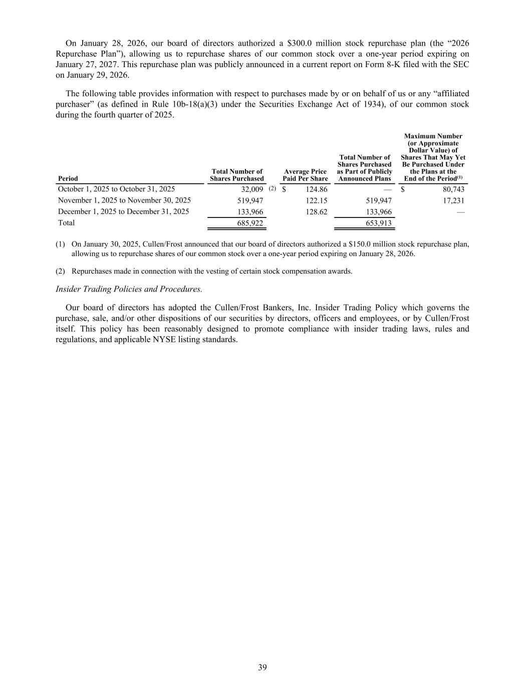 On January 28, 2026, our board of directors authorized a $300.0 million stock repurchase plan (the “2026 Repurchase Plan”), allowing us to repurchase shares of our common stock over a one-year period expiring on January 27, 2027. This repurchase plan was publicly announced in a current report on Form 8-K filed with the SEC on January 29, 2026. The following table provides information with respect to purchases made by or on behalf of us or any “affiliated purchaser” (as defined in Rule 10b-18(a)(3) under the Securities Exchange Act of 1934), of our common stock during the fourth quarter of 2025. Period Total Number of Shares Purchased Average Price Paid Per Share Total Number of Shares Purchased as Part of Publicly Announced Plans Maximum Number (or Approximate Dollar Value) of Shares That May Yet Be Purchased Under the Plans at the End of the Period(1) October 1, 2025 to October 31, 2025 32,009 (2) $ 124.86 — $ 80,743 November 1, 2025 to November 30, 2025 519,947 122.15 519,947 17,231 December 1, 2025 to December 31, 2025 133,966 128.62 133,966 — Total 685,922 653,913 (1) On January 30, 2025, Cullen/Frost announced that our board of directors authorized a $150.0 million stock repurchase plan, allowing us to repurchase shares of our common stock over a one-year period expiring on January 28, 2026. (2) Repurchases made in connection with the vesting of certain stock compensation awards. Insider Trading Policies and Procedures. Our board of directors has adopted the Cullen/Frost Bankers, Inc. Insider Trading Policy which governs the purchase, sale, and/or other dispositions of our securities by directors, officers and employees, or by Cullen/Frost itself. This policy has been reasonably designed to promote compliance with insider trading laws, rules and regulations, and applicable NYSE listing standards. 39