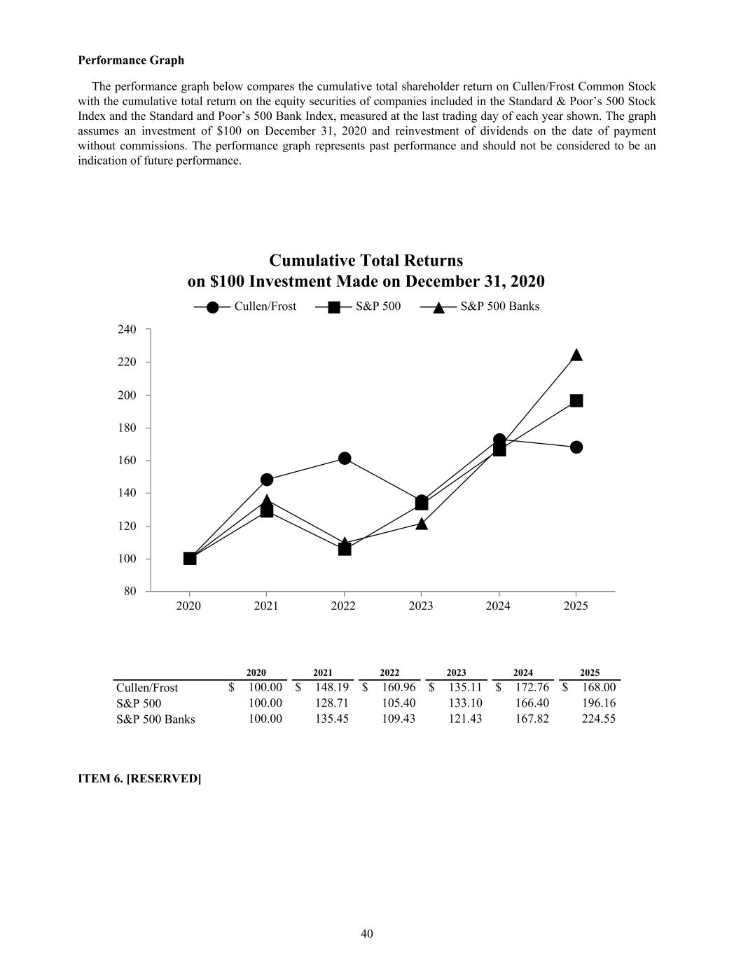 Performance Graph The performance graph below compares the cumulative total shareholder return on Cullen/Frost Common Stock with the cumulative total return on the equity securities of companies included in the Standard & Poor’s 500 Stock Index and the Standard and Poor’s 500 Bank Index, measured at the last trading day of each year shown. The graph assumes an investment of $100 on December 31, 2020 and reinvestment of dividends on the date of payment without commissions. The performance graph represents past performance and should not be considered to be an indication of future performance. Cumulative Total Returns on $100 Investment Made on December 31, 2020 Cullen/Frost S&P 500 S&P 500 Banks 2020 2021 2022 2023 2024 2025 80 100 120 140 160 180 200 220 240 2020 2021 2022 2023 2024 2025 Cullen/Frost $ 100.00 $ 148.19 $ 160.96 $ 135.11 $ 172.76 $ 168.00 S&P 500 100.00 128.71 105.40 133.10 166.40 196.16 S&P 500 Banks 100.00 135.45 109.43 121.43 167.82 224.55 ITEM 6. [RESERVED] 40