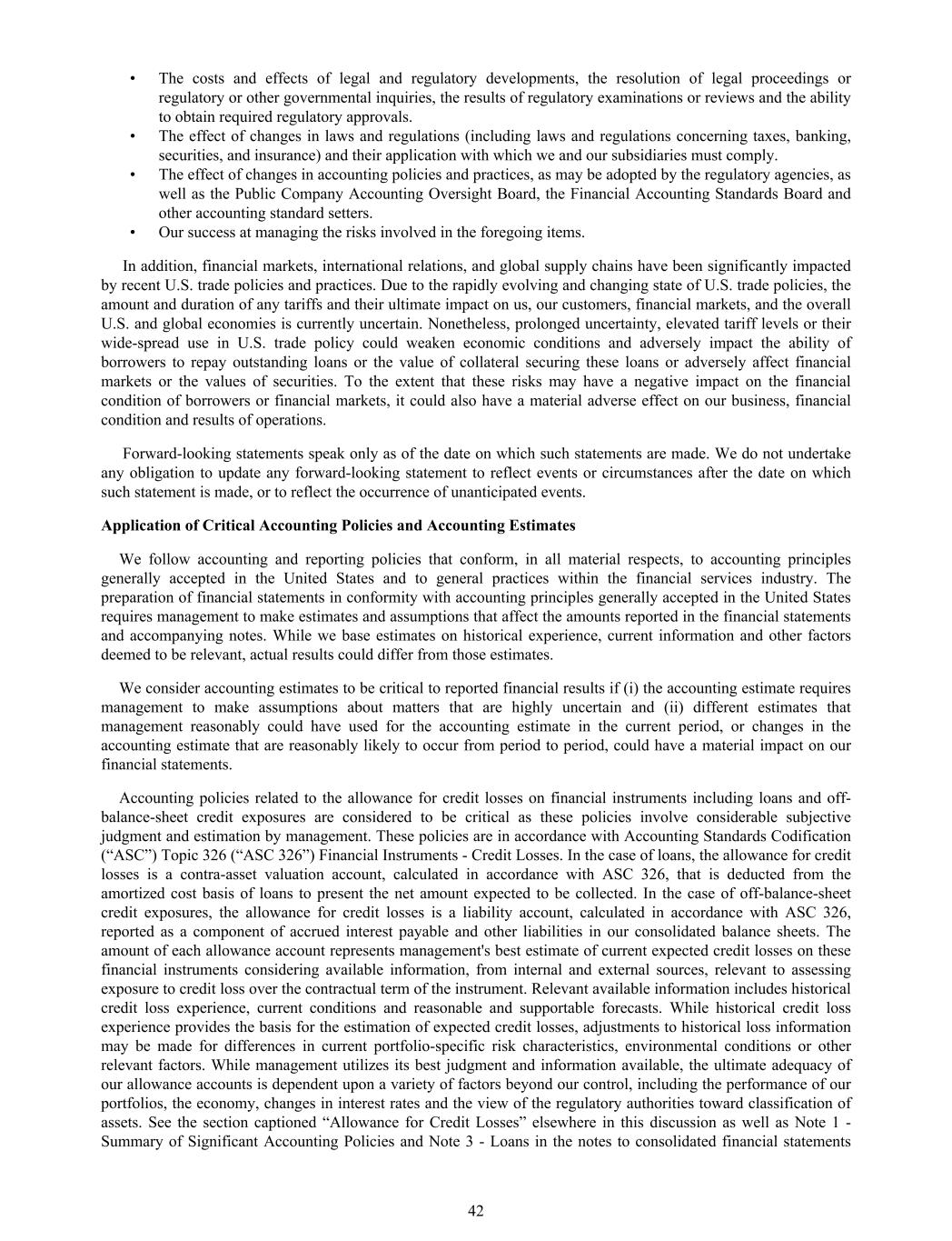 • The costs and effects of legal and regulatory developments, the resolution of legal proceedings or regulatory or other governmental inquiries, the results of regulatory examinations or reviews and the ability to obtain required regulatory approvals. • The effect of changes in laws and regulations (including laws and regulations concerning taxes, banking, securities, and insurance) and their application with which we and our subsidiaries must comply. • The effect of changes in accounting policies and practices, as may be adopted by the regulatory agencies, as well as the Public Company Accounting Oversight Board, the Financial Accounting Standards Board and other accounting standard setters. • Our success at managing the risks involved in the foregoing items. In addition, financial markets, international relations, and global supply chains have been significantly impacted by recent U.S. trade policies and practices. Due to the rapidly evolving and changing state of U.S. trade policies, the amount and duration of any tariffs and their ultimate impact on us, our customers, financial markets, and the overall U.S. and global economies is currently uncertain. Nonetheless, prolonged uncertainty, elevated tariff levels or their wide-spread use in U.S. trade policy could weaken economic conditions and adversely impact the ability of borrowers to repay outstanding loans or the value of collateral securing these loans or adversely affect financial markets or the values of securities. To the extent that these risks may have a negative impact on the financial condition of borrowers or financial markets, it could also have a material adverse effect on our business, financial condition and results of operations. Forward-looking statements speak only as of the date on which such statements are made. We do not undertake any obligation to update any forward-looking statement to reflect events or circumstances after the date on which such statement is made, or to reflect the occurrence of unanticipated events. Application of Critical Accounting Policies and Accounting Estimates We follow accounting and reporting policies that conform, in all material respects, to accounting principles generally accepted in the United States and to general practices within the financial services industry. The preparation of financial statements in conformity with accounting principles generally accepted in the United States requires management to make estimates and assumptions that affect the amounts reported in the financial statements and accompanying notes. While we base estimates on historical experience, current information and other factors deemed to be relevant, actual results could differ from those estimates. We consider accounting estimates to be critical to reported financial results if (i) the accounting estimate requires management to make assumptions about matters that are highly uncertain and (ii) different estimates that management reasonably could have used for the accounting estimate in the current period, or changes in the accounting estimate that are reasonably likely to occur from period to period, could have a material impact on our financial statements. Accounting policies related to the allowance for credit losses on financial instruments including loans and off- balance-sheet credit exposures are considered to be critical as these policies involve considerable subjective judgment and estimation by management. These policies are in accordance with Accounting Standards Codification (“ASC”) Topic 326 (“ASC 326”) Financial Instruments - Credit Losses. In the case of loans, the allowance for credit losses is a contra-asset valuation account, calculated in accordance with ASC 326, that is deducted from the amortized cost basis of loans to present the net amount expected to be collected. In the case of off-balance-sheet credit exposures, the allowance for credit losses is a liability account, calculated in accordance with ASC 326, reported as a component of accrued interest payable and other liabilities in our consolidated balance sheets. The amount of each allowance account represents management's best estimate of current expected credit losses on these financial instruments considering available information, from internal and external sources, relevant to assessing exposure to credit loss over the contractual term of the instrument. Relevant available information includes historical credit loss experience, current conditions and reasonable and supportable forecasts. While historical credit loss experience provides the basis for the estimation of expected credit losses, adjustments to historical loss information may be made for differences in current portfolio-specific risk characteristics, environmental conditions or other relevant factors. While management utilizes its best judgment and information available, the ultimate adequacy of our allowance accounts is dependent upon a variety of factors beyond our control, including the performance of our portfolios, the economy, changes in interest rates and the view of the regulatory authorities toward classification of assets. See the section captioned “Allowance for Credit Losses” elsewhere in this discussion as well as Note 1 - Summary of Significant Accounting Policies and Note 3 - Loans in the notes to consolidated financial statements 42