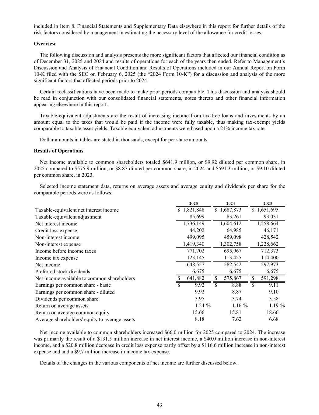 included in Item 8. Financial Statements and Supplementary Data elsewhere in this report for further details of the risk factors considered by management in estimating the necessary level of the allowance for credit losses. Overview The following discussion and analysis presents the more significant factors that affected our financial condition as of December 31, 2025 and 2024 and results of operations for each of the years then ended. Refer to Management’s Discussion and Analysis of Financial Condition and Results of Operations included in our Annual Report on Form 10-K filed with the SEC on February 6, 2025 (the “2024 Form 10-K”) for a discussion and analysis of the more significant factors that affected periods prior to 2024. Certain reclassifications have been made to make prior periods comparable. This discussion and analysis should be read in conjunction with our consolidated financial statements, notes thereto and other financial information appearing elsewhere in this report. Taxable-equivalent adjustments are the result of increasing income from tax-free loans and investments by an amount equal to the taxes that would be paid if the income were fully taxable, thus making tax-exempt yields comparable to taxable asset yields. Taxable equivalent adjustments were based upon a 21% income tax rate. Dollar amounts in tables are stated in thousands, except for per share amounts. Results of Operations Net income available to common shareholders totaled $641.9 million, or $9.92 diluted per common share, in 2025 compared to $575.9 million, or $8.87 diluted per common share, in 2024 and $591.3 million, or $9.10 diluted per common share, in 2023. Selected income statement data, returns on average assets and average equity and dividends per share for the comparable periods were as follows: 2025 2024 2023 Taxable-equivalent net interest income $ 1,821,848 $ 1,687,873 $ 1,651,695 Taxable-equivalent adjustment 85,699 83,261 93,031 Net interest income 1,736,149 1,604,612 1,558,664 Credit loss expense 44,202 64,985 46,171 Non-interest income 499,095 459,098 428,542 Non-interest expense 1,419,340 1,302,758 1,228,662 Income before income taxes 771,702 695,967 712,373 Income tax expense 123,145 113,425 114,400 Net income 648,557 582,542 597,973 Preferred stock dividends 6,675 6,675 6,675 Net income available to common shareholders $ 641,882 $ 575,867 $ 591,298 Earnings per common share - basic $ 9.92 $ 8.88 $ 9.11 Earnings per common share - diluted 9.92 8.87 9.10 Dividends per common share 3.95 3.74 3.58 Return on average assets 1.24 % 1.16 % 1.19 % Return on average common equity 15.66 15.81 18.66 Average shareholders' equity to average assets 8.18 7.62 6.68 Net income available to common shareholders increased $66.0 million for 2025 compared to 2024. The increase was primarily the result of a $131.5 million increase in net interest income, a $40.0 million increase in non-interest income, and a $20.8 million decrease in credit loss expense partly offset by a $116.6 million increase in non-interest expense and and a $9.7 million increase in income tax expense. Details of the changes in the various components of net income are further discussed below. 43