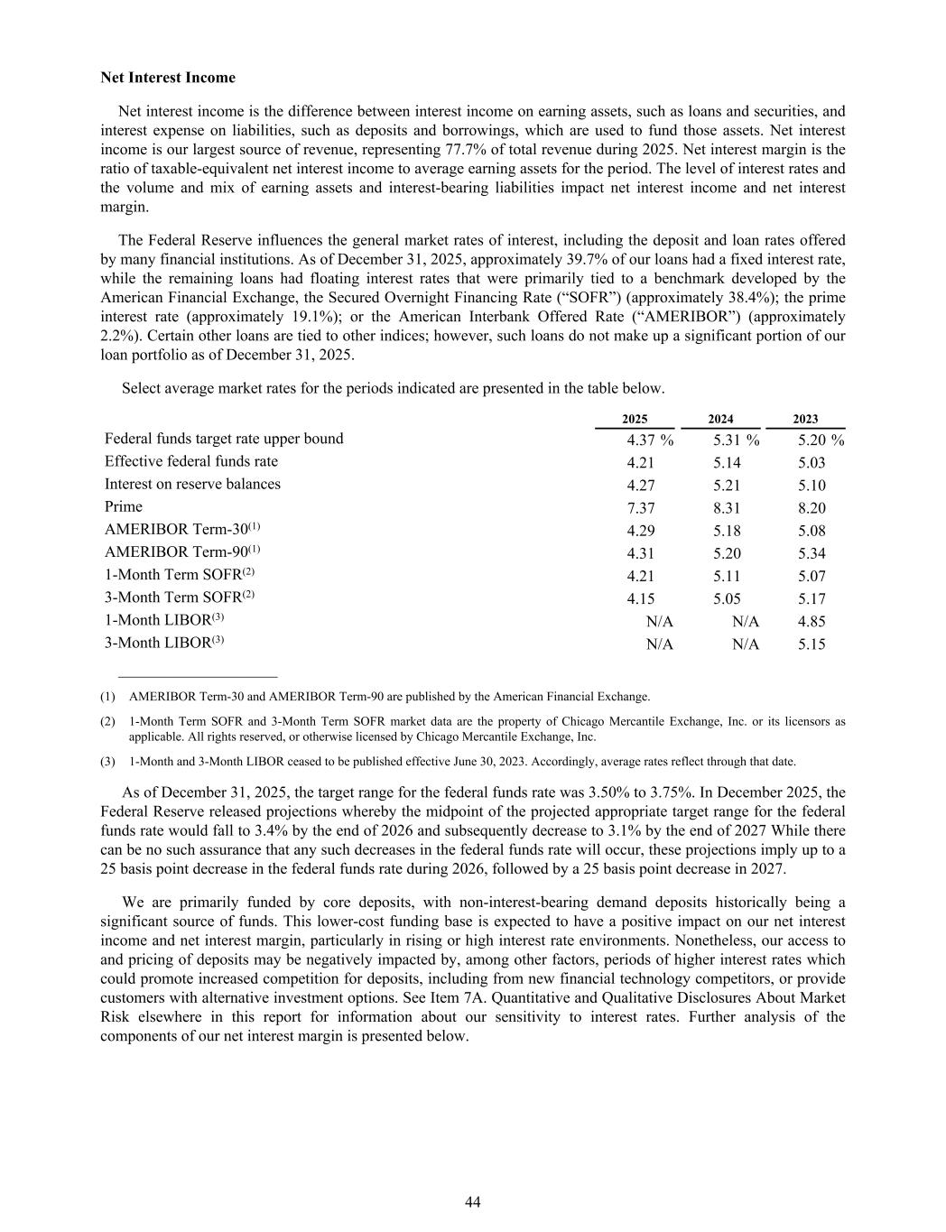 Net Interest Income Net interest income is the difference between interest income on earning assets, such as loans and securities, and interest expense on liabilities, such as deposits and borrowings, which are used to fund those assets. Net interest income is our largest source of revenue, representing 77.7% of total revenue during 2025. Net interest margin is the ratio of taxable-equivalent net interest income to average earning assets for the period. The level of interest rates and the volume and mix of earning assets and interest-bearing liabilities impact net interest income and net interest margin. The Federal Reserve influences the general market rates of interest, including the deposit and loan rates offered by many financial institutions. As of December 31, 2025, approximately 39.7% of our loans had a fixed interest rate, while the remaining loans had floating interest rates that were primarily tied to a benchmark developed by the American Financial Exchange, the Secured Overnight Financing Rate (“SOFR”) (approximately 38.4%); the prime interest rate (approximately 19.1%); or the American Interbank Offered Rate (“AMERIBOR”) (approximately 2.2%). Certain other loans are tied to other indices; however, such loans do not make up a significant portion of our loan portfolio as of December 31, 2025. Select average market rates for the periods indicated are presented in the table below. 2025 2024 2023 Federal funds target rate upper bound 4.37 % 5.31 % 5.20 % Effective federal funds rate 4.21 5.14 5.03 Interest on reserve balances 4.27 5.21 5.10 Prime 7.37 8.31 8.20 AMERIBOR Term-30(1) 4.29 5.18 5.08 AMERIBOR Term-90(1) 4.31 5.20 5.34 1-Month Term SOFR(2) 4.21 5.11 5.07 3-Month Term SOFR(2) 4.15 5.05 5.17 1-Month LIBOR(3) N/A N/A 4.85 3-Month LIBOR(3) N/A N/A 5.15 ____________________ (1) AMERIBOR Term-30 and AMERIBOR Term-90 are published by the American Financial Exchange. (2) 1-Month Term SOFR and 3-Month Term SOFR market data are the property of Chicago Mercantile Exchange, Inc. or its licensors as applicable. All rights reserved, or otherwise licensed by Chicago Mercantile Exchange, Inc. (3) 1-Month and 3-Month LIBOR ceased to be published effective June 30, 2023. Accordingly, average rates reflect through that date. As of December 31, 2025, the target range for the federal funds rate was 3.50% to 3.75%. In December 2025, the Federal Reserve released projections whereby the midpoint of the projected appropriate target range for the federal funds rate would fall to 3.4% by the end of 2026 and subsequently decrease to 3.1% by the end of 2027 While there can be no such assurance that any such decreases in the federal funds rate will occur, these projections imply up to a 25 basis point decrease in the federal funds rate during 2026, followed by a 25 basis point decrease in 2027. We are primarily funded by core deposits, with non-interest-bearing demand deposits historically being a significant source of funds. This lower-cost funding base is expected to have a positive impact on our net interest income and net interest margin, particularly in rising or high interest rate environments. Nonetheless, our access to and pricing of deposits may be negatively impacted by, among other factors, periods of higher interest rates which could promote increased competition for deposits, including from new financial technology competitors, or provide customers with alternative investment options. See Item 7A. Quantitative and Qualitative Disclosures About Market Risk elsewhere in this report for information about our sensitivity to interest rates. Further analysis of the components of our net interest margin is presented below. 44