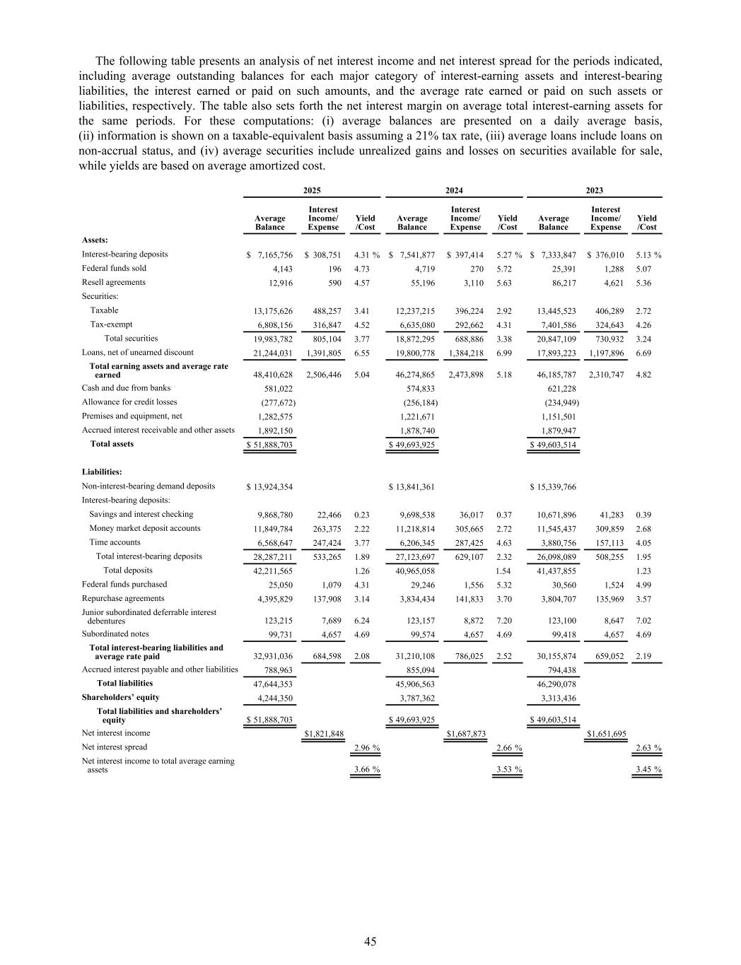 The following table presents an analysis of net interest income and net interest spread for the periods indicated, including average outstanding balances for each major category of interest-earning assets and interest-bearing liabilities, the interest earned or paid on such amounts, and the average rate earned or paid on such assets or liabilities, respectively. The table also sets forth the net interest margin on average total interest-earning assets for the same periods. For these computations: (i) average balances are presented on a daily average basis, (ii) information is shown on a taxable-equivalent basis assuming a 21% tax rate, (iii) average loans include loans on non-accrual status, and (iv) average securities include unrealized gains and losses on securities available for sale, while yields are based on average amortized cost. 2025 2024 2023 Average Balance Interest Income/ Expense Yield /Cost Average Balance Interest Income/ Expense Yield /Cost Average Balance Interest Income/ Expense Yield /Cost Assets: Interest-bearing deposits $ 7,165,756 $ 308,751 4.31 % $ 7,541,877 $ 397,414 5.27 % $ 7,333,847 $ 376,010 5.13 % Federal funds sold 4,143 196 4.73 4,719 270 5.72 25,391 1,288 5.07 Resell agreements 12,916 590 4.57 55,196 3,110 5.63 86,217 4,621 5.36 Securities: Taxable 13,175,626 488,257 3.41 12,237,215 396,224 2.92 13,445,523 406,289 2.72 Tax-exempt 6,808,156 316,847 4.52 6,635,080 292,662 4.31 7,401,586 324,643 4.26 Total securities 19,983,782 805,104 3.77 18,872,295 688,886 3.38 20,847,109 730,932 3.24 Loans, net of unearned discount 21,244,031 1,391,805 6.55 19,800,778 1,384,218 6.99 17,893,223 1,197,896 6.69 Total earning assets and average rate earned 48,410,628 2,506,446 5.04 46,274,865 2,473,898 5.18 46,185,787 2,310,747 4.82 Cash and due from banks 581,022 574,833 621,228 Allowance for credit losses (277,672) (256,184) (234,949) Premises and equipment, net 1,282,575 1,221,671 1,151,501 Accrued interest receivable and other assets 1,892,150 1,878,740 1,879,947 Total assets $ 51,888,703 $ 49,693,925 $ 49,603,514 Liabilities: Non-interest-bearing demand deposits $ 13,924,354 $ 13,841,361 $ 15,339,766 Interest-bearing deposits: Savings and interest checking 9,868,780 22,466 0.23 9,698,538 36,017 0.37 10,671,896 41,283 0.39 Money market deposit accounts 11,849,784 263,375 2.22 11,218,814 305,665 2.72 11,545,437 309,859 2.68 Time accounts 6,568,647 247,424 3.77 6,206,345 287,425 4.63 3,880,756 157,113 4.05 Total interest-bearing deposits 28,287,211 533,265 1.89 27,123,697 629,107 2.32 26,098,089 508,255 1.95 Total deposits 42,211,565 1.26 40,965,058 1.54 41,437,855 1.23 Federal funds purchased 25,050 1,079 4.31 29,246 1,556 5.32 30,560 1,524 4.99 Repurchase agreements 4,395,829 137,908 3.14 3,834,434 141,833 3.70 3,804,707 135,969 3.57 Junior subordinated deferrable interest debentures 123,215 7,689 6.24 123,157 8,872 7.20 123,100 8,647 7.02 Subordinated notes 99,731 4,657 4.69 99,574 4,657 4.69 99,418 4,657 4.69 Total interest-bearing liabilities and average rate paid 32,931,036 684,598 2.08 31,210,108 786,025 2.52 30,155,874 659,052 2.19 Accrued interest payable and other liabilities 788,963 855,094 794,438 Total liabilities 47,644,353 45,906,563 46,290,078 Shareholders’ equity 4,244,350 3,787,362 3,313,436 Total liabilities and shareholders’ equity $ 51,888,703 $ 49,693,925 $ 49,603,514 Net interest income $1,821,848 $1,687,873 $1,651,695 Net interest spread 2.96 % 2.66 % 2.63 % Net interest income to total average earning assets 3.66 % 3.53 % 3.45 % 45