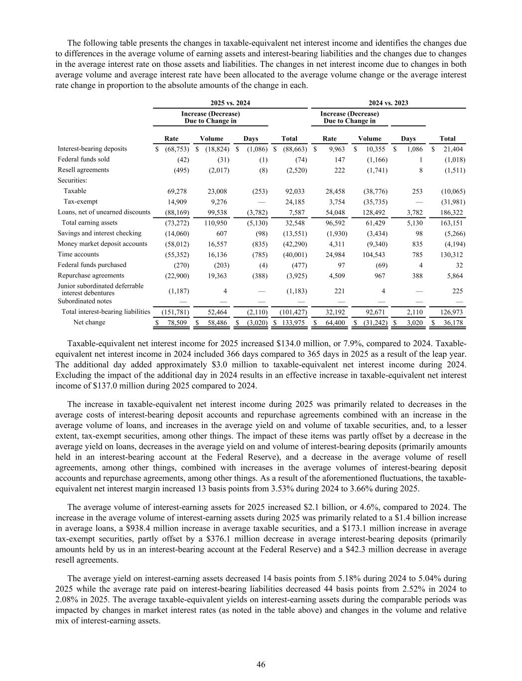 The following table presents the changes in taxable-equivalent net interest income and identifies the changes due to differences in the average volume of earning assets and interest-bearing liabilities and the changes due to changes in the average interest rate on those assets and liabilities. The changes in net interest income due to changes in both average volume and average interest rate have been allocated to the average volume change or the average interest rate change in proportion to the absolute amounts of the change in each. 2025 vs. 2024 2024 vs. 2023 Increase (Decrease) Due to Change in Increase (Decrease) Due to Change in Rate Volume Days Total Rate Volume Days Total Interest-bearing deposits $ (68,753) $ (18,824) $ (1,086) $ (88,663) $ 9,963 $ 10,355 $ 1,086 $ 21,404 Federal funds sold (42) (31) (1) (74) 147 (1,166) 1 (1,018) Resell agreements (495) (2,017) (8) (2,520) 222 (1,741) 8 (1,511) Securities: Taxable 69,278 23,008 (253) 92,033 28,458 (38,776) 253 (10,065) Tax-exempt 14,909 9,276 — 24,185 3,754 (35,735) — (31,981) Loans, net of unearned discounts (88,169) 99,538 (3,782) 7,587 54,048 128,492 3,782 186,322 Total earning assets (73,272) 110,950 (5,130) 32,548 96,592 61,429 5,130 163,151 Savings and interest checking (14,060) 607 (98) (13,551) (1,930) (3,434) 98 (5,266) Money market deposit accounts (58,012) 16,557 (835) (42,290) 4,311 (9,340) 835 (4,194) Time accounts (55,352) 16,136 (785) (40,001) 24,984 104,543 785 130,312 Federal funds purchased (270) (203) (4) (477) 97 (69) 4 32 Repurchase agreements (22,900) 19,363 (388) (3,925) 4,509 967 388 5,864 Junior subordinated deferrable interest debentures (1,187) 4 — (1,183) 221 4 — 225 Subordinated notes — — — — — — — — Total interest-bearing liabilities (151,781) 52,464 (2,110) (101,427) 32,192 92,671 2,110 126,973 Net change $ 78,509 $ 58,486 $ (3,020) $ 133,975 $ 64,400 $ (31,242) $ 3,020 $ 36,178 Taxable-equivalent net interest income for 2025 increased $134.0 million, or 7.9%, compared to 2024. Taxable- equivalent net interest income in 2024 included 366 days compared to 365 days in 2025 as a result of the leap year. The additional day added approximately $3.0 million to taxable-equivalent net interest income during 2024. Excluding the impact of the additional day in 2024 results in an effective increase in taxable-equivalent net interest income of $137.0 million during 2025 compared to 2024. The increase in taxable-equivalent net interest income during 2025 was primarily related to decreases in the average costs of interest-bearing deposit accounts and repurchase agreements combined with an increase in the average volume of loans, and increases in the average yield on and volume of taxable securities, and, to a lesser extent, tax-exempt securities, among other things. The impact of these items was partly offset by a decrease in the average yield on loans, decreases in the average yield on and volume of interest-bearing deposits (primarily amounts held in an interest-bearing account at the Federal Reserve), and a decrease in the average volume of resell agreements, among other things, combined with increases in the average volumes of interest-bearing deposit accounts and repurchase agreements, among other things. As a result of the aforementioned fluctuations, the taxable- equivalent net interest margin increased 13 basis points from 3.53% during 2024 to 3.66% during 2025. The average volume of interest-earning assets for 2025 increased $2.1 billion, or 4.6%, compared to 2024. The increase in the average volume of interest-earning assets during 2025 was primarily related to a $1.4 billion increase in average loans, a $938.4 million increase in average taxable securities, and a $173.1 million increase in average tax-exempt securities, partly offset by a $376.1 million decrease in average interest-bearing deposits (primarily amounts held by us in an interest-bearing account at the Federal Reserve) and a $42.3 million decrease in average resell agreements. The average yield on interest-earning assets decreased 14 basis points from 5.18% during 2024 to 5.04% during 2025 while the average rate paid on interest-bearing liabilities decreased 44 basis points from 2.52% in 2024 to 2.08% in 2025. The average taxable-equivalent yields on interest-earning assets during the comparable periods was impacted by changes in market interest rates (as noted in the table above) and changes in the volume and relative mix of interest-earning assets. 46