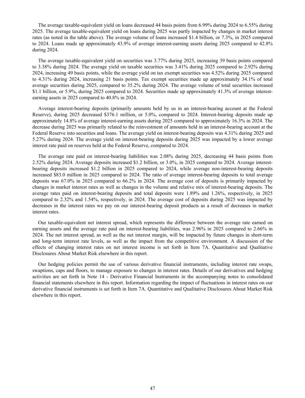 The average taxable-equivalent yield on loans decreased 44 basis points from 6.99% during 2024 to 6.55% during 2025. The average taxable-equivalent yield on loans during 2025 was partly impacted by changes in market interest rates (as noted in the table above). The average volume of loans increased $1.4 billion, or 7.3%, in 2025 compared to 2024. Loans made up approximately 43.9% of average interest-earning assets during 2025 compared to 42.8% during 2024. The average taxable-equivalent yield on securities was 3.77% during 2025, increasing 39 basis points compared to 3.38% during 2024. The average yield on taxable securities was 3.41% during 2025 compared to 2.92% during 2024, increasing 49 basis points, while the average yield on tax exempt securities was 4.52% during 2025 compared to 4.31% during 2024, increasing 21 basis points. Tax exempt securities made up approximately 34.1% of total average securities during 2025, compared to 35.2% during 2024. The average volume of total securities increased $1.1 billion, or 5.9%, during 2025 compared to 2024. Securities made up approximately 41.3% of average interest- earning assets in 2025 compared to 40.8% in 2024. Average interest-bearing deposits (primarily amounts held by us in an interest-bearing account at the Federal Reserve), during 2025 decreased $376.1 million, or 5.0%, compared to 2024. Interest-bearing deposits made up approximately 14.8% of average interest-earning assets during 2025 compared to approximately 16.3% in 2024. The decrease during 2025 was primarily related to the reinvestment of amounts held in an interest-bearing account at the Federal Reserve into securities and loans. The average yield on interest-bearing deposits was 4.31% during 2025 and 5.27% during 2024. The average yield on interest-bearing deposits during 2025 was impacted by a lower average interest rate paid on reserves held at the Federal Reserve, compared to 2024. The average rate paid on interest-bearing liabilities was 2.08% during 2025, decreasing 44 basis points from 2.52% during 2024. Average deposits increased $1.2 billion, or 3.0%, in 2025 compared to 2024. Average interest- bearing deposits increased $1.2 billion in 2025 compared to 2024, while average non-interest-bearing deposits increased $83.0 million in 2025 compared to 2024. The ratio of average interest-bearing deposits to total average deposits was 67.0% in 2025 compared to 66.2% in 2024. The average cost of deposits is primarily impacted by changes in market interest rates as well as changes in the volume and relative mix of interest-bearing deposits. The average rates paid on interest-bearing deposits and total deposits were 1.89% and 1.26%, respectively, in 2025 compared to 2.32% and 1.54%, respectively, in 2024. The average cost of deposits during 2025 was impacted by decreases in the interest rates we pay on our interest-bearing deposit products as a result of decreases in market interest rates. Our taxable-equivalent net interest spread, which represents the difference between the average rate earned on earning assets and the average rate paid on interest-bearing liabilities, was 2.96% in 2025 compared to 2.66% in 2024. The net interest spread, as well as the net interest margin, will be impacted by future changes in short-term and long-term interest rate levels, as well as the impact from the competitive environment. A discussion of the effects of changing interest rates on net interest income is set forth in Item 7A. Quantitative and Qualitative Disclosures About Market Risk elsewhere in this report. Our hedging policies permit the use of various derivative financial instruments, including interest rate swaps, swaptions, caps and floors, to manage exposure to changes in interest rates. Details of our derivatives and hedging activities are set forth in Note 14 - Derivative Financial Instruments in the accompanying notes to consolidated financial statements elsewhere in this report. Information regarding the impact of fluctuations in interest rates on our derivative financial instruments is set forth in Item 7A. Quantitative and Qualitative Disclosures About Market Risk elsewhere in this report. 47