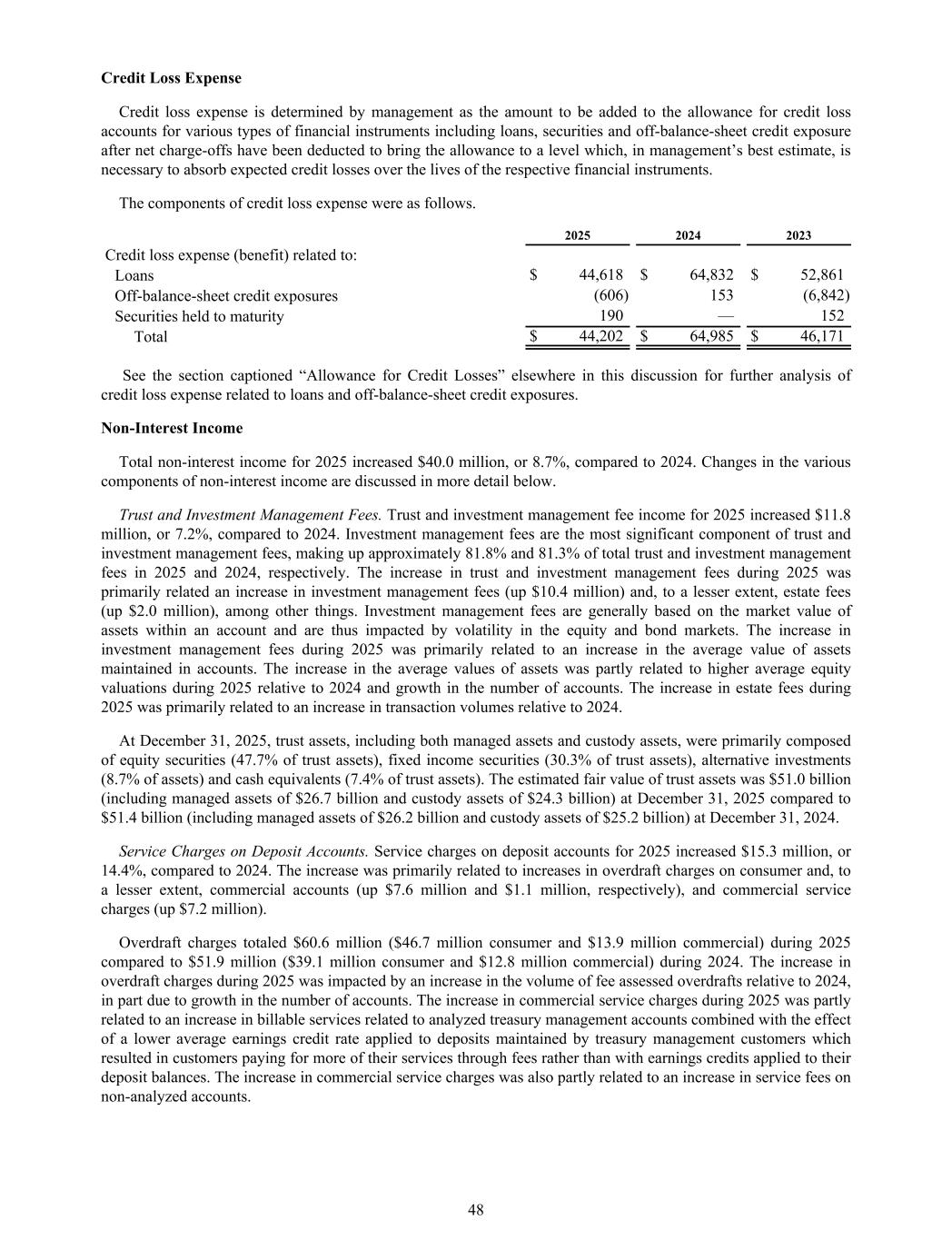 Credit Loss Expense Credit loss expense is determined by management as the amount to be added to the allowance for credit loss accounts for various types of financial instruments including loans, securities and off-balance-sheet credit exposure after net charge-offs have been deducted to bring the allowance to a level which, in management’s best estimate, is necessary to absorb expected credit losses over the lives of the respective financial instruments. The components of credit loss expense were as follows. 2025 2024 2023 Credit loss expense (benefit) related to: Loans $ 44,618 $ 64,832 $ 52,861 Off-balance-sheet credit exposures (606) 153 (6,842) Securities held to maturity 190 — 152 Total $ 44,202 $ 64,985 $ 46,171 See the section captioned “Allowance for Credit Losses” elsewhere in this discussion for further analysis of credit loss expense related to loans and off-balance-sheet credit exposures. Non-Interest Income Total non-interest income for 2025 increased $40.0 million, or 8.7%, compared to 2024. Changes in the various components of non-interest income are discussed in more detail below. Trust and Investment Management Fees. Trust and investment management fee income for 2025 increased $11.8 million, or 7.2%, compared to 2024. Investment management fees are the most significant component of trust and investment management fees, making up approximately 81.8% and 81.3% of total trust and investment management fees in 2025 and 2024, respectively. The increase in trust and investment management fees during 2025 was primarily related an increase in investment management fees (up $10.4 million) and, to a lesser extent, estate fees (up $2.0 million), among other things. Investment management fees are generally based on the market value of assets within an account and are thus impacted by volatility in the equity and bond markets. The increase in investment management fees during 2025 was primarily related to an increase in the average value of assets maintained in accounts. The increase in the average values of assets was partly related to higher average equity valuations during 2025 relative to 2024 and growth in the number of accounts. The increase in estate fees during 2025 was primarily related to an increase in transaction volumes relative to 2024. At December 31, 2025, trust assets, including both managed assets and custody assets, were primarily composed of equity securities (47.7% of trust assets), fixed income securities (30.3% of trust assets), alternative investments (8.7% of assets) and cash equivalents (7.4% of trust assets). The estimated fair value of trust assets was $51.0 billion (including managed assets of $26.7 billion and custody assets of $24.3 billion) at December 31, 2025 compared to $51.4 billion (including managed assets of $26.2 billion and custody assets of $25.2 billion) at December 31, 2024. Service Charges on Deposit Accounts. Service charges on deposit accounts for 2025 increased $15.3 million, or 14.4%, compared to 2024. The increase was primarily related to increases in overdraft charges on consumer and, to a lesser extent, commercial accounts (up $7.6 million and $1.1 million, respectively), and commercial service charges (up $7.2 million). Overdraft charges totaled $60.6 million ($46.7 million consumer and $13.9 million commercial) during 2025 compared to $51.9 million ($39.1 million consumer and $12.8 million commercial) during 2024. The increase in overdraft charges during 2025 was impacted by an increase in the volume of fee assessed overdrafts relative to 2024, in part due to growth in the number of accounts. The increase in commercial service charges during 2025 was partly related to an increase in billable services related to analyzed treasury management accounts combined with the effect of a lower average earnings credit rate applied to deposits maintained by treasury management customers which resulted in customers paying for more of their services through fees rather than with earnings credits applied to their deposit balances. The increase in commercial service charges was also partly related to an increase in service fees on non-analyzed accounts. 48