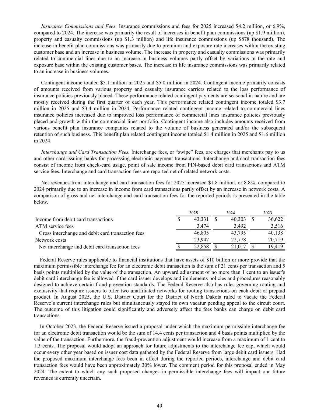 Insurance Commissions and Fees. Insurance commissions and fees for 2025 increased $4.2 million, or 6.9%, compared to 2024. The increase was primarily the result of increases in benefit plan commissions (up $1.9 million), property and casualty commissions (up $1.3 million) and life insurance commissions (up $878 thousand). The increase in benefit plan commissions was primarily due to premium and exposure rate increases within the existing customer base and an increase in business volume. The increase in property and casualty commissions was primarily related to commercial lines due to an increase in business volumes partly offset by variations in the rate and exposure base within the existing customer bases. The increase in life insurance commissions was primarily related to an increase in business volumes. Contingent income totaled $5.1 million in 2025 and $5.0 million in 2024. Contingent income primarily consists of amounts received from various property and casualty insurance carriers related to the loss performance of insurance policies previously placed. These performance related contingent payments are seasonal in nature and are mostly received during the first quarter of each year. This performance related contingent income totaled $3.7 million in 2025 and $3.4 million in 2024. Performance related contingent income related to commercial lines insurance policies increased due to improved loss performance of commercial lines insurance policies previously placed and growth within the commercial lines portfolio. Contingent income also includes amounts received from various benefit plan insurance companies related to the volume of business generated and/or the subsequent retention of such business. This benefit plan related contingent income totaled $1.4 million in 2025 and $1.6 million in 2024. Interchange and Card Transaction Fees. Interchange fees, or “swipe” fees, are charges that merchants pay to us and other card-issuing banks for processing electronic payment transactions. Interchange and card transaction fees consist of income from check-card usage, point of sale income from PIN-based debit card transactions and ATM service fees. Interchange and card transaction fees are reported net of related network costs. Net revenues from interchange and card transaction fees for 2025 increased $1.8 million, or 8.8%, compared to 2024 primarily due to an increase in income from card transactions partly offset by an increase in network costs. A comparison of gross and net interchange and card transaction fees for the reported periods is presented in the table below. 2025 2024 2023 Income from debit card transactions $ 43,331 $ 40,303 $ 36,622 ATM service fees 3,474 3,492 3,516 Gross interchange and debit card transaction fees 46,805 43,795 40,138 Network costs 23,947 22,778 20,719 Net interchange and debit card transaction fees $ 22,858 $ 21,017 $ 19,419 Federal Reserve rules applicable to financial institutions that have assets of $10 billion or more provide that the maximum permissible interchange fee for an electronic debit transaction is the sum of 21 cents per transaction and 5 basis points multiplied by the value of the transaction. An upward adjustment of no more than 1 cent to an issuer's debit card interchange fee is allowed if the card issuer develops and implements policies and procedures reasonably designed to achieve certain fraud-prevention standards. The Federal Reserve also has rules governing routing and exclusivity that require issuers to offer two unaffiliated networks for routing transactions on each debit or prepaid product. In August 2025, the U.S. District Court for the District of North Dakota ruled to vacate the Federal Reserve’s current interchange rules but simultaneously stayed its own vacatur pending appeal to the circuit court. The outcome of this litigation could significantly and adversely affect the fees banks can charge on debit card transactions. In October 2023, the Federal Reserve issued a proposal under which the maximum permissible interchange fee for an electronic debit transaction would be the sum of 14.4 cents per transaction and 4 basis points multiplied by the value of the transaction. Furthermore, the fraud-prevention adjustment would increase from a maximum of 1 cent to 1.3 cents. The proposal would adopt an approach for future adjustments to the interchange fee cap, which would occur every other year based on issuer cost data gathered by the Federal Reserve from large debit card issuers. Had the proposed maximum interchange fees been in effect during the reported periods, interchange and debit card transaction fees would have been approximately 30% lower. The comment period for this proposal ended in May 2024. The extent to which any such proposed changes in permissible interchange fees will impact our future revenues is currently uncertain. 49