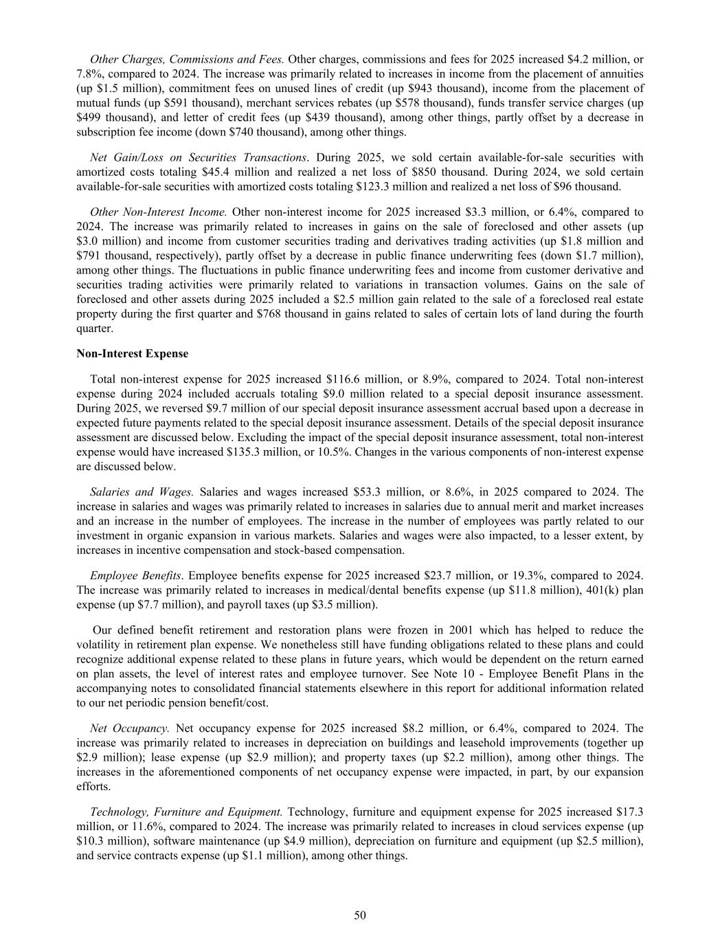Other Charges, Commissions and Fees. Other charges, commissions and fees for 2025 increased $4.2 million, or 7.8%, compared to 2024. The increase was primarily related to increases in income from the placement of annuities (up $1.5 million), commitment fees on unused lines of credit (up $943 thousand), income from the placement of mutual funds (up $591 thousand), merchant services rebates (up $578 thousand), funds transfer service charges (up $499 thousand), and letter of credit fees (up $439 thousand), among other things, partly offset by a decrease in subscription fee income (down $740 thousand), among other things. Net Gain/Loss on Securities Transactions. During 2025, we sold certain available-for-sale securities with amortized costs totaling $45.4 million and realized a net loss of $850 thousand. During 2024, we sold certain available-for-sale securities with amortized costs totaling $123.3 million and realized a net loss of $96 thousand. Other Non-Interest Income. Other non-interest income for 2025 increased $3.3 million, or 6.4%, compared to 2024. The increase was primarily related to increases in gains on the sale of foreclosed and other assets (up $3.0 million) and income from customer securities trading and derivatives trading activities (up $1.8 million and $791 thousand, respectively), partly offset by a decrease in public finance underwriting fees (down $1.7 million), among other things. The fluctuations in public finance underwriting fees and income from customer derivative and securities trading activities were primarily related to variations in transaction volumes. Gains on the sale of foreclosed and other assets during 2025 included a $2.5 million gain related to the sale of a foreclosed real estate property during the first quarter and $768 thousand in gains related to sales of certain lots of land during the fourth quarter. Non-Interest Expense Total non-interest expense for 2025 increased $116.6 million, or 8.9%, compared to 2024. Total non-interest expense during 2024 included accruals totaling $9.0 million related to a special deposit insurance assessment. During 2025, we reversed $9.7 million of our special deposit insurance assessment accrual based upon a decrease in expected future payments related to the special deposit insurance assessment. Details of the special deposit insurance assessment are discussed below. Excluding the impact of the special deposit insurance assessment, total non-interest expense would have increased $135.3 million, or 10.5%. Changes in the various components of non-interest expense are discussed below. Salaries and Wages. Salaries and wages increased $53.3 million, or 8.6%, in 2025 compared to 2024. The increase in salaries and wages was primarily related to increases in salaries due to annual merit and market increases and an increase in the number of employees. The increase in the number of employees was partly related to our investment in organic expansion in various markets. Salaries and wages were also impacted, to a lesser extent, by increases in incentive compensation and stock-based compensation. Employee Benefits. Employee benefits expense for 2025 increased $23.7 million, or 19.3%, compared to 2024. The increase was primarily related to increases in medical/dental benefits expense (up $11.8 million), 401(k) plan expense (up $7.7 million), and payroll taxes (up $3.5 million). Our defined benefit retirement and restoration plans were frozen in 2001 which has helped to reduce the volatility in retirement plan expense. We nonetheless still have funding obligations related to these plans and could recognize additional expense related to these plans in future years, which would be dependent on the return earned on plan assets, the level of interest rates and employee turnover. See Note 10 - Employee Benefit Plans in the accompanying notes to consolidated financial statements elsewhere in this report for additional information related to our net periodic pension benefit/cost. Net Occupancy. Net occupancy expense for 2025 increased $8.2 million, or 6.4%, compared to 2024. The increase was primarily related to increases in depreciation on buildings and leasehold improvements (together up $2.9 million); lease expense (up $2.9 million); and property taxes (up $2.2 million), among other things. The increases in the aforementioned components of net occupancy expense were impacted, in part, by our expansion efforts. Technology, Furniture and Equipment. Technology, furniture and equipment expense for 2025 increased $17.3 million, or 11.6%, compared to 2024. The increase was primarily related to increases in cloud services expense (up $10.3 million), software maintenance (up $4.9 million), depreciation on furniture and equipment (up $2.5 million), and service contracts expense (up $1.1 million), among other things. 50