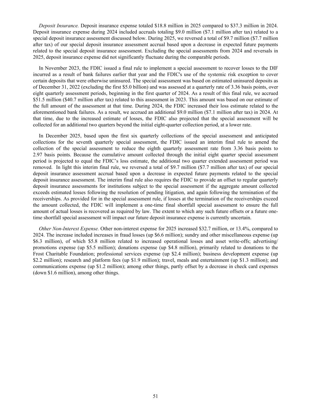Deposit Insurance. Deposit insurance expense totaled $18.8 million in 2025 compared to $37.3 million in 2024. Deposit insurance expense during 2024 included accruals totaling $9.0 million ($7.1 million after tax) related to a special deposit insurance assessment discussed below. During 2025, we reversed a total of $9.7 million ($7.7 million after tax) of our special deposit insurance assessment accrual based upon a decrease in expected future payments related to the special deposit insurance assessment. Excluding the special assessments from 2024 and reversals in 2025, deposit insurance expense did not significantly fluctuate during the comparable periods. In November 2023, the FDIC issued a final rule to implement a special assessment to recover losses to the DIF incurred as a result of bank failures earlier that year and the FDIC's use of the systemic risk exception to cover certain deposits that were otherwise uninsured. The special assessment was based on estimated uninsured deposits as of December 31, 2022 (excluding the first $5.0 billion) and was assessed at a quarterly rate of 3.36 basis points, over eight quarterly assessment periods, beginning in the first quarter of 2024. As a result of this final rule, we accrued $51.5 million ($40.7 million after tax) related to this assessment in 2023. This amount was based on our estimate of the full amount of the assessment at that time. During 2024, the FDIC increased their loss estimate related to the aforementioned bank failures. As a result, we accrued an additional $9.0 million ($7.1 million after tax) in 2024. At that time, due to the increased estimate of losses, the FDIC also projected that the special assessment will be collected for an additional two quarters beyond the initial eight-quarter collection period, at a lower rate. In December 2025, based upon the first six quarterly collections of the special assessment and anticipated collections for the seventh quarterly special assessment, the FDIC issued an interim final rule to amend the collection of the special assessment to reduce the eighth quarterly assessment rate from 3.36 basis points to 2.97 basis points. Because the cumulative amount collected through the initial eight quarter special assessment period is projected to equal the FDIC’s loss estimate, the additional two quarter extended assessment period was removed. In light this interim final rule, we reversed a total of $9.7 million ($7.7 million after tax) of our special deposit insurance assessment accrual based upon a decrease in expected future payments related to the special deposit insurance assessment. The interim final rule also requires the FDIC to provide an offset to regular quarterly deposit insurance assessments for institutions subject to the special assessment if the aggregate amount collected exceeds estimated losses following the resolution of pending litigation, and again following the termination of the receiverships. As provided for in the special assessment rule, if losses at the termination of the receiverships exceed the amount collected, the FDIC will implement a one-time final shortfall special assessment to ensure the full amount of actual losses is recovered as required by law. The extent to which any such future offsets or a future one- time shortfall special assessment will impact our future deposit insurance expense is currently uncertain. Other Non-Interest Expense. Other non-interest expense for 2025 increased $32.7 million, or 13.4%, compared to 2024. The increase included increases in fraud losses (up $6.6 million); sundry and other miscellaneous expense (up $6.3 million), of which $5.8 million related to increased operational losses and asset write-offs; advertising/ promotions expense (up $5.5 million); donations expense (up $4.8 million), primarily related to donations to the Frost Charitable Foundation; professional services expense (up $2.4 million); business development expense (up $2.2 million); research and platform fees (up $1.9 million); travel, meals and entertainment (up $1.3 million); and communications expense (up $1.2 million); among other things, partly offset by a decrease in check card expenses (down $1.6 million), among other things. 51