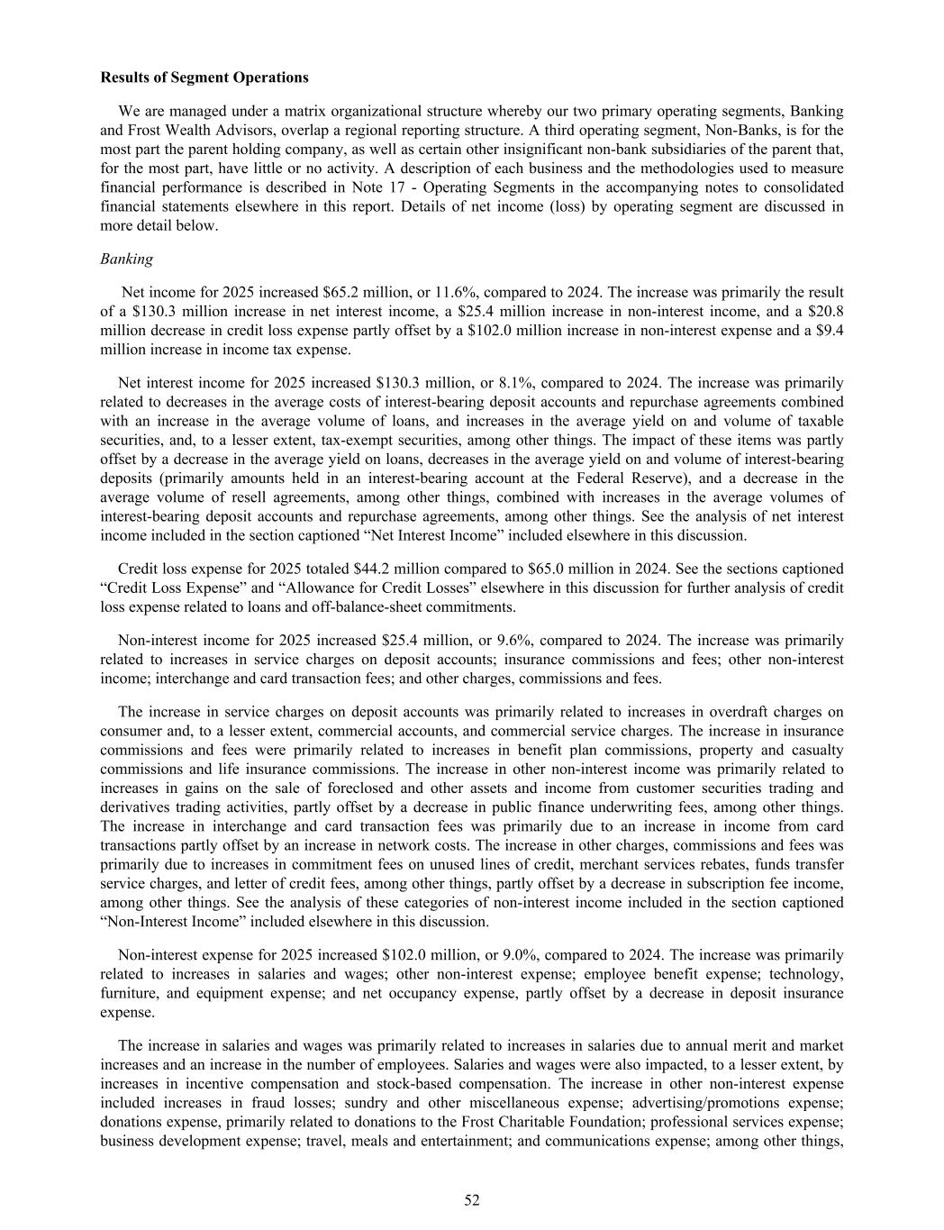 Results of Segment Operations We are managed under a matrix organizational structure whereby our two primary operating segments, Banking and Frost Wealth Advisors, overlap a regional reporting structure. A third operating segment, Non-Banks, is for the most part the parent holding company, as well as certain other insignificant non-bank subsidiaries of the parent that, for the most part, have little or no activity. A description of each business and the methodologies used to measure financial performance is described in Note 17 - Operating Segments in the accompanying notes to consolidated financial statements elsewhere in this report. Details of net income (loss) by operating segment are discussed in more detail below. Banking Net income for 2025 increased $65.2 million, or 11.6%, compared to 2024. The increase was primarily the result of a $130.3 million increase in net interest income, a $25.4 million increase in non-interest income, and a $20.8 million decrease in credit loss expense partly offset by a $102.0 million increase in non-interest expense and a $9.4 million increase in income tax expense. Net interest income for 2025 increased $130.3 million, or 8.1%, compared to 2024. The increase was primarily related to decreases in the average costs of interest-bearing deposit accounts and repurchase agreements combined with an increase in the average volume of loans, and increases in the average yield on and volume of taxable securities, and, to a lesser extent, tax-exempt securities, among other things. The impact of these items was partly offset by a decrease in the average yield on loans, decreases in the average yield on and volume of interest-bearing deposits (primarily amounts held in an interest-bearing account at the Federal Reserve), and a decrease in the average volume of resell agreements, among other things, combined with increases in the average volumes of interest-bearing deposit accounts and repurchase agreements, among other things. See the analysis of net interest income included in the section captioned “Net Interest Income” included elsewhere in this discussion. Credit loss expense for 2025 totaled $44.2 million compared to $65.0 million in 2024. See the sections captioned “Credit Loss Expense” and “Allowance for Credit Losses” elsewhere in this discussion for further analysis of credit loss expense related to loans and off-balance-sheet commitments. Non-interest income for 2025 increased $25.4 million, or 9.6%, compared to 2024. The increase was primarily related to increases in service charges on deposit accounts; insurance commissions and fees; other non-interest income; interchange and card transaction fees; and other charges, commissions and fees. The increase in service charges on deposit accounts was primarily related to increases in overdraft charges on consumer and, to a lesser extent, commercial accounts, and commercial service charges. The increase in insurance commissions and fees were primarily related to increases in benefit plan commissions, property and casualty commissions and life insurance commissions. The increase in other non-interest income was primarily related to increases in gains on the sale of foreclosed and other assets and income from customer securities trading and derivatives trading activities, partly offset by a decrease in public finance underwriting fees, among other things. The increase in interchange and card transaction fees was primarily due to an increase in income from card transactions partly offset by an increase in network costs. The increase in other charges, commissions and fees was primarily due to increases in commitment fees on unused lines of credit, merchant services rebates, funds transfer service charges, and letter of credit fees, among other things, partly offset by a decrease in subscription fee income, among other things. See the analysis of these categories of non-interest income included in the section captioned “Non-Interest Income” included elsewhere in this discussion. Non-interest expense for 2025 increased $102.0 million, or 9.0%, compared to 2024. The increase was primarily related to increases in salaries and wages; other non-interest expense; employee benefit expense; technology, furniture, and equipment expense; and net occupancy expense, partly offset by a decrease in deposit insurance expense. The increase in salaries and wages was primarily related to increases in salaries due to annual merit and market increases and an increase in the number of employees. Salaries and wages were also impacted, to a lesser extent, by increases in incentive compensation and stock-based compensation. The increase in other non-interest expense included increases in fraud losses; sundry and other miscellaneous expense; advertising/promotions expense; donations expense, primarily related to donations to the Frost Charitable Foundation; professional services expense; business development expense; travel, meals and entertainment; and communications expense; among other things, 52