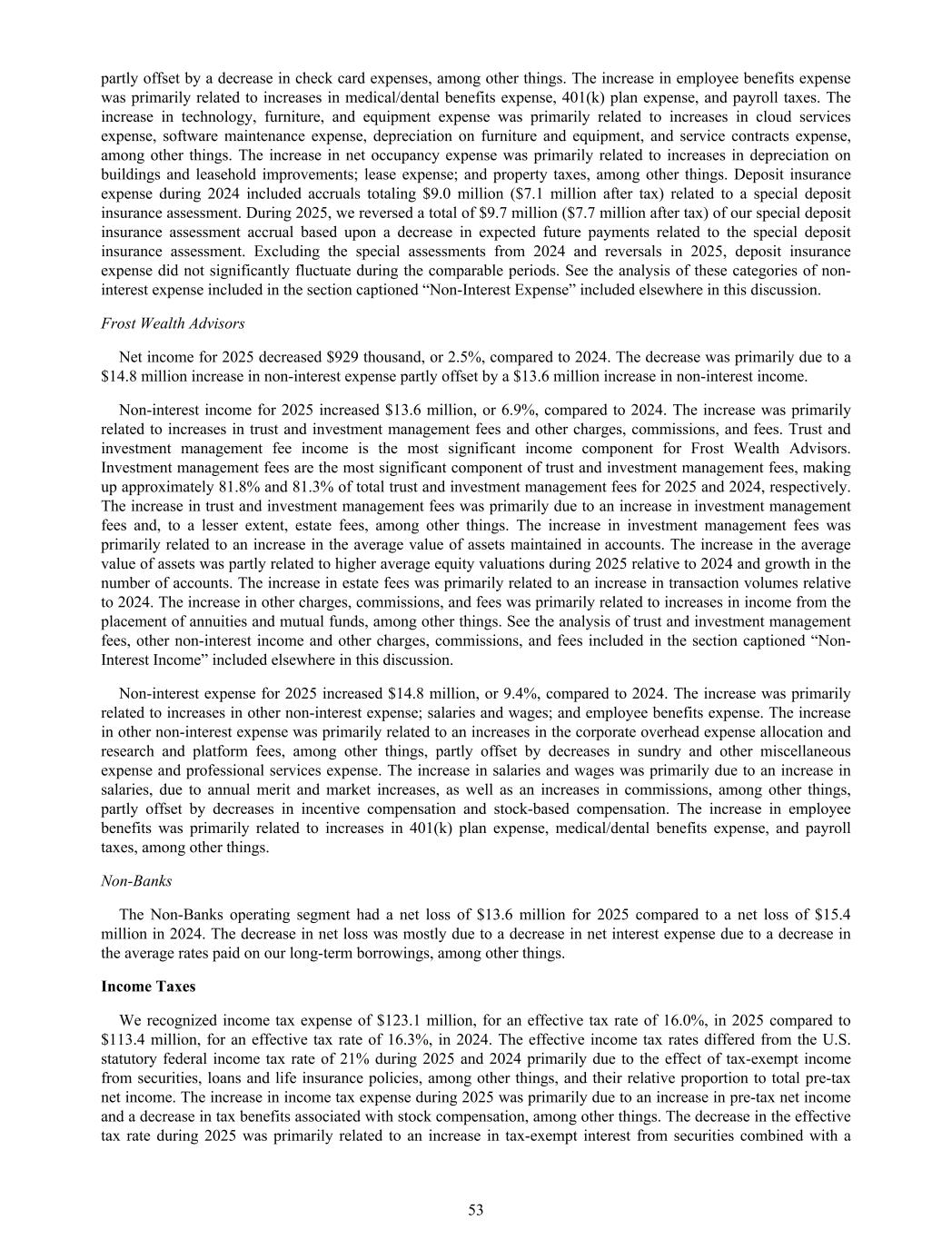 partly offset by a decrease in check card expenses, among other things. The increase in employee benefits expense was primarily related to increases in medical/dental benefits expense, 401(k) plan expense, and payroll taxes. The increase in technology, furniture, and equipment expense was primarily related to increases in cloud services expense, software maintenance expense, depreciation on furniture and equipment, and service contracts expense, among other things. The increase in net occupancy expense was primarily related to increases in depreciation on buildings and leasehold improvements; lease expense; and property taxes, among other things. Deposit insurance expense during 2024 included accruals totaling $9.0 million ($7.1 million after tax) related to a special deposit insurance assessment. During 2025, we reversed a total of $9.7 million ($7.7 million after tax) of our special deposit insurance assessment accrual based upon a decrease in expected future payments related to the special deposit insurance assessment. Excluding the special assessments from 2024 and reversals in 2025, deposit insurance expense did not significantly fluctuate during the comparable periods. See the analysis of these categories of non- interest expense included in the section captioned “Non-Interest Expense” included elsewhere in this discussion. Frost Wealth Advisors Net income for 2025 decreased $929 thousand, or 2.5%, compared to 2024. The decrease was primarily due to a $14.8 million increase in non-interest expense partly offset by a $13.6 million increase in non-interest income. Non-interest income for 2025 increased $13.6 million, or 6.9%, compared to 2024. The increase was primarily related to increases in trust and investment management fees and other charges, commissions, and fees. Trust and investment management fee income is the most significant income component for Frost Wealth Advisors. Investment management fees are the most significant component of trust and investment management fees, making up approximately 81.8% and 81.3% of total trust and investment management fees for 2025 and 2024, respectively. The increase in trust and investment management fees was primarily due to an increase in investment management fees and, to a lesser extent, estate fees, among other things. The increase in investment management fees was primarily related to an increase in the average value of assets maintained in accounts. The increase in the average value of assets was partly related to higher average equity valuations during 2025 relative to 2024 and growth in the number of accounts. The increase in estate fees was primarily related to an increase in transaction volumes relative to 2024. The increase in other charges, commissions, and fees was primarily related to increases in income from the placement of annuities and mutual funds, among other things. See the analysis of trust and investment management fees, other non-interest income and other charges, commissions, and fees included in the section captioned “Non- Interest Income” included elsewhere in this discussion. Non-interest expense for 2025 increased $14.8 million, or 9.4%, compared to 2024. The increase was primarily related to increases in other non-interest expense; salaries and wages; and employee benefits expense. The increase in other non-interest expense was primarily related to an increases in the corporate overhead expense allocation and research and platform fees, among other things, partly offset by decreases in sundry and other miscellaneous expense and professional services expense. The increase in salaries and wages was primarily due to an increase in salaries, due to annual merit and market increases, as well as an increases in commissions, among other things, partly offset by decreases in incentive compensation and stock-based compensation. The increase in employee benefits was primarily related to increases in 401(k) plan expense, medical/dental benefits expense, and payroll taxes, among other things. Non-Banks The Non-Banks operating segment had a net loss of $13.6 million for 2025 compared to a net loss of $15.4 million in 2024. The decrease in net loss was mostly due to a decrease in net interest expense due to a decrease in the average rates paid on our long-term borrowings, among other things. Income Taxes We recognized income tax expense of $123.1 million, for an effective tax rate of 16.0%, in 2025 compared to $113.4 million, for an effective tax rate of 16.3%, in 2024. The effective income tax rates differed from the U.S. statutory federal income tax rate of 21% during 2025 and 2024 primarily due to the effect of tax-exempt income from securities, loans and life insurance policies, among other things, and their relative proportion to total pre-tax net income. The increase in income tax expense during 2025 was primarily due to an increase in pre-tax net income and a decrease in tax benefits associated with stock compensation, among other things. The decrease in the effective tax rate during 2025 was primarily related to an increase in tax-exempt interest from securities combined with a 53