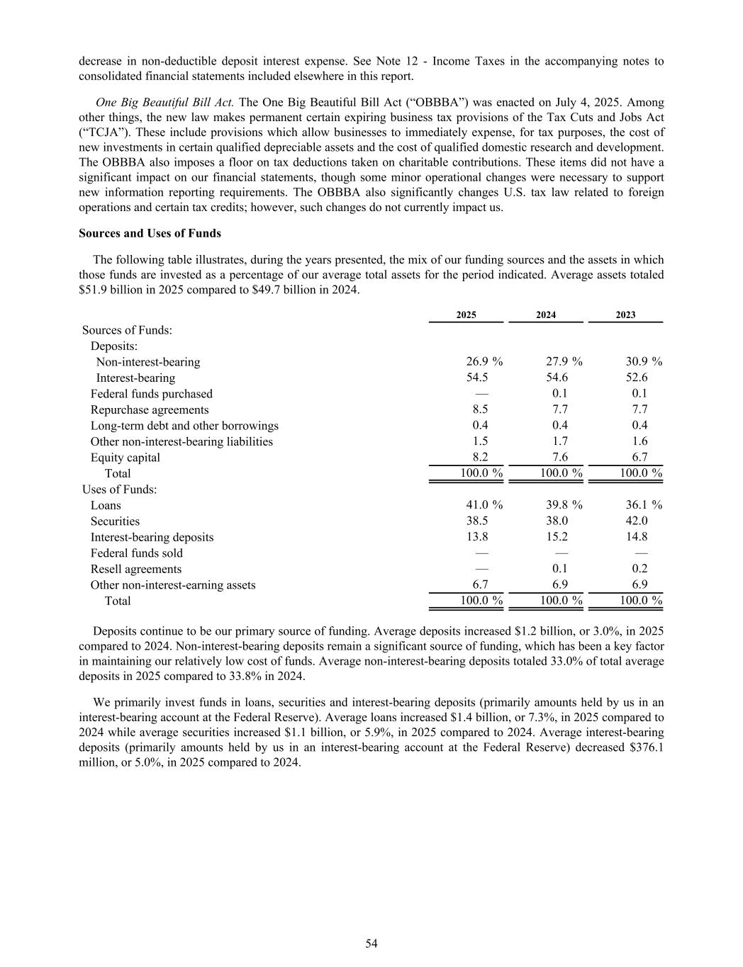 decrease in non-deductible deposit interest expense. See Note 12 - Income Taxes in the accompanying notes to consolidated financial statements included elsewhere in this report. One Big Beautiful Bill Act. The One Big Beautiful Bill Act (“OBBBA”) was enacted on July 4, 2025. Among other things, the new law makes permanent certain expiring business tax provisions of the Tax Cuts and Jobs Act (“TCJA”). These include provisions which allow businesses to immediately expense, for tax purposes, the cost of new investments in certain qualified depreciable assets and the cost of qualified domestic research and development. The OBBBA also imposes a floor on tax deductions taken on charitable contributions. These items did not have a significant impact on our financial statements, though some minor operational changes were necessary to support new information reporting requirements. The OBBBA also significantly changes U.S. tax law related to foreign operations and certain tax credits; however, such changes do not currently impact us. Sources and Uses of Funds The following table illustrates, during the years presented, the mix of our funding sources and the assets in which those funds are invested as a percentage of our average total assets for the period indicated. Average assets totaled $51.9 billion in 2025 compared to $49.7 billion in 2024. 2025 2024 2023 Sources of Funds: Deposits: Non-interest-bearing 26.9 % 27.9 % 30.9 % Interest-bearing 54.5 54.6 52.6 Federal funds purchased — 0.1 0.1 Repurchase agreements 8.5 7.7 7.7 Long-term debt and other borrowings 0.4 0.4 0.4 Other non-interest-bearing liabilities 1.5 1.7 1.6 Equity capital 8.2 7.6 6.7 Total 100.0 % 100.0 % 100.0 % Uses of Funds: Loans 41.0 % 39.8 % 36.1 % Securities 38.5 38.0 42.0 Interest-bearing deposits 13.8 15.2 14.8 Federal funds sold — — — Resell agreements — 0.1 0.2 Other non-interest-earning assets 6.7 6.9 6.9 Total 100.0 % 100.0 % 100.0 % Deposits continue to be our primary source of funding. Average deposits increased $1.2 billion, or 3.0%, in 2025 compared to 2024. Non-interest-bearing deposits remain a significant source of funding, which has been a key factor in maintaining our relatively low cost of funds. Average non-interest-bearing deposits totaled 33.0% of total average deposits in 2025 compared to 33.8% in 2024. We primarily invest funds in loans, securities and interest-bearing deposits (primarily amounts held by us in an interest-bearing account at the Federal Reserve). Average loans increased $1.4 billion, or 7.3%, in 2025 compared to 2024 while average securities increased $1.1 billion, or 5.9%, in 2025 compared to 2024. Average interest-bearing deposits (primarily amounts held by us in an interest-bearing account at the Federal Reserve) decreased $376.1 million, or 5.0%, in 2025 compared to 2024. 54