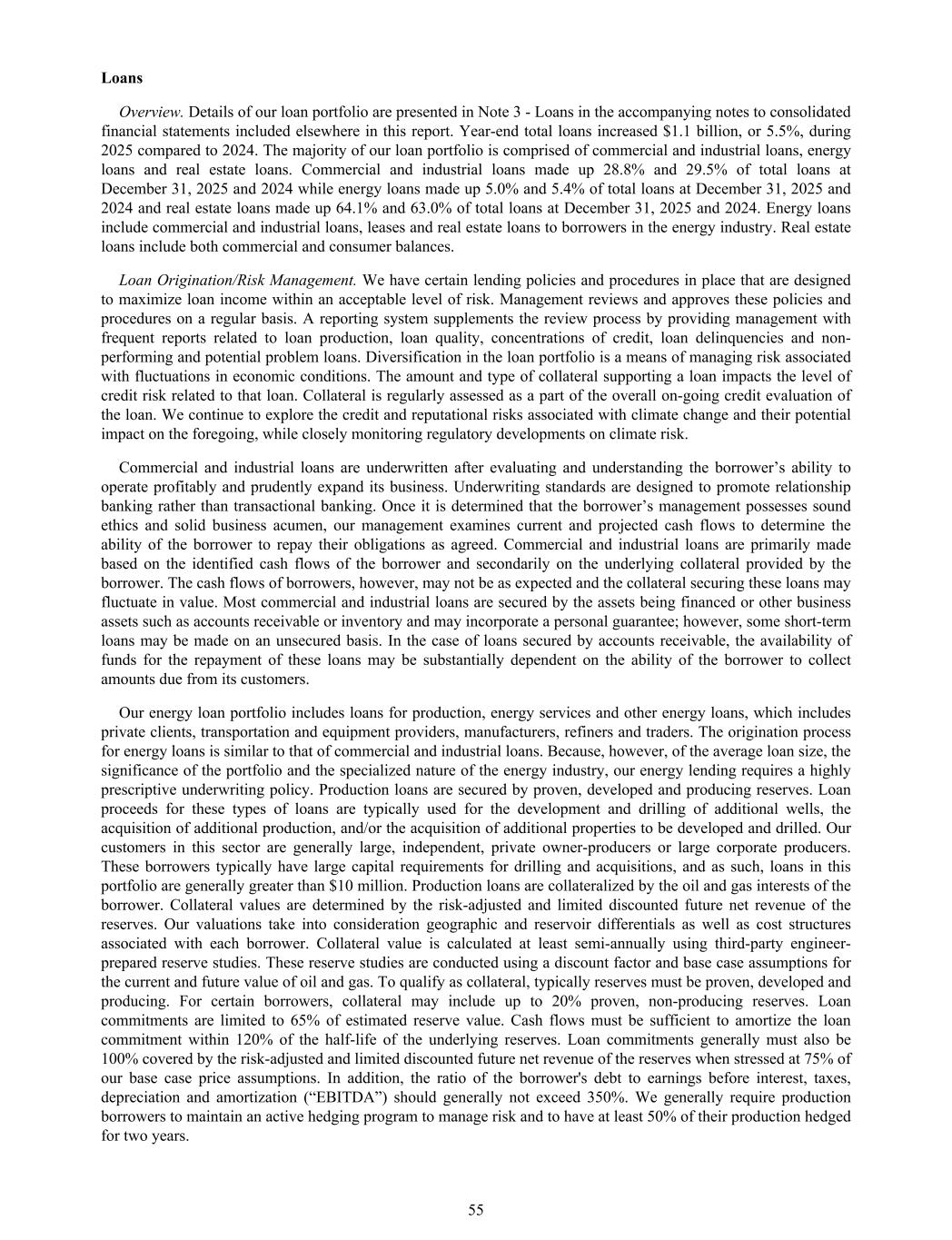 Loans Overview. Details of our loan portfolio are presented in Note 3 - Loans in the accompanying notes to consolidated financial statements included elsewhere in this report. Year-end total loans increased $1.1 billion, or 5.5%, during 2025 compared to 2024. The majority of our loan portfolio is comprised of commercial and industrial loans, energy loans and real estate loans. Commercial and industrial loans made up 28.8% and 29.5% of total loans at December 31, 2025 and 2024 while energy loans made up 5.0% and 5.4% of total loans at December 31, 2025 and 2024 and real estate loans made up 64.1% and 63.0% of total loans at December 31, 2025 and 2024. Energy loans include commercial and industrial loans, leases and real estate loans to borrowers in the energy industry. Real estate loans include both commercial and consumer balances. Loan Origination/Risk Management. We have certain lending policies and procedures in place that are designed to maximize loan income within an acceptable level of risk. Management reviews and approves these policies and procedures on a regular basis. A reporting system supplements the review process by providing management with frequent reports related to loan production, loan quality, concentrations of credit, loan delinquencies and non- performing and potential problem loans. Diversification in the loan portfolio is a means of managing risk associated with fluctuations in economic conditions. The amount and type of collateral supporting a loan impacts the level of credit risk related to that loan. Collateral is regularly assessed as a part of the overall on-going credit evaluation of the loan. We continue to explore the credit and reputational risks associated with climate change and their potential impact on the foregoing, while closely monitoring regulatory developments on climate risk. Commercial and industrial loans are underwritten after evaluating and understanding the borrower’s ability to operate profitably and prudently expand its business. Underwriting standards are designed to promote relationship banking rather than transactional banking. Once it is determined that the borrower’s management possesses sound ethics and solid business acumen, our management examines current and projected cash flows to determine the ability of the borrower to repay their obligations as agreed. Commercial and industrial loans are primarily made based on the identified cash flows of the borrower and secondarily on the underlying collateral provided by the borrower. The cash flows of borrowers, however, may not be as expected and the collateral securing these loans may fluctuate in value. Most commercial and industrial loans are secured by the assets being financed or other business assets such as accounts receivable or inventory and may incorporate a personal guarantee; however, some short-term loans may be made on an unsecured basis. In the case of loans secured by accounts receivable, the availability of funds for the repayment of these loans may be substantially dependent on the ability of the borrower to collect amounts due from its customers. Our energy loan portfolio includes loans for production, energy services and other energy loans, which includes private clients, transportation and equipment providers, manufacturers, refiners and traders. The origination process for energy loans is similar to that of commercial and industrial loans. Because, however, of the average loan size, the significance of the portfolio and the specialized nature of the energy industry, our energy lending requires a highly prescriptive underwriting policy. Production loans are secured by proven, developed and producing reserves. Loan proceeds for these types of loans are typically used for the development and drilling of additional wells, the acquisition of additional production, and/or the acquisition of additional properties to be developed and drilled. Our customers in this sector are generally large, independent, private owner-producers or large corporate producers. These borrowers typically have large capital requirements for drilling and acquisitions, and as such, loans in this portfolio are generally greater than $10 million. Production loans are collateralized by the oil and gas interests of the borrower. Collateral values are determined by the risk-adjusted and limited discounted future net revenue of the reserves. Our valuations take into consideration geographic and reservoir differentials as well as cost structures associated with each borrower. Collateral value is calculated at least semi-annually using third-party engineer- prepared reserve studies. These reserve studies are conducted using a discount factor and base case assumptions for the current and future value of oil and gas. To qualify as collateral, typically reserves must be proven, developed and producing. For certain borrowers, collateral may include up to 20% proven, non-producing reserves. Loan commitments are limited to 65% of estimated reserve value. Cash flows must be sufficient to amortize the loan commitment within 120% of the half-life of the underlying reserves. Loan commitments generally must also be 100% covered by the risk-adjusted and limited discounted future net revenue of the reserves when stressed at 75% of our base case price assumptions. In addition, the ratio of the borrower's debt to earnings before interest, taxes, depreciation and amortization (“EBITDA”) should generally not exceed 350%. We generally require production borrowers to maintain an active hedging program to manage risk and to have at least 50% of their production hedged for two years. 55