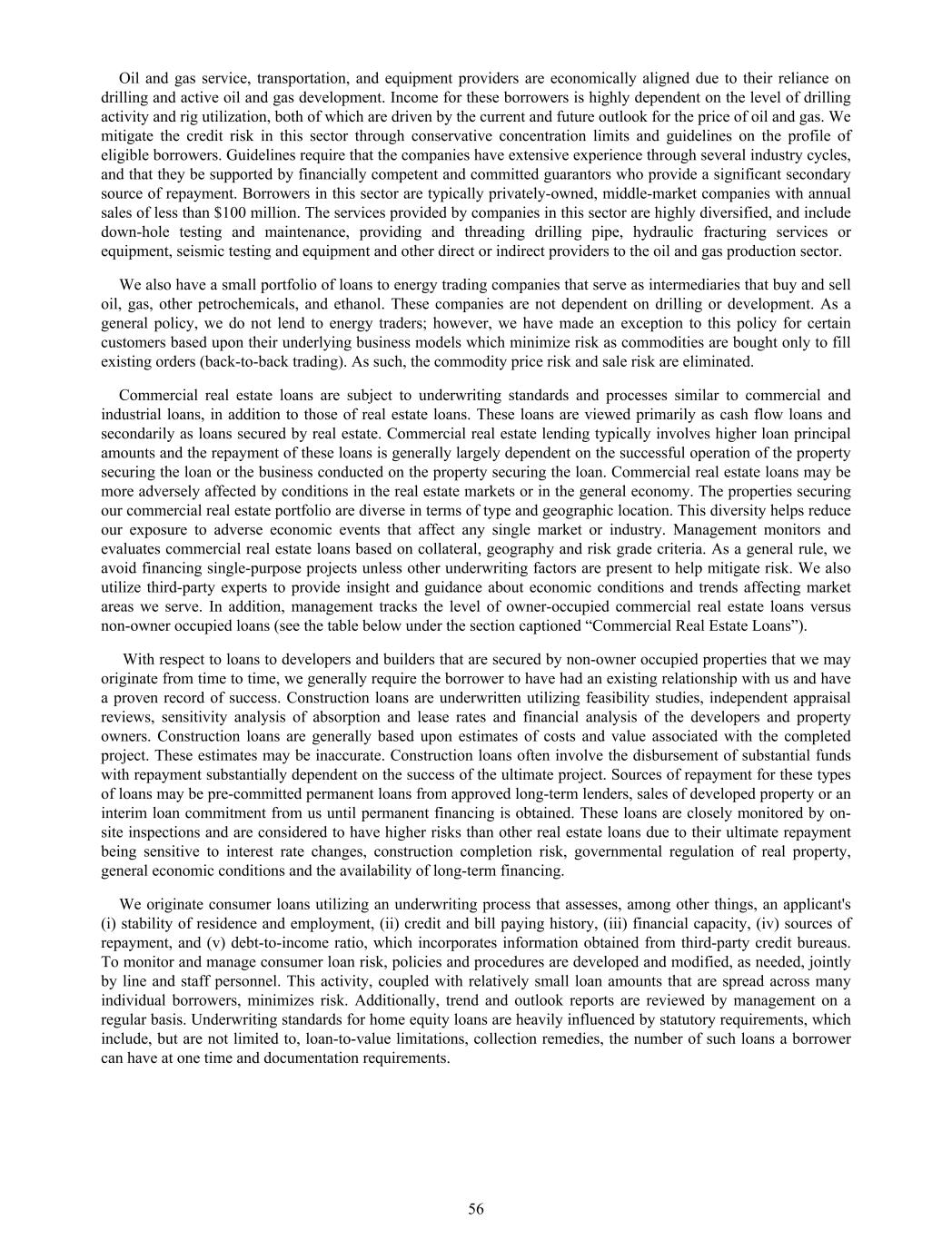 Oil and gas service, transportation, and equipment providers are economically aligned due to their reliance on drilling and active oil and gas development. Income for these borrowers is highly dependent on the level of drilling activity and rig utilization, both of which are driven by the current and future outlook for the price of oil and gas. We mitigate the credit risk in this sector through conservative concentration limits and guidelines on the profile of eligible borrowers. Guidelines require that the companies have extensive experience through several industry cycles, and that they be supported by financially competent and committed guarantors who provide a significant secondary source of repayment. Borrowers in this sector are typically privately-owned, middle-market companies with annual sales of less than $100 million. The services provided by companies in this sector are highly diversified, and include down-hole testing and maintenance, providing and threading drilling pipe, hydraulic fracturing services or equipment, seismic testing and equipment and other direct or indirect providers to the oil and gas production sector. We also have a small portfolio of loans to energy trading companies that serve as intermediaries that buy and sell oil, gas, other petrochemicals, and ethanol. These companies are not dependent on drilling or development. As a general policy, we do not lend to energy traders; however, we have made an exception to this policy for certain customers based upon their underlying business models which minimize risk as commodities are bought only to fill existing orders (back-to-back trading). As such, the commodity price risk and sale risk are eliminated. Commercial real estate loans are subject to underwriting standards and processes similar to commercial and industrial loans, in addition to those of real estate loans. These loans are viewed primarily as cash flow loans and secondarily as loans secured by real estate. Commercial real estate lending typically involves higher loan principal amounts and the repayment of these loans is generally largely dependent on the successful operation of the property securing the loan or the business conducted on the property securing the loan. Commercial real estate loans may be more adversely affected by conditions in the real estate markets or in the general economy. The properties securing our commercial real estate portfolio are diverse in terms of type and geographic location. This diversity helps reduce our exposure to adverse economic events that affect any single market or industry. Management monitors and evaluates commercial real estate loans based on collateral, geography and risk grade criteria. As a general rule, we avoid financing single-purpose projects unless other underwriting factors are present to help mitigate risk. We also utilize third-party experts to provide insight and guidance about economic conditions and trends affecting market areas we serve. In addition, management tracks the level of owner-occupied commercial real estate loans versus non-owner occupied loans (see the table below under the section captioned “Commercial Real Estate Loans”). With respect to loans to developers and builders that are secured by non-owner occupied properties that we may originate from time to time, we generally require the borrower to have had an existing relationship with us and have a proven record of success. Construction loans are underwritten utilizing feasibility studies, independent appraisal reviews, sensitivity analysis of absorption and lease rates and financial analysis of the developers and property owners. Construction loans are generally based upon estimates of costs and value associated with the completed project. These estimates may be inaccurate. Construction loans often involve the disbursement of substantial funds with repayment substantially dependent on the success of the ultimate project. Sources of repayment for these types of loans may be pre-committed permanent loans from approved long-term lenders, sales of developed property or an interim loan commitment from us until permanent financing is obtained. These loans are closely monitored by on- site inspections and are considered to have higher risks than other real estate loans due to their ultimate repayment being sensitive to interest rate changes, construction completion risk, governmental regulation of real property, general economic conditions and the availability of long-term financing. We originate consumer loans utilizing an underwriting process that assesses, among other things, an applicant's (i) stability of residence and employment, (ii) credit and bill paying history, (iii) financial capacity, (iv) sources of repayment, and (v) debt-to-income ratio, which incorporates information obtained from third-party credit bureaus. To monitor and manage consumer loan risk, policies and procedures are developed and modified, as needed, jointly by line and staff personnel. This activity, coupled with relatively small loan amounts that are spread across many individual borrowers, minimizes risk. Additionally, trend and outlook reports are reviewed by management on a regular basis. Underwriting standards for home equity loans are heavily influenced by statutory requirements, which include, but are not limited to, loan-to-value limitations, collection remedies, the number of such loans a borrower can have at one time and documentation requirements. 56