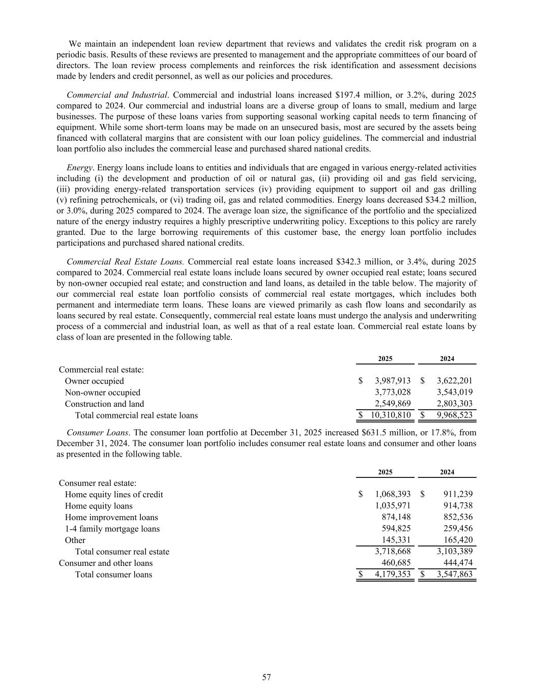 We maintain an independent loan review department that reviews and validates the credit risk program on a periodic basis. Results of these reviews are presented to management and the appropriate committees of our board of directors. The loan review process complements and reinforces the risk identification and assessment decisions made by lenders and credit personnel, as well as our policies and procedures. Commercial and Industrial. Commercial and industrial loans increased $197.4 million, or 3.2%, during 2025 compared to 2024. Our commercial and industrial loans are a diverse group of loans to small, medium and large businesses. The purpose of these loans varies from supporting seasonal working capital needs to term financing of equipment. While some short-term loans may be made on an unsecured basis, most are secured by the assets being financed with collateral margins that are consistent with our loan policy guidelines. The commercial and industrial loan portfolio also includes the commercial lease and purchased shared national credits. Energy. Energy loans include loans to entities and individuals that are engaged in various energy-related activities including (i) the development and production of oil or natural gas, (ii) providing oil and gas field servicing, (iii) providing energy-related transportation services (iv) providing equipment to support oil and gas drilling (v) refining petrochemicals, or (vi) trading oil, gas and related commodities. Energy loans decreased $34.2 million, or 3.0%, during 2025 compared to 2024. The average loan size, the significance of the portfolio and the specialized nature of the energy industry requires a highly prescriptive underwriting policy. Exceptions to this policy are rarely granted. Due to the large borrowing requirements of this customer base, the energy loan portfolio includes participations and purchased shared national credits. Commercial Real Estate Loans. Commercial real estate loans increased $342.3 million, or 3.4%, during 2025 compared to 2024. Commercial real estate loans include loans secured by owner occupied real estate; loans secured by non-owner occupied real estate; and construction and land loans, as detailed in the table below. The majority of our commercial real estate loan portfolio consists of commercial real estate mortgages, which includes both permanent and intermediate term loans. These loans are viewed primarily as cash flow loans and secondarily as loans secured by real estate. Consequently, commercial real estate loans must undergo the analysis and underwriting process of a commercial and industrial loan, as well as that of a real estate loan. Commercial real estate loans by class of loan are presented in the following table. 2025 2024 Commercial real estate: Owner occupied $ 3,987,913 $ 3,622,201 Non-owner occupied 3,773,028 3,543,019 Construction and land 2,549,869 2,803,303 Total commercial real estate loans $ 10,310,810 $ 9,968,523 Consumer Loans. The consumer loan portfolio at December 31, 2025 increased $631.5 million, or 17.8%, from December 31, 2024. The consumer loan portfolio includes consumer real estate loans and consumer and other loans as presented in the following table. 2025 2024 Consumer real estate: Home equity lines of credit $ 1,068,393 $ 911,239 Home equity loans 1,035,971 914,738 Home improvement loans 874,148 852,536 1-4 family mortgage loans 594,825 259,456 Other 145,331 165,420 Total consumer real estate 3,718,668 3,103,389 Consumer and other loans 460,685 444,474 Total consumer loans $ 4,179,353 $ 3,547,863 57
