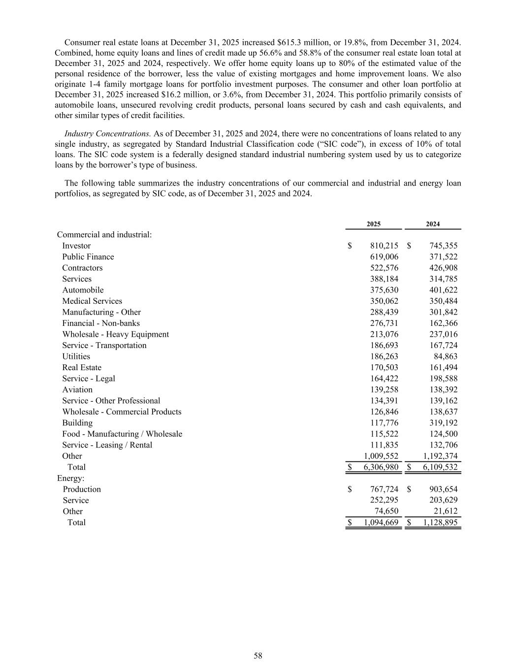 Consumer real estate loans at December 31, 2025 increased $615.3 million, or 19.8%, from December 31, 2024. Combined, home equity loans and lines of credit made up 56.6% and 58.8% of the consumer real estate loan total at December 31, 2025 and 2024, respectively. We offer home equity loans up to 80% of the estimated value of the personal residence of the borrower, less the value of existing mortgages and home improvement loans. We also originate 1-4 family mortgage loans for portfolio investment purposes. The consumer and other loan portfolio at December 31, 2025 increased $16.2 million, or 3.6%, from December 31, 2024. This portfolio primarily consists of automobile loans, unsecured revolving credit products, personal loans secured by cash and cash equivalents, and other similar types of credit facilities. Industry Concentrations. As of December 31, 2025 and 2024, there were no concentrations of loans related to any single industry, as segregated by Standard Industrial Classification code (“SIC code”), in excess of 10% of total loans. The SIC code system is a federally designed standard industrial numbering system used by us to categorize loans by the borrower’s type of business. The following table summarizes the industry concentrations of our commercial and industrial and energy loan portfolios, as segregated by SIC code, as of December 31, 2025 and 2024. 2025 2024 Commercial and industrial: Investor $ 810,215 $ 745,355 Public Finance 619,006 371,522 Contractors 522,576 426,908 Services 388,184 314,785 Automobile 375,630 401,622 Medical Services 350,062 350,484 Manufacturing - Other 288,439 301,842 Financial - Non-banks 276,731 162,366 Wholesale - Heavy Equipment 213,076 237,016 Service - Transportation 186,693 167,724 Utilities 186,263 84,863 Real Estate 170,503 161,494 Service - Legal 164,422 198,588 Aviation 139,258 138,392 Service - Other Professional 134,391 139,162 Wholesale - Commercial Products 126,846 138,637 Building 117,776 319,192 Food - Manufacturing / Wholesale 115,522 124,500 Service - Leasing / Rental 111,835 132,706 Other 1,009,552 1,192,374 Total $ 6,306,980 $ 6,109,532 Energy: Production $ 767,724 $ 903,654 Service 252,295 203,629 Other 74,650 21,612 Total $ 1,094,669 $ 1,128,895 58