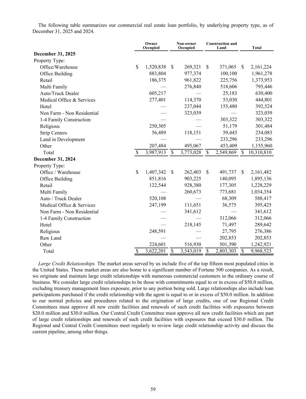 The following table summarizes our commercial real estate loan portfolio, by underlying property type, as of December 31, 2025 and 2024. Owner Occupied Non-owner Occupied Construction and Land Total December 31, 2025 Property Type: Office/Warehouse $ 1,520,838 $ 269,321 $ 371,065 $ 2,161,224 Office Building 883,804 977,374 100,100 1,961,278 Retail 186,375 961,822 225,756 1,373,953 Multi Family — 276,840 518,606 795,446 Auto/Truck Dealer 605,217 — 25,183 630,400 Medical Office & Services 277,401 114,370 53,030 444,801 Hotel — 237,044 155,480 392,524 Non Farm - Non Residential — 323,039 — 323,039 1-4 Family Construction — — 303,322 303,322 Religious 250,305 — 51,179 301,484 Strip Centers 56,489 118,151 59,443 234,083 Land in Development — — 233,296 233,296 Other 207,484 495,067 453,409 1,155,960 Total $ 3,987,913 $ 3,773,028 $ 2,549,869 $ 10,310,810 December 31, 2024 Property Type: Office / Warehouse $ 1,407,342 $ 262,403 $ 491,737 $ 2,161,482 Office Building 851,816 903,225 140,095 1,895,136 Retail 122,544 928,380 177,305 1,228,229 Multi Family — 260,673 773,681 1,034,354 Auto / Truck Dealer 520,108 — 68,309 588,417 Medical Office & Services 247,199 111,651 36,575 395,425 Non Farm - Non Residential — 341,612 — 341,612 1-4 Family Construction — — 312,066 312,066 Hotel — 218,145 71,497 289,642 Religious 248,591 — 27,795 276,386 Raw Land — — 202,853 202,853 Other 224,601 516,930 501,390 1,242,921 Total $ 3,622,201 $ 3,543,019 $ 2,803,303 $ 9,968,523 Large Credit Relationships. The market areas served by us include five of the top fifteen most populated cities in the United States. These market areas are also home to a significant number of Fortune 500 companies. As a result, we originate and maintain large credit relationships with numerous commercial customers in the ordinary course of business. We consider large credit relationships to be those with commitments equal to or in excess of $50.0 million, excluding treasury management lines exposure, prior to any portion being sold. Large relationships also include loan participations purchased if the credit relationship with the agent is equal to or in excess of $50.0 million. In addition to our normal policies and procedures related to the origination of large credits, one of our Regional Credit Committees must approve all new credit facilities and renewals of such credit facilities with exposures between $20.0 million and $30.0 million. Our Central Credit Committee must approve all new credit facilities which are part of large credit relationships and renewals of such credit facilities with exposures that exceed $30.0 million. The Regional and Central Credit Committees meet regularly to review large credit relationship activity and discuss the current pipeline, among other things. 59