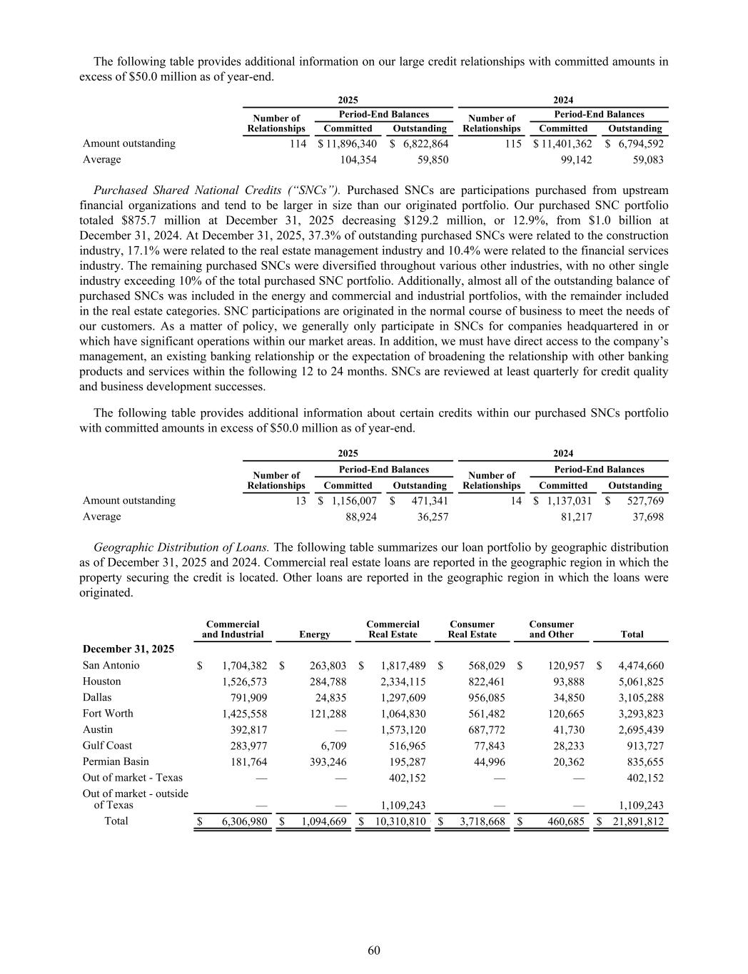 The following table provides additional information on our large credit relationships with committed amounts in excess of $50.0 million as of year-end. 2025 2024 Number of Relationships Period-End Balances Number of Relationships Period-End Balances Committed Outstanding Committed Outstanding Amount outstanding 114 $ 11,896,340 $ 6,822,864 115 $ 11,401,362 $ 6,794,592 Average 104,354 59,850 99,142 59,083 Purchased Shared National Credits (“SNCs”). Purchased SNCs are participations purchased from upstream financial organizations and tend to be larger in size than our originated portfolio. Our purchased SNC portfolio totaled $875.7 million at December 31, 2025 decreasing $129.2 million, or 12.9%, from $1.0 billion at December 31, 2024. At December 31, 2025, 37.3% of outstanding purchased SNCs were related to the construction industry, 17.1% were related to the real estate management industry and 10.4% were related to the financial services industry. The remaining purchased SNCs were diversified throughout various other industries, with no other single industry exceeding 10% of the total purchased SNC portfolio. Additionally, almost all of the outstanding balance of purchased SNCs was included in the energy and commercial and industrial portfolios, with the remainder included in the real estate categories. SNC participations are originated in the normal course of business to meet the needs of our customers. As a matter of policy, we generally only participate in SNCs for companies headquartered in or which have significant operations within our market areas. In addition, we must have direct access to the company’s management, an existing banking relationship or the expectation of broadening the relationship with other banking products and services within the following 12 to 24 months. SNCs are reviewed at least quarterly for credit quality and business development successes. The following table provides additional information about certain credits within our purchased SNCs portfolio with committed amounts in excess of $50.0 million as of year-end. 2025 2024 Number of Relationships Period-End Balances Number of Relationships Period-End Balances Committed Outstanding Committed Outstanding Amount outstanding 13 $ 1,156,007 $ 471,341 14 $ 1,137,031 $ 527,769 Average 88,924 36,257 81,217 37,698 Geographic Distribution of Loans. The following table summarizes our loan portfolio by geographic distribution as of December 31, 2025 and 2024. Commercial real estate loans are reported in the geographic region in which the property securing the credit is located. Other loans are reported in the geographic region in which the loans were originated. Commercial and Industrial Energy Commercial Real Estate Consumer Real Estate Consumer and Other Total December 31, 2025 San Antonio $ 1,704,382 $ 263,803 $ 1,817,489 $ 568,029 $ 120,957 $ 4,474,660 Houston 1,526,573 284,788 2,334,115 822,461 93,888 5,061,825 Dallas 791,909 24,835 1,297,609 956,085 34,850 3,105,288 Fort Worth 1,425,558 121,288 1,064,830 561,482 120,665 3,293,823 Austin 392,817 — 1,573,120 687,772 41,730 2,695,439 Gulf Coast 283,977 6,709 516,965 77,843 28,233 913,727 Permian Basin 181,764 393,246 195,287 44,996 20,362 835,655 Out of market - Texas — — 402,152 — — 402,152 Out of market - outside of Texas — — 1,109,243 — — 1,109,243 Total $ 6,306,980 $ 1,094,669 $ 10,310,8100 $ 3,718,668 $ 460,685 $ 21,891,812 60