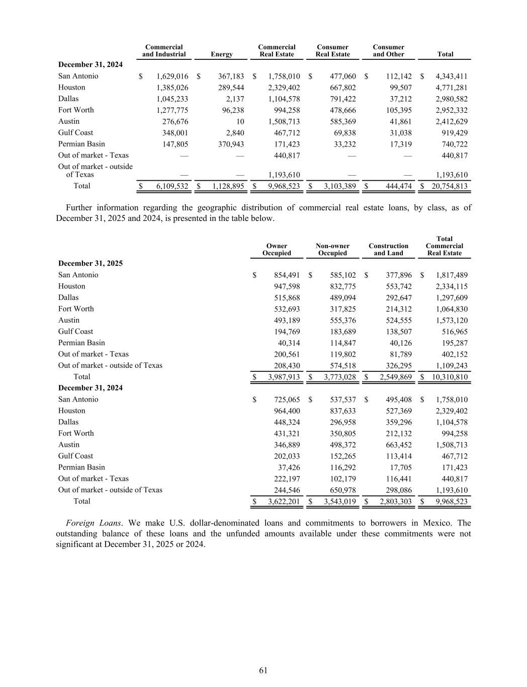 Commercial and Industrial Energy Commercial Real Estate Consumer Real Estate Consumer and Other Total December 31, 2024 San Antonio $ 1,629,016 $ 367,183 $ 1,758,010 $ 477,060 $ 112,142 $ 4,343,411 Houston 1,385,026 289,544 2,329,402 667,802 99,507 4,771,281 Dallas 1,045,233 2,137 1,104,578 791,422 37,212 2,980,582 Fort Worth 1,277,775 96,238 994,258 478,666 105,395 2,952,332 Austin 276,676 10 1,508,713 585,369 41,861 2,412,629 Gulf Coast 348,001 2,840 467,712 69,838 31,038 919,429 Permian Basin 147,805 370,943 171,423 33,232 17,319 740,722 Out of market - Texas — — 440,817 — — 440,817 Out of market - outside of Texas — — 1,193,610 — — 1,193,610 Total $ 6,109,532 $ 1,128,895 $ 9,968,523 $ 3,103,389 $ 444,474 $ 20,754,813 Further information regarding the geographic distribution of commercial real estate loans, by class, as of December 31, 2025 and 2024, is presented in the table below. Owner Occupied Non-owner Occupied Construction and Land Total Commercial Real Estate December 31, 2025 San Antonio $ 854,491 $ 585,102 $ 377,896 $ 1,817,489 Houston 947,598 832,775 553,742 2,334,115 Dallas 515,868 489,094 292,647 1,297,609 Fort Worth 532,693 317,825 214,312 1,064,830 Austin 493,189 555,376 524,555 1,573,120 Gulf Coast 194,769 183,689 138,507 516,965 Permian Basin 40,314 114,847 40,126 195,287 Out of market - Texas 200,561 119,802 81,789 402,152 Out of market - outside of Texas 208,430 574,518 326,295 1,109,243 Total $ 3,987,913 $ 3,773,028 $ 2,549,869 $ 10,310,810 December 31, 2024 San Antonio $ 725,065 $ 537,537 $ 495,408 $ 1,758,010 Houston 964,400 837,633 527,369 2,329,402 Dallas 448,324 296,958 359,296 1,104,578 Fort Worth 431,321 350,805 212,132 994,258 Austin 346,889 498,372 663,452 1,508,713 Gulf Coast 202,033 152,265 113,414 467,712 Permian Basin 37,426 116,292 17,705 171,423 Out of market - Texas 222,197 102,179 116,441 440,817 Out of market - outside of Texas 244,546 650,978 298,086 1,193,610 Total $ 3,622,201 0 $ 3,543,019 $ 2,803,303 $ 9,968,523 Foreign Loans. We make U.S. dollar-denominated loans and commitments to borrowers in Mexico. The outstanding balance of these loans and the unfunded amounts available under these commitments were not significant at December 31, 2025 or 2024. 61