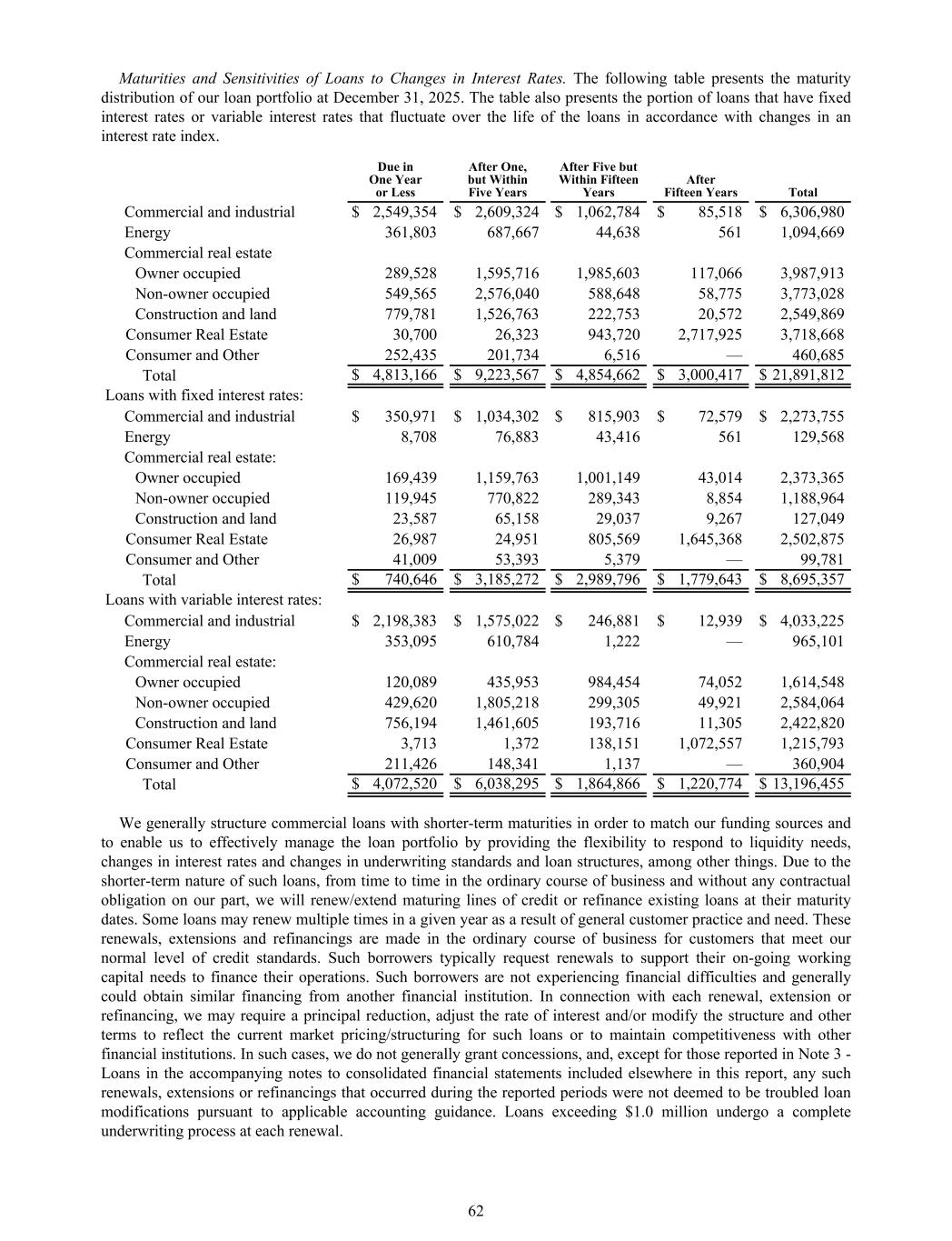 Maturities and Sensitivities of Loans to Changes in Interest Rates. The following table presents the maturity distribution of our loan portfolio at December 31, 2025. The table also presents the portion of loans that have fixed interest rates or variable interest rates that fluctuate over the life of the loans in accordance with changes in an interest rate index. Due in One Year or Less After One, but Within Five Years After Five but Within Fifteen Years After Fifteen Years Total Commercial and industrial $ 2,549,354 $ 2,609,324 $ 1,062,784 $ 85,518 $ 6,306,980 Energy 361,803 687,667 44,638 561 1,094,669 Commercial real estate Owner occupied 289,528 1,595,716 1,985,603 117,066 3,987,913 Non-owner occupied 549,565 2,576,040 588,648 58,775 3,773,028 Construction and land 779,781 1,526,763 222,753 20,572 2,549,869 Consumer Real Estate 30,700 26,323 943,720 2,717,925 3,718,668 Consumer and Other 252,435 201,734 6,516 — 460,685 Total $ 4,813,166 $ 9,223,567 $ 4,854,662 $ 3,000,417 $ 21,891,812 Loans with fixed interest rates: Commercial and industrial $ 350,971 $ 1,034,302 $ 815,903 $ 72,579 $ 2,273,755 Energy 8,708 76,883 43,416 561 129,568 Commercial real estate: Owner occupied 169,439 1,159,763 1,001,149 43,014 2,373,365 Non-owner occupied 119,945 770,822 289,343 8,854 1,188,964 Construction and land 23,587 65,158 29,037 9,267 127,049 Consumer Real Estate 26,987 24,951 805,569 1,645,368 2,502,875 Consumer and Other 41,009 53,393 5,379 — 99,781 Total $ 740,646 $ 3,185,272 $ 2,989,796 $ 1,779,643 $ 8,695,357 Loans with variable interest rates: Commercial and industrial $ 2,198,383 $ 1,575,022 $ 246,881 $ 12,939 $ 4,033,225 Energy 353,095 610,784 1,222 — 965,101 Commercial real estate: Owner occupied 120,089 435,953 984,454 74,052 1,614,548 Non-owner occupied 429,620 1,805,218 299,305 49,921 2,584,064 Construction and land 756,194 1,461,605 193,716 11,305 2,422,820 Consumer Real Estate 3,713 1,372 138,151 1,072,557 1,215,793 Consumer and Other 211,426 148,341 1,137 — 360,904 Total $ 4,072,520 $ 6,038,295 $ 1,864,866 $ 1,220,774 $ 13,196,455 We generally structure commercial loans with shorter-term maturities in order to match our funding sources and to enable us to effectively manage the loan portfolio by providing the flexibility to respond to liquidity needs, changes in interest rates and changes in underwriting standards and loan structures, among other things. Due to the shorter-term nature of such loans, from time to time in the ordinary course of business and without any contractual obligation on our part, we will renew/extend maturing lines of credit or refinance existing loans at their maturity dates. Some loans may renew multiple times in a given year as a result of general customer practice and need. These renewals, extensions and refinancings are made in the ordinary course of business for customers that meet our normal level of credit standards. Such borrowers typically request renewals to support their on-going working capital needs to finance their operations. Such borrowers are not experiencing financial difficulties and generally could obtain similar financing from another financial institution. In connection with each renewal, extension or refinancing, we may require a principal reduction, adjust the rate of interest and/or modify the structure and other terms to reflect the current market pricing/structuring for such loans or to maintain competitiveness with other financial institutions. In such cases, we do not generally grant concessions, and, except for those reported in Note 3 - Loans in the accompanying notes to consolidated financial statements included elsewhere in this report, any such renewals, extensions or refinancings that occurred during the reported periods were not deemed to be troubled loan modifications pursuant to applicable accounting guidance. Loans exceeding $1.0 million undergo a complete underwriting process at each renewal. 62