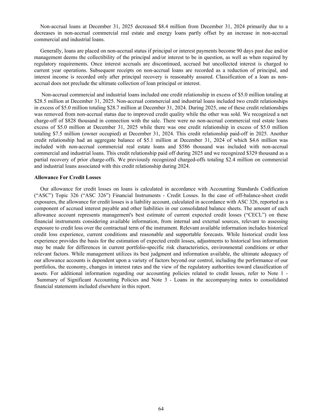 Non-accrual loans at December 31, 2025 decreased $8.4 million from December 31, 2024 primarily due to a decreases in non-accrual commercial real estate and energy loans partly offset by an increase in non-accrual commercial and industrial loans. Generally, loans are placed on non-accrual status if principal or interest payments become 90 days past due and/or management deems the collectibility of the principal and/or interest to be in question, as well as when required by regulatory requirements. Once interest accruals are discontinued, accrued but uncollected interest is charged to current year operations. Subsequent receipts on non-accrual loans are recorded as a reduction of principal, and interest income is recorded only after principal recovery is reasonably assured. Classification of a loan as non- accrual does not preclude the ultimate collection of loan principal or interest. Non-accrual commercial and industrial loans included one credit relationship in excess of $5.0 million totaling at $28.5 million at December 31, 2025. Non-accrual commercial and industrial loans included two credit relationships in excess of $5.0 million totaling $28.7 million at December 31, 2024. During 2025, one of these credit relationships was removed from non-accrual status due to improved credit quality while the other was sold. We recognized a net charge-off of $828 thousand in connection with the sale. There were no non-accrual commercial real estate loans excess of $5.0 million at December 31, 2025 while there was one credit relationship in excess of $5.0 million totaling $7.5 million (owner occupied) at December 31, 2024. This credit relationship paid-off in 2025. Another credit relationship had an aggregate balance of $5.1 million at December 31, 2024 of which $4.6 million was included with non-accrual commercial real estate loans and $586 thousand was included with non-accrual commercial and industrial loans. This credit relationship paid off during 2025 and we recognized $329 thousand as a partial recovery of prior charge-offs. We previously recognized charged-offs totaling $2.4 million on commercial and industrial loans associated with this credit relationship during 2024. Allowance For Credit Losses Our allowance for credit losses on loans is calculated in accordance with Accounting Standards Codification (“ASC”) Topic 326 (“ASC 326”) Financial Instruments - Credit Losses. In the case of off-balance-sheet credit exposures, the allowance for credit losses is a liability account, calculated in accordance with ASC 326, reported as a component of accrued interest payable and other liabilities in our consolidated balance sheets. The amount of each allowance account represents management's best estimate of current expected credit losses (“CECL”) on these financial instruments considering available information, from internal and external sources, relevant to assessing exposure to credit loss over the contractual term of the instrument. Relevant available information includes historical credit loss experience, current conditions and reasonable and supportable forecasts. While historical credit loss experience provides the basis for the estimation of expected credit losses, adjustments to historical loss information may be made for differences in current portfolio-specific risk characteristics, environmental conditions or other relevant factors. While management utilizes its best judgment and information available, the ultimate adequacy of our allowance accounts is dependent upon a variety of factors beyond our control, including the performance of our portfolios, the economy, changes in interest rates and the view of the regulatory authorities toward classification of assets. For additional information regarding our accounting policies related to credit losses, refer to Note 1 - Summary of Significant Accounting Policies and Note 3 - Loans in the accompanying notes to consolidated financial statements included elsewhere in this report. 64