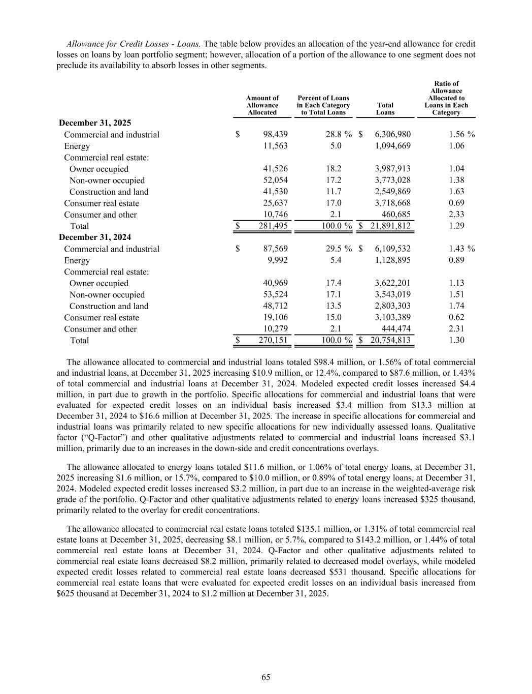 Allowance for Credit Losses - Loans. The table below provides an allocation of the year-end allowance for credit losses on loans by loan portfolio segment; however, allocation of a portion of the allowance to one segment does not preclude its availability to absorb losses in other segments. Amount of Allowance Allocated Percent of Loans in Each Category to Total Loans Total Loans Ratio of Allowance Allocated to Loans in Each Category December 31, 2025 Commercial and industrial $ 98,439 28.8 % $ 6,306,980 1.56 % Energy 11,563 5.0 1,094,669 1.06 Commercial real estate: Owner occupied 41,526 18.2 3,987,913 1.04 Non-owner occupied 52,054 17.2 3,773,028 1.38 Construction and land 41,530 11.7 2,549,869 1.63 Consumer real estate 25,637 17.0 3,718,668 0.69 Consumer and other 10,746 2.1 460,685 2.33 Total $ 281,495 100.0 % $ 21,891,812 1.29 December 31, 2024 Commercial and industrial $ 87,569 29.5 % $ 6,109,532 1.43 % Energy 9,992 5.4 1,128,895 0.89 Commercial real estate: Owner occupied 40,969 17.4 3,622,201 1.13 Non-owner occupied 53,524 17.1 3,543,019 1.51 Construction and land 48,712 13.5 2,803,303 1.74 Consumer real estate 19,106 15.0 3,103,389 0.62 Consumer and other 10,279 2.1 444,474 2.31 Total $ 270,151 100.0 % $ 20,754,813 1.30 The allowance allocated to commercial and industrial loans totaled $98.4 million, or 1.56% of total commercial and industrial loans, at December 31, 2025 increasing $10.9 million, or 12.4%, compared to $87.6 million, or 1.43% of total commercial and industrial loans at December 31, 2024. Modeled expected credit losses increased $4.4 million, in part due to growth in the portfolio. Specific allocations for commercial and industrial loans that were evaluated for expected credit losses on an individual basis increased $3.4 million from $13.3 million at December 31, 2024 to $16.6 million at December 31, 2025. The increase in specific allocations for commercial and industrial loans was primarily related to new specific allocations for new individually assessed loans. Qualitative factor (“Q-Factor”) and other qualitative adjustments related to commercial and industrial loans increased $3.1 million, primarily due to an increases in the down-side and credit concentrations overlays. The allowance allocated to energy loans totaled $11.6 million, or 1.06% of total energy loans, at December 31, 2025 increasing $1.6 million, or 15.7%, compared to $10.0 million, or 0.89% of total energy loans, at December 31, 2024. Modeled expected credit losses increased $3.2 million, in part due to an increase in the weighted-average risk grade of the portfolio. Q-Factor and other qualitative adjustments related to energy loans increased $325 thousand, primarily related to the overlay for credit concentrations. The allowance allocated to commercial real estate loans totaled $135.1 million, or 1.31% of total commercial real estate loans at December 31, 2025, decreasing $8.1 million, or 5.7%, compared to $143.2 million, or 1.44% of total commercial real estate loans at December 31, 2024. Q-Factor and other qualitative adjustments related to commercial real estate loans decreased $8.2 million, primarily related to decreased model overlays, while modeled expected credit losses related to commercial real estate loans decreased $531 thousand. Specific allocations for commercial real estate loans that were evaluated for expected credit losses on an individual basis increased from $625 thousand at December 31, 2024 to $1.2 million at December 31, 2025. 65
