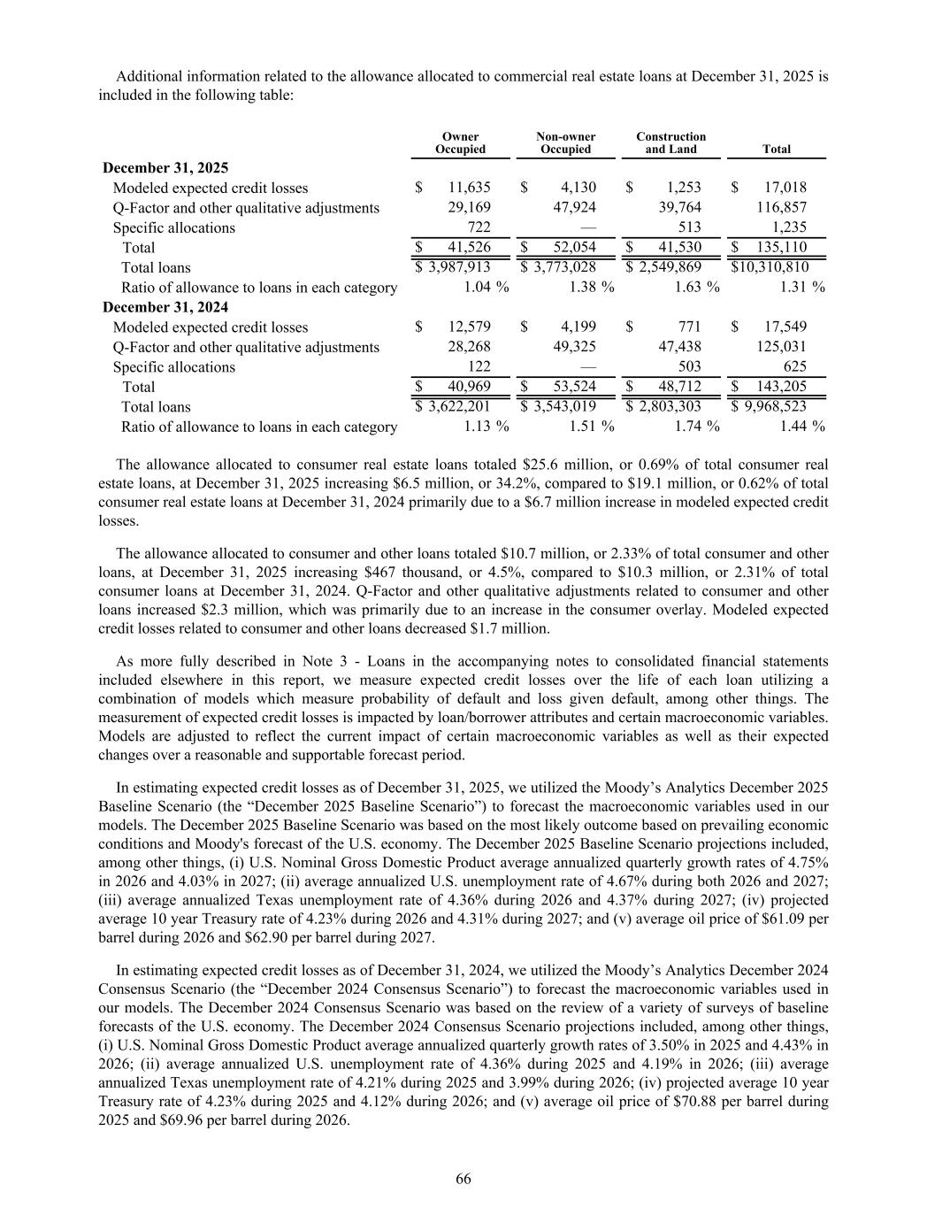 Additional information related to the allowance allocated to commercial real estate loans at December 31, 2025 is included in the following table: Owner Occupied Non-owner Occupied Construction and Land Total December 31, 2025 Modeled expected credit losses $ 11,635 $ 4,130 $ 1,253 $ 17,018 Q-Factor and other qualitative adjustments 29,169 47,924 39,764 116,857 Specific allocations 722 — 513 1,235 Total $ 41,526 $ 52,054 $ 41,530 $ 135,110 Total loans $ 3,987,913 $ 3,773,028 $ 2,549,869 $10,310,810 Ratio of allowance to loans in each category 1.04 % 1.38 % 1.63 % 1.31 % December 31, 2024 Modeled expected credit losses $ 12,579 $ 4,199 $ 771 $ 17,549 Q-Factor and other qualitative adjustments 28,268 49,325 47,438 125,031 Specific allocations 122 — 503 625 Total $ 40,969 $ 53,524 $ 48,712 $ 143,205 Total loans $ 3,622,201 $ 3,543,019 $ 2,803,303 $ 9,968,523 Ratio of allowance to loans in each category 1.13 % 1.51 % 1.74 % 1.44 % The allowance allocated to consumer real estate loans totaled $25.6 million, or 0.69% of total consumer real estate loans, at December 31, 2025 increasing $6.5 million, or 34.2%, compared to $19.1 million, or 0.62% of total consumer real estate loans at December 31, 2024 primarily due to a $6.7 million increase in modeled expected credit losses. The allowance allocated to consumer and other loans totaled $10.7 million, or 2.33% of total consumer and other loans, at December 31, 2025 increasing $467 thousand, or 4.5%, compared to $10.3 million, or 2.31% of total consumer loans at December 31, 2024. Q-Factor and other qualitative adjustments related to consumer and other loans increased $2.3 million, which was primarily due to an increase in the consumer overlay. Modeled expected credit losses related to consumer and other loans decreased $1.7 million. As more fully described in Note 3 - Loans in the accompanying notes to consolidated financial statements included elsewhere in this report, we measure expected credit losses over the life of each loan utilizing a combination of models which measure probability of default and loss given default, among other things. The measurement of expected credit losses is impacted by loan/borrower attributes and certain macroeconomic variables. Models are adjusted to reflect the current impact of certain macroeconomic variables as well as their expected changes over a reasonable and supportable forecast period. In estimating expected credit losses as of December 31, 2025, we utilized the Moody’s Analytics December 2025 Baseline Scenario (the “December 2025 Baseline Scenario”) to forecast the macroeconomic variables used in our models. The December 2025 Baseline Scenario was based on the most likely outcome based on prevailing economic conditions and Moody's forecast of the U.S. economy. The December 2025 Baseline Scenario projections included, among other things, (i) U.S. Nominal Gross Domestic Product average annualized quarterly growth rates of 4.75% in 2026 and 4.03% in 2027; (ii) average annualized U.S. unemployment rate of 4.67% during both 2026 and 2027; (iii) average annualized Texas unemployment rate of 4.36% during 2026 and 4.37% during 2027; (iv) projected average 10 year Treasury rate of 4.23% during 2026 and 4.31% during 2027; and (v) average oil price of $61.09 per barrel during 2026 and $62.90 per barrel during 2027. In estimating expected credit losses as of December 31, 2024, we utilized the Moody’s Analytics December 2024 Consensus Scenario (the “December 2024 Consensus Scenario”) to forecast the macroeconomic variables used in our models. The December 2024 Consensus Scenario was based on the review of a variety of surveys of baseline forecasts of the U.S. economy. The December 2024 Consensus Scenario projections included, among other things, (i) U.S. Nominal Gross Domestic Product average annualized quarterly growth rates of 3.50% in 2025 and 4.43% in 2026; (ii) average annualized U.S. unemployment rate of 4.36% during 2025 and 4.19% in 2026; (iii) average annualized Texas unemployment rate of 4.21% during 2025 and 3.99% during 2026; (iv) projected average 10 year Treasury rate of 4.23% during 2025 and 4.12% during 2026; and (v) average oil price of $70.88 per barrel during 2025 and $69.96 per barrel during 2026. 66
