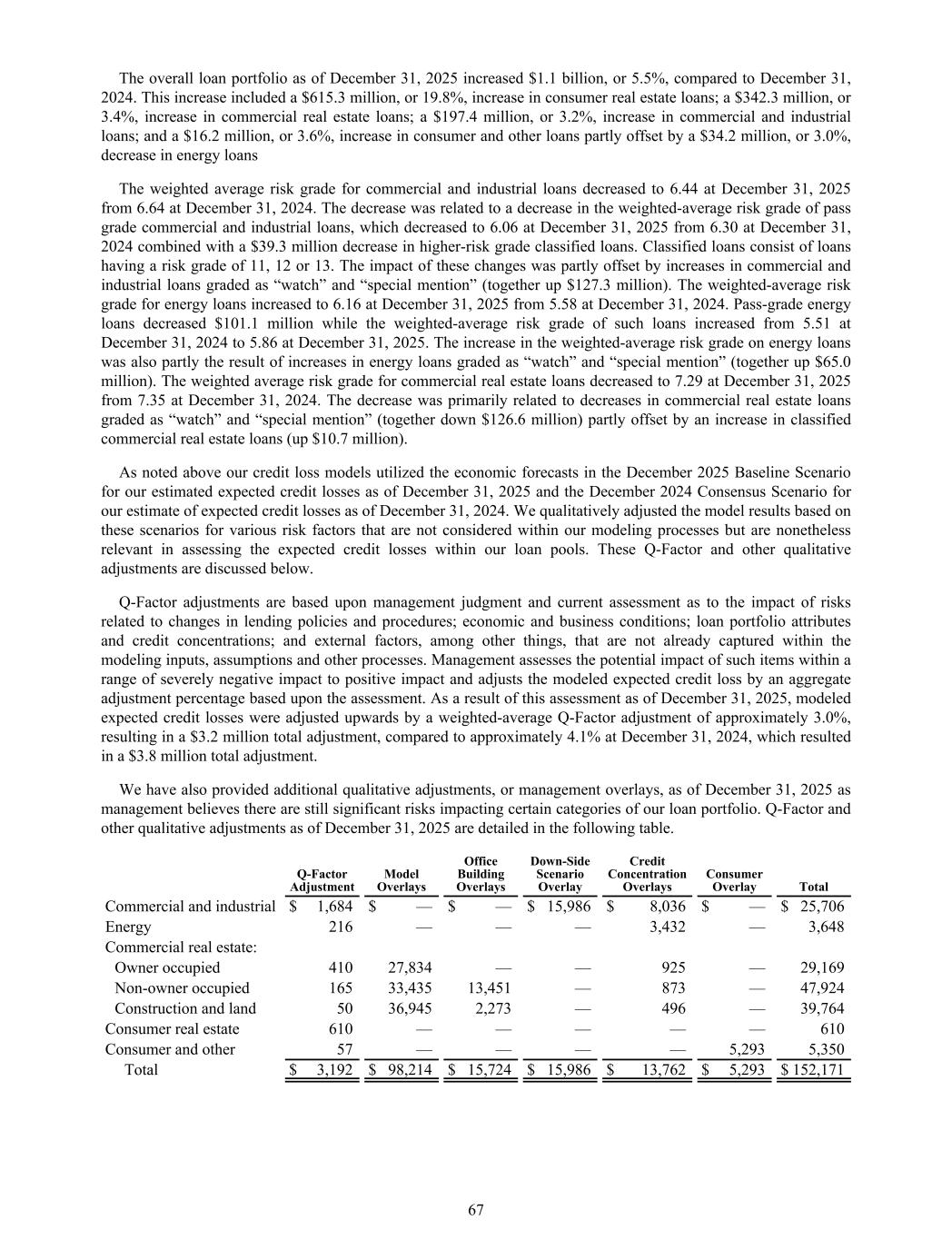 The overall loan portfolio as of December 31, 2025 increased $1.1 billion, or 5.5%, compared to December 31, 2024. This increase included a $615.3 million, or 19.8%, increase in consumer real estate loans; a $342.3 million, or 3.4%, increase in commercial real estate loans; a $197.4 million, or 3.2%, increase in commercial and industrial loans; and a $16.2 million, or 3.6%, increase in consumer and other loans partly offset by a $34.2 million, or 3.0%, decrease in energy loans The weighted average risk grade for commercial and industrial loans decreased to 6.44 at December 31, 2025 from 6.64 at December 31, 2024. The decrease was related to a decrease in the weighted-average risk grade of pass grade commercial and industrial loans, which decreased to 6.06 at December 31, 2025 from 6.30 at December 31, 2024 combined with a $39.3 million decrease in higher-risk grade classified loans. Classified loans consist of loans having a risk grade of 11, 12 or 13. The impact of these changes was partly offset by increases in commercial and industrial loans graded as “watch” and “special mention” (together up $127.3 million). The weighted-average risk grade for energy loans increased to 6.16 at December 31, 2025 from 5.58 at December 31, 2024. Pass-grade energy loans decreased $101.1 million while the weighted-average risk grade of such loans increased from 5.51 at December 31, 2024 to 5.86 at December 31, 2025. The increase in the weighted-average risk grade on energy loans was also partly the result of increases in energy loans graded as “watch” and “special mention” (together up $65.0 million). The weighted average risk grade for commercial real estate loans decreased to 7.29 at December 31, 2025 from 7.35 at December 31, 2024. The decrease was primarily related to decreases in commercial real estate loans graded as “watch” and “special mention” (together down $126.6 million) partly offset by an increase in classified commercial real estate loans (up $10.7 million). As noted above our credit loss models utilized the economic forecasts in the December 2025 Baseline Scenario for our estimated expected credit losses as of December 31, 2025 and the December 2024 Consensus Scenario for our estimate of expected credit losses as of December 31, 2024. We qualitatively adjusted the model results based on these scenarios for various risk factors that are not considered within our modeling processes but are nonetheless relevant in assessing the expected credit losses within our loan pools. These Q-Factor and other qualitative adjustments are discussed below. Q-Factor adjustments are based upon management judgment and current assessment as to the impact of risks related to changes in lending policies and procedures; economic and business conditions; loan portfolio attributes and credit concentrations; and external factors, among other things, that are not already captured within the modeling inputs, assumptions and other processes. Management assesses the potential impact of such items within a range of severely negative impact to positive impact and adjusts the modeled expected credit loss by an aggregate adjustment percentage based upon the assessment. As a result of this assessment as of December 31, 2025, modeled expected credit losses were adjusted upwards by a weighted-average Q-Factor adjustment of approximately 3.0%, resulting in a $3.2 million total adjustment, compared to approximately 4.1% at December 31, 2024, which resulted in a $3.8 million total adjustment. We have also provided additional qualitative adjustments, or management overlays, as of December 31, 2025 as management believes there are still significant risks impacting certain categories of our loan portfolio. Q-Factor and other qualitative adjustments as of December 31, 2025 are detailed in the following table. Q-Factor Adjustment Model Overlays Office Building Overlays Down-Side Scenario Overlay Credit Concentration Overlays Consumer Overlay Total Commercial and industrial $ 1,684 $ — $ — $ 15,986 $ 8,036 $ — $ 25,706 Energy 216 — — — 3,432 — 3,648 Commercial real estate: Owner occupied 410 27,834 — — 925 — 29,169 Non-owner occupied 165 33,435 13,451 — 873 — 47,924 Construction and land 50 36,945 2,273 — 496 — 39,764 Consumer real estate 610 — — — — — 610 Consumer and other 57 — — — — 5,293 5,350 Total $ 3,192 $ 98,214 $ 15,724 $ 15,986 $ 13,762 $ 5,293 $ 152,171 67