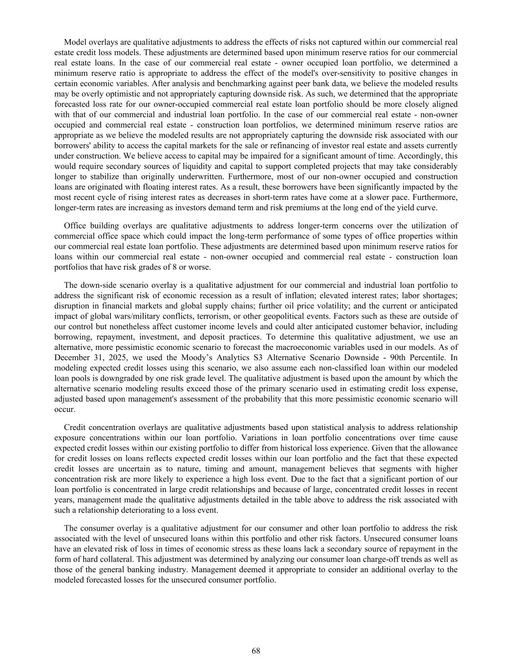 Model overlays are qualitative adjustments to address the effects of risks not captured within our commercial real estate credit loss models. These adjustments are determined based upon minimum reserve ratios for our commercial real estate loans. In the case of our commercial real estate - owner occupied loan portfolio, we determined a minimum reserve ratio is appropriate to address the effect of the model's over-sensitivity to positive changes in certain economic variables. After analysis and benchmarking against peer bank data, we believe the modeled results may be overly optimistic and not appropriately capturing downside risk. As such, we determined that the appropriate forecasted loss rate for our owner-occupied commercial real estate loan portfolio should be more closely aligned with that of our commercial and industrial loan portfolio. In the case of our commercial real estate - non-owner occupied and commercial real estate - construction loan portfolios, we determined minimum reserve ratios are appropriate as we believe the modeled results are not appropriately capturing the downside risk associated with our borrowers' ability to access the capital markets for the sale or refinancing of investor real estate and assets currently under construction. We believe access to capital may be impaired for a significant amount of time. Accordingly, this would require secondary sources of liquidity and capital to support completed projects that may take considerably longer to stabilize than originally underwritten. Furthermore, most of our non-owner occupied and construction loans are originated with floating interest rates. As a result, these borrowers have been significantly impacted by the most recent cycle of rising interest rates as decreases in short-term rates have come at a slower pace. Furthermore, longer-term rates are increasing as investors demand term and risk premiums at the long end of the yield curve. Office building overlays are qualitative adjustments to address longer-term concerns over the utilization of commercial office space which could impact the long-term performance of some types of office properties within our commercial real estate loan portfolio. These adjustments are determined based upon minimum reserve ratios for loans within our commercial real estate - non-owner occupied and commercial real estate - construction loan portfolios that have risk grades of 8 or worse. The down-side scenario overlay is a qualitative adjustment for our commercial and industrial loan portfolio to address the significant risk of economic recession as a result of inflation; elevated interest rates; labor shortages; disruption in financial markets and global supply chains; further oil price volatility; and the current or anticipated impact of global wars/military conflicts, terrorism, or other geopolitical events. Factors such as these are outside of our control but nonetheless affect customer income levels and could alter anticipated customer behavior, including borrowing, repayment, investment, and deposit practices. To determine this qualitative adjustment, we use an alternative, more pessimistic economic scenario to forecast the macroeconomic variables used in our models. As of December 31, 2025, we used the Moody’s Analytics S3 Alternative Scenario Downside - 90th Percentile. In modeling expected credit losses using this scenario, we also assume each non-classified loan within our modeled loan pools is downgraded by one risk grade level. The qualitative adjustment is based upon the amount by which the alternative scenario modeling results exceed those of the primary scenario used in estimating credit loss expense, adjusted based upon management's assessment of the probability that this more pessimistic economic scenario will occur. Credit concentration overlays are qualitative adjustments based upon statistical analysis to address relationship exposure concentrations within our loan portfolio. Variations in loan portfolio concentrations over time cause expected credit losses within our existing portfolio to differ from historical loss experience. Given that the allowance for credit losses on loans reflects expected credit losses within our loan portfolio and the fact that these expected credit losses are uncertain as to nature, timing and amount, management believes that segments with higher concentration risk are more likely to experience a high loss event. Due to the fact that a significant portion of our loan portfolio is concentrated in large credit relationships and because of large, concentrated credit losses in recent years, management made the qualitative adjustments detailed in the table above to address the risk associated with such a relationship deteriorating to a loss event. The consumer overlay is a qualitative adjustment for our consumer and other loan portfolio to address the risk associated with the level of unsecured loans within this portfolio and other risk factors. Unsecured consumer loans have an elevated risk of loss in times of economic stress as these loans lack a secondary source of repayment in the form of hard collateral. This adjustment was determined by analyzing our consumer loan charge-off trends as well as those of the general banking industry. Management deemed it appropriate to consider an additional overlay to the modeled forecasted losses for the unsecured consumer portfolio. 68